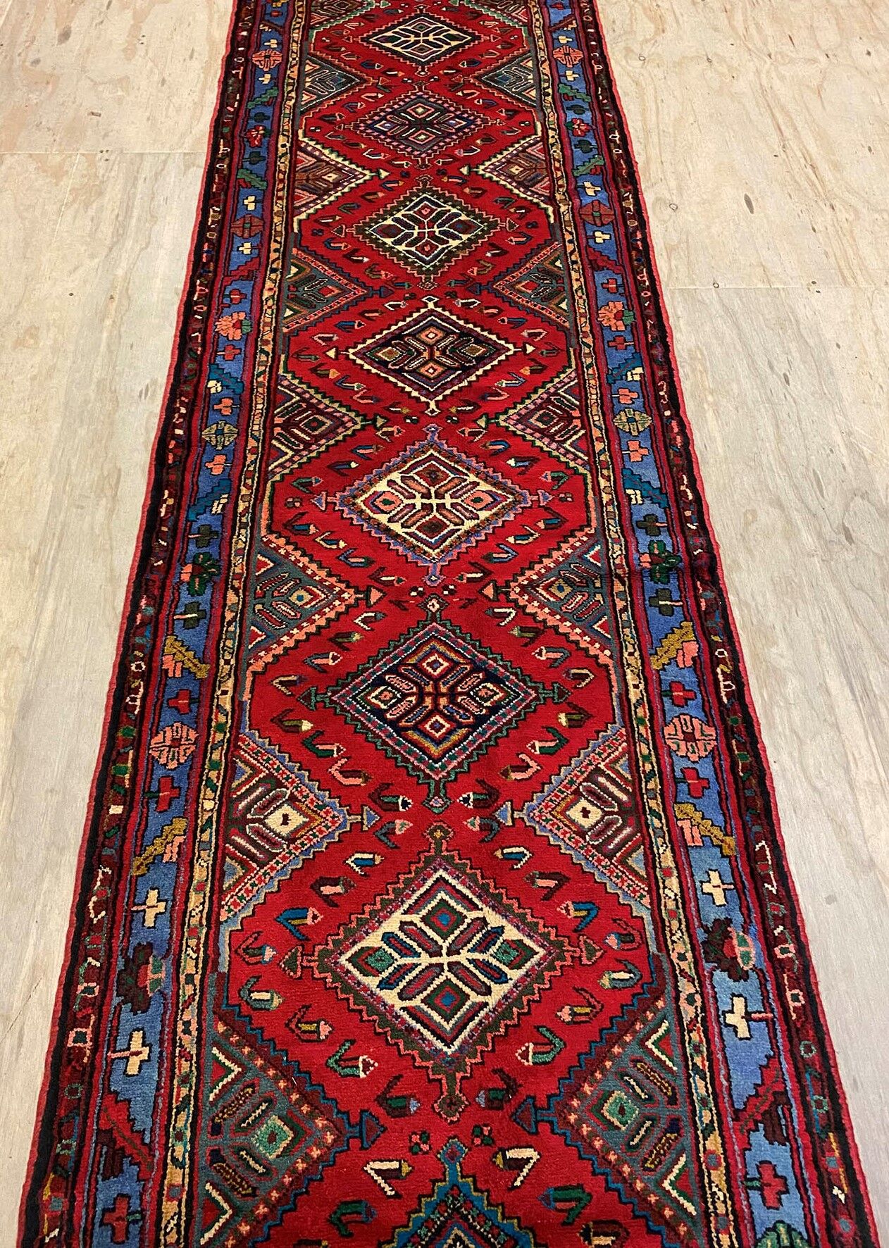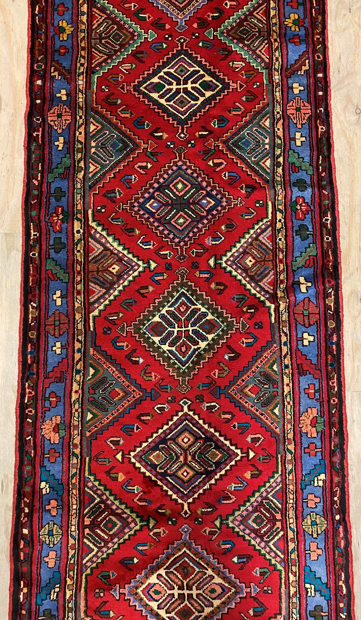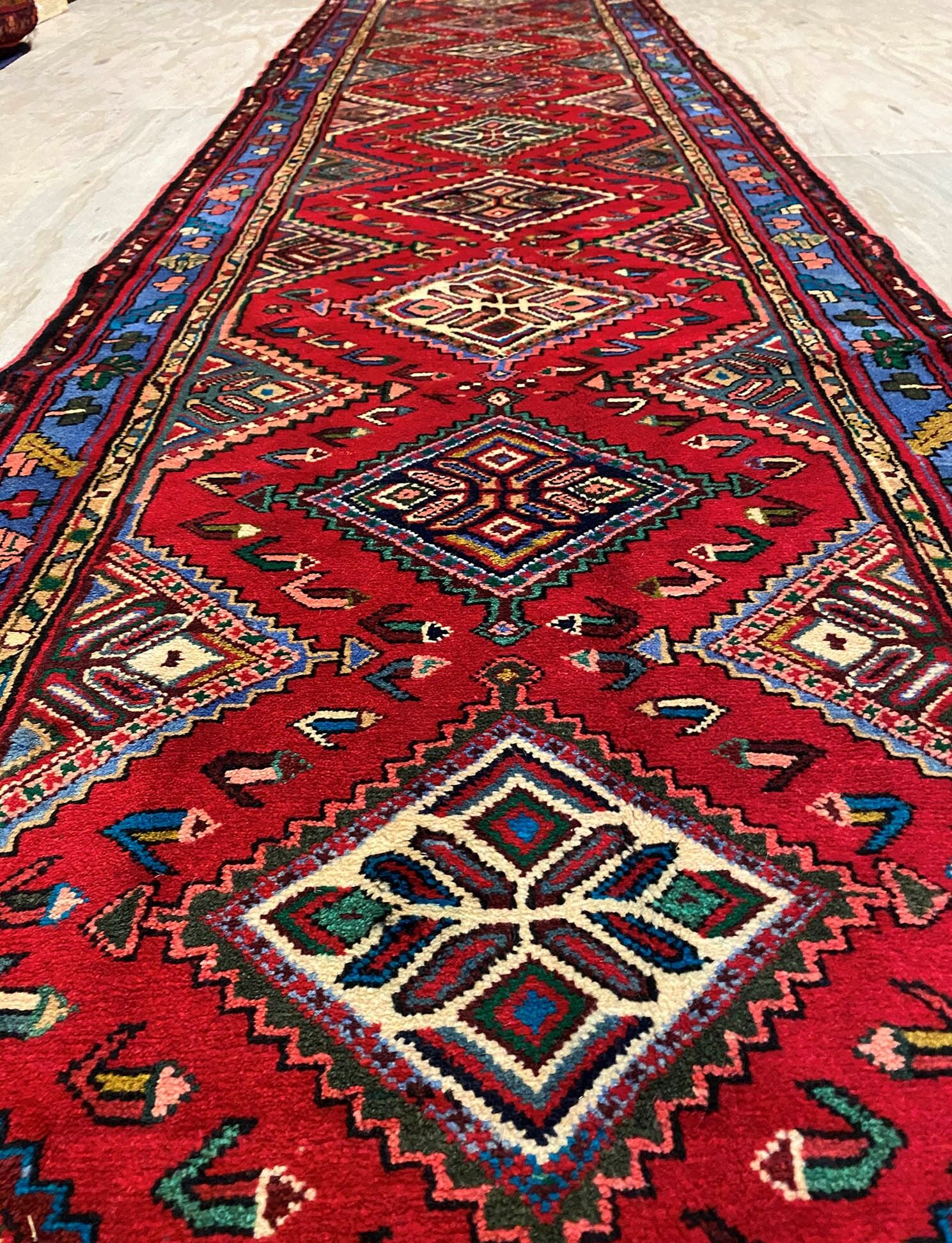 Rare 5m Handmade Village Persian Hamedan Runner. Above All It Is A Very Hard Wearing Runner. Pure Hand Spun Wool Pile On Cotton Base. It Also Has A Deep Indigo Blue Background Dyed Using Traditional Methods.