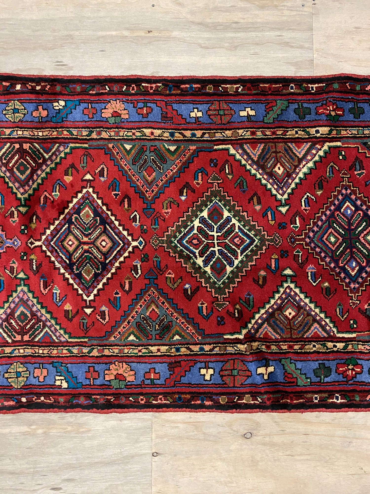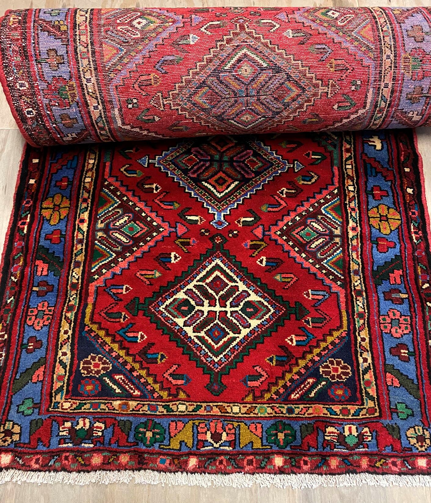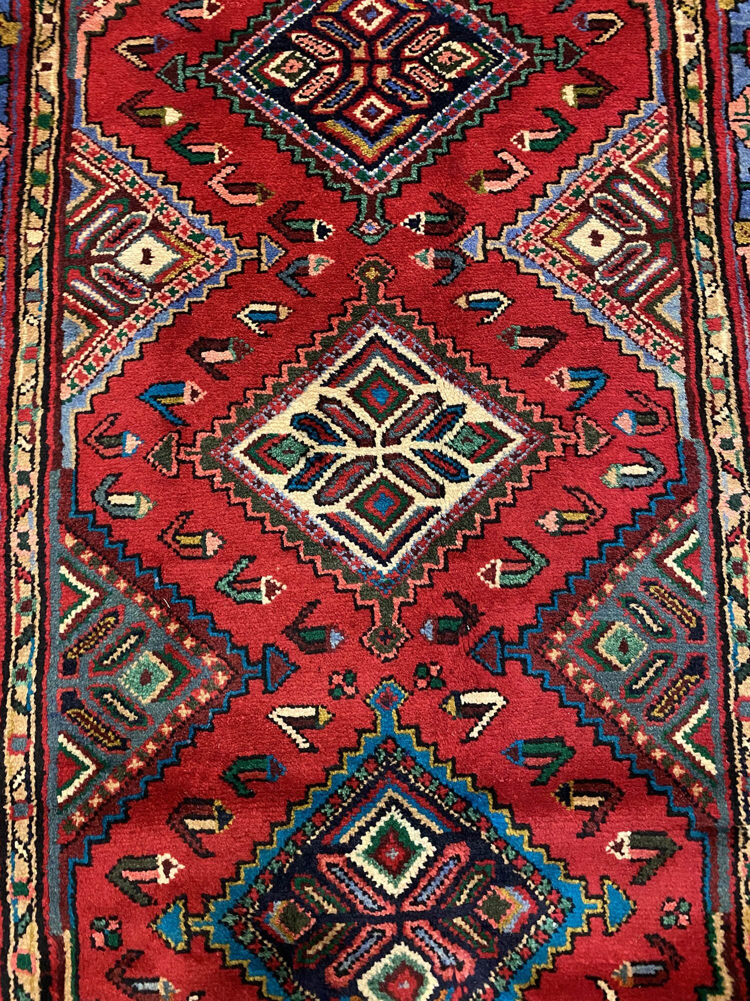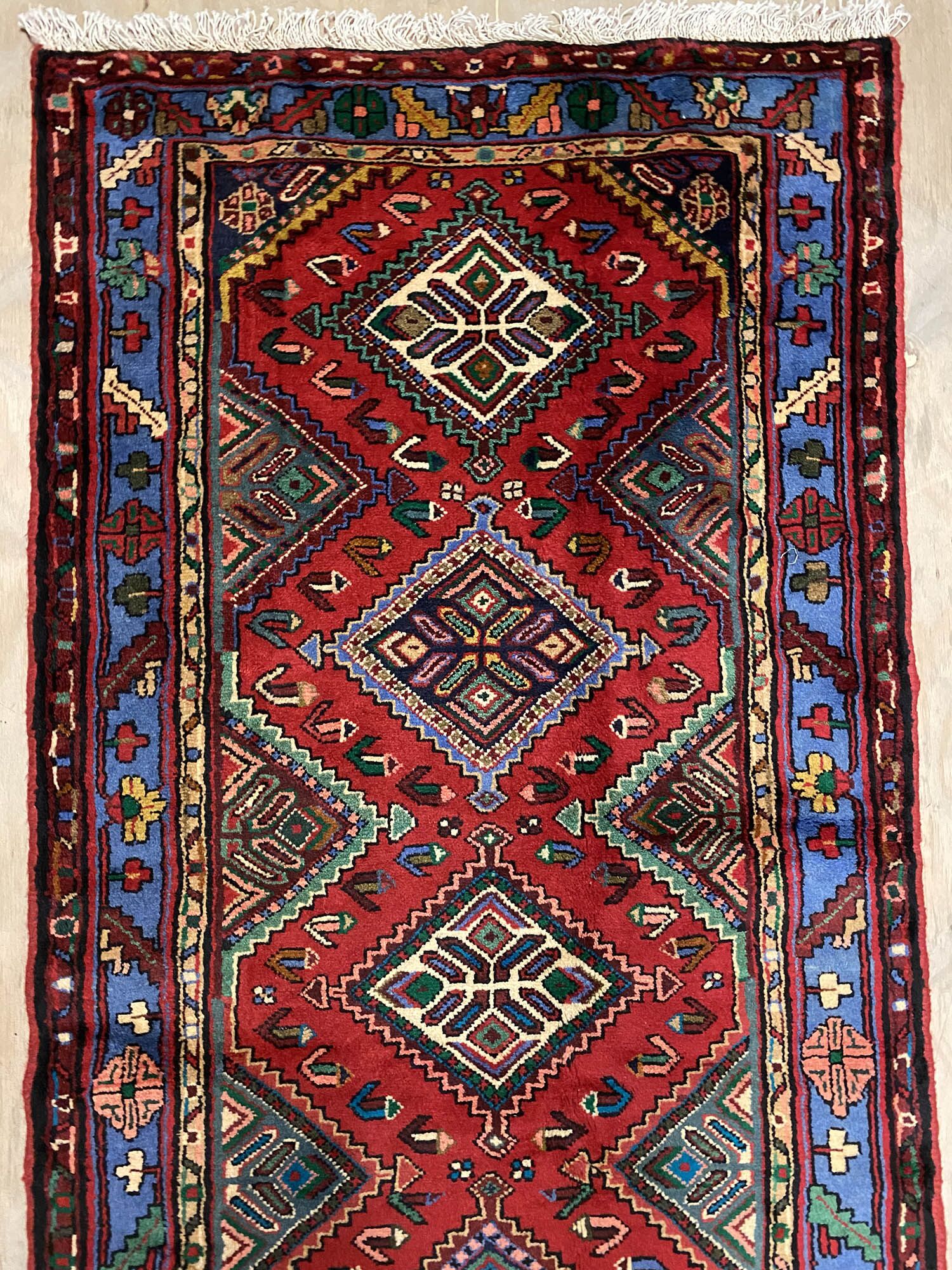 Rare 5m Handmade Village Persian Hamedan Runner. Above All It Is A Very Hard Wearing Runner. Pure Hand Spun Wool Pile On Cotton Base. It Also Has A Deep Indigo Blue Background Dyed Using Traditional Methods.