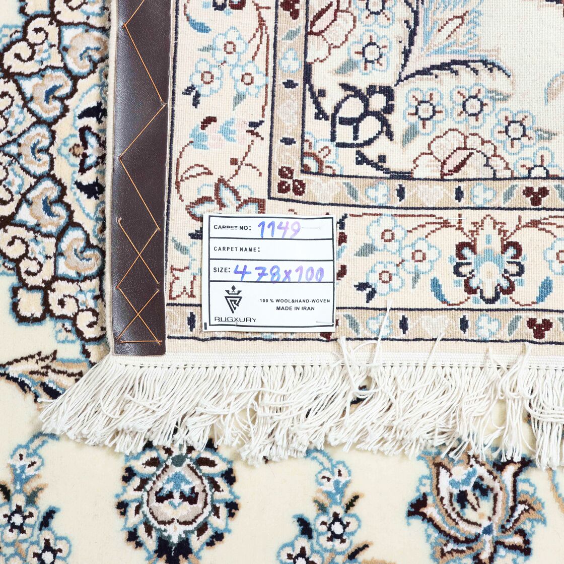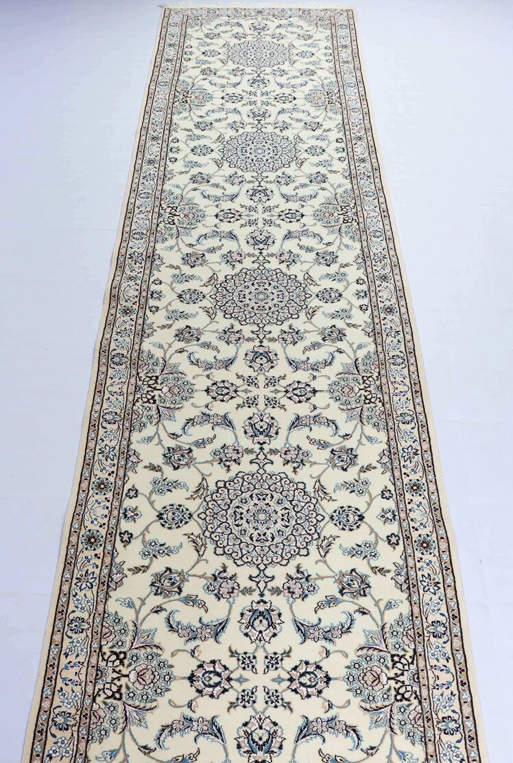 – Fine Elegance: Experience the allure of a fine authentic handmade Persian Nain Hall runner, a rarity over 4.5 meters in length, with pure lamb’s wool pile on a cotton base, featuring beige and blue tones dyed using traditional methods.