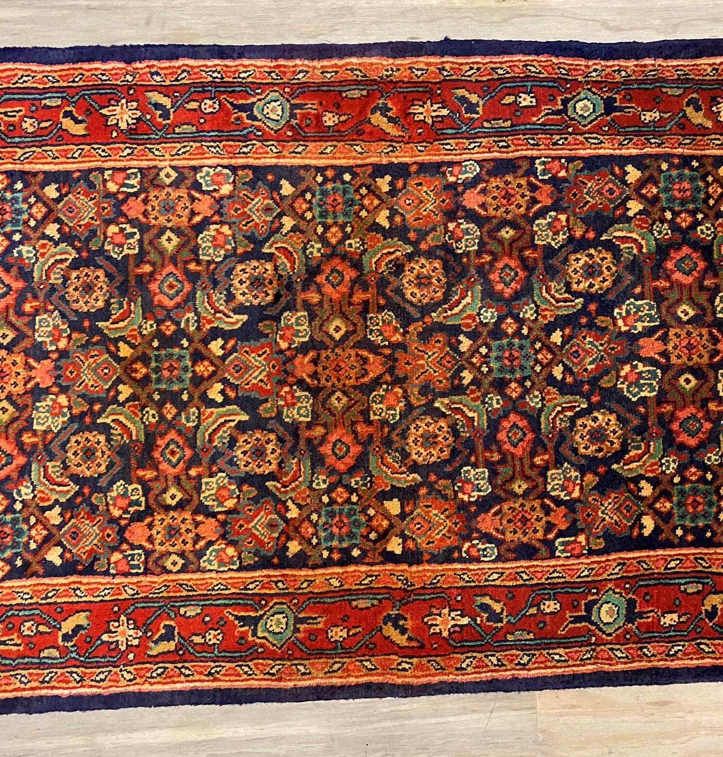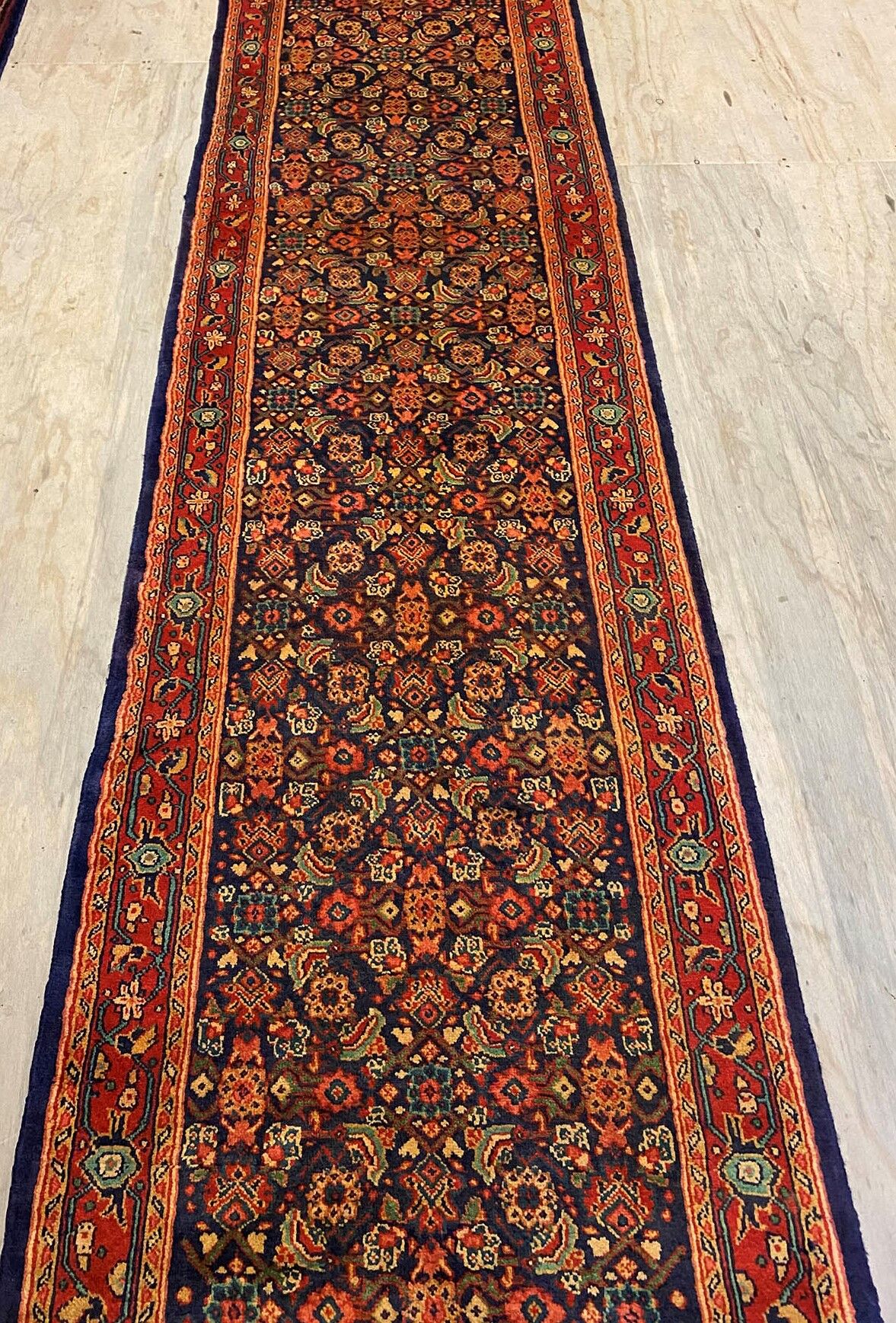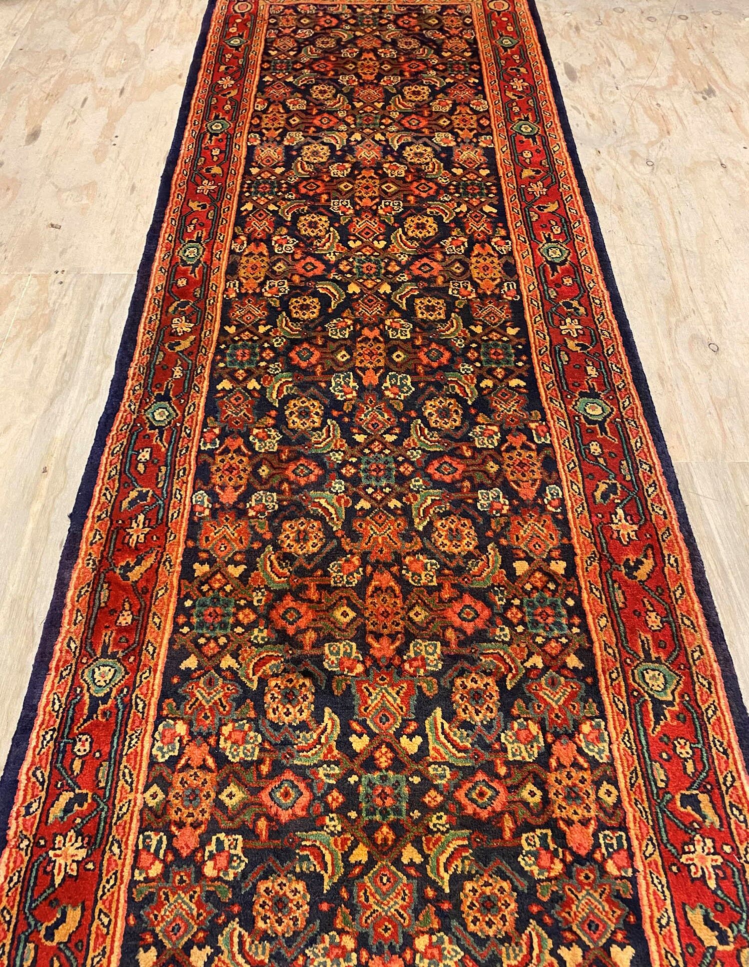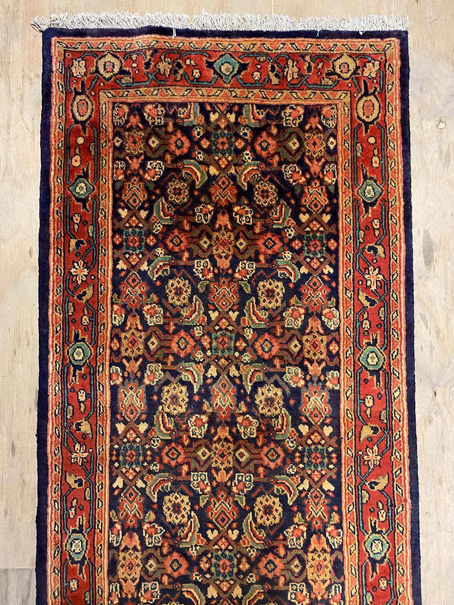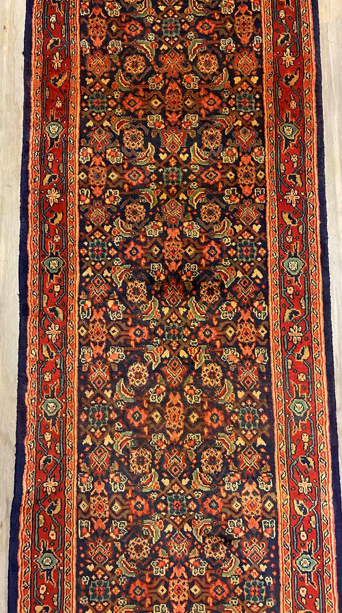 Rare 4m Handmade Village Persian Hamedan Runner. Above All It Is A Very Hard Wearing Runner. Pure Hand Spun Wool Pile On Cotton Base. It Also Has A Deep Indigo Blue Background Dyed Using Traditional Methods.