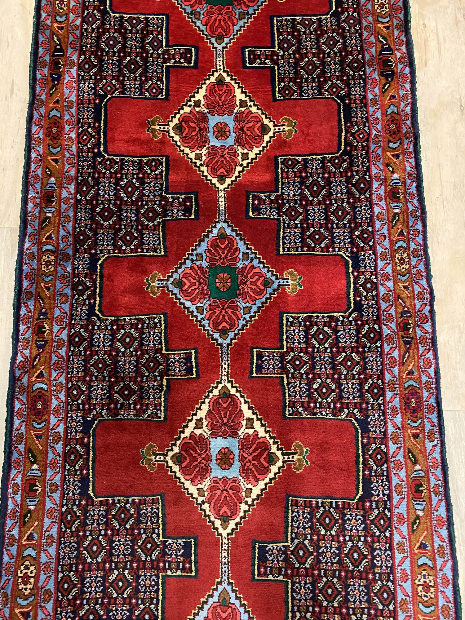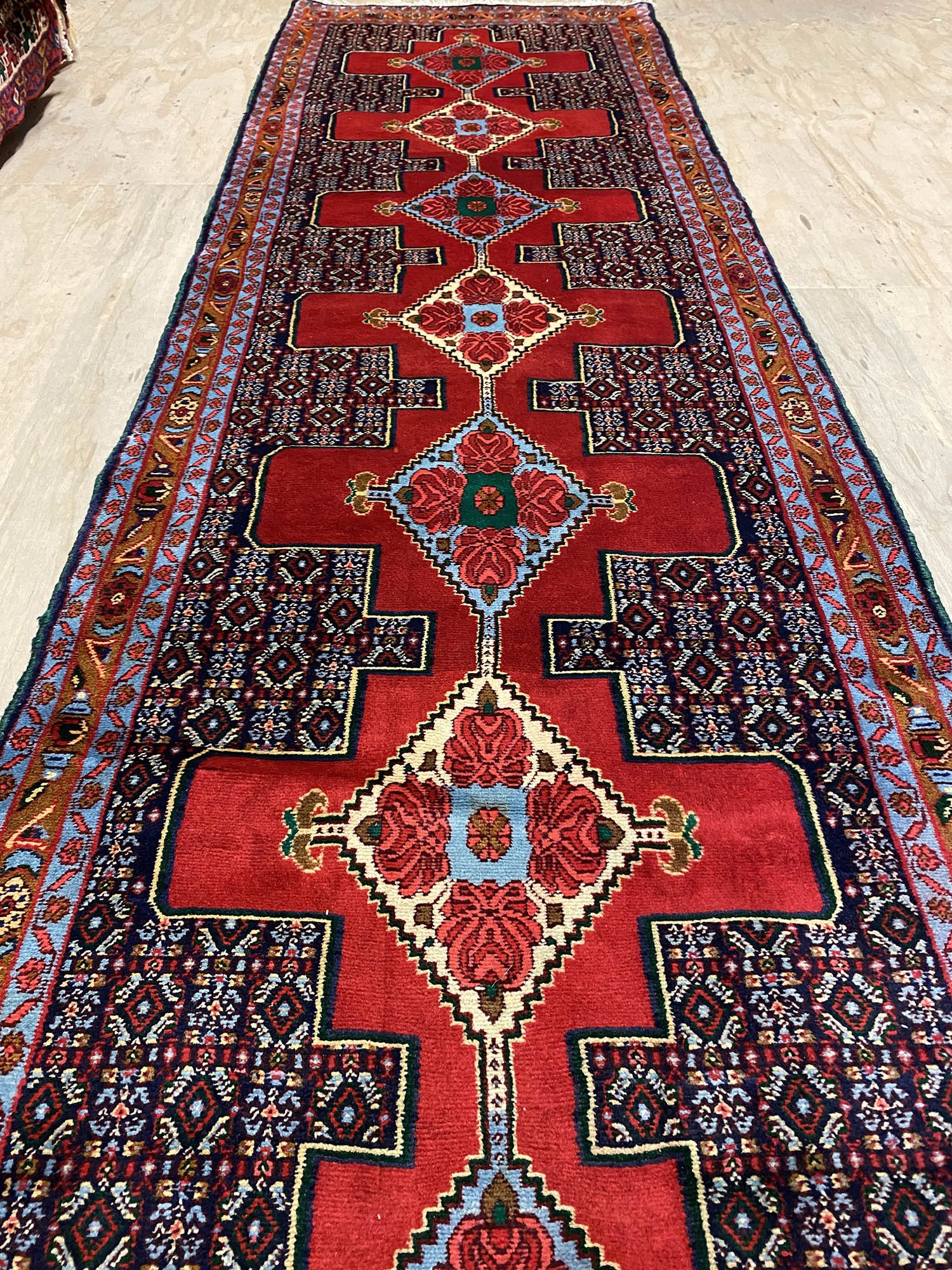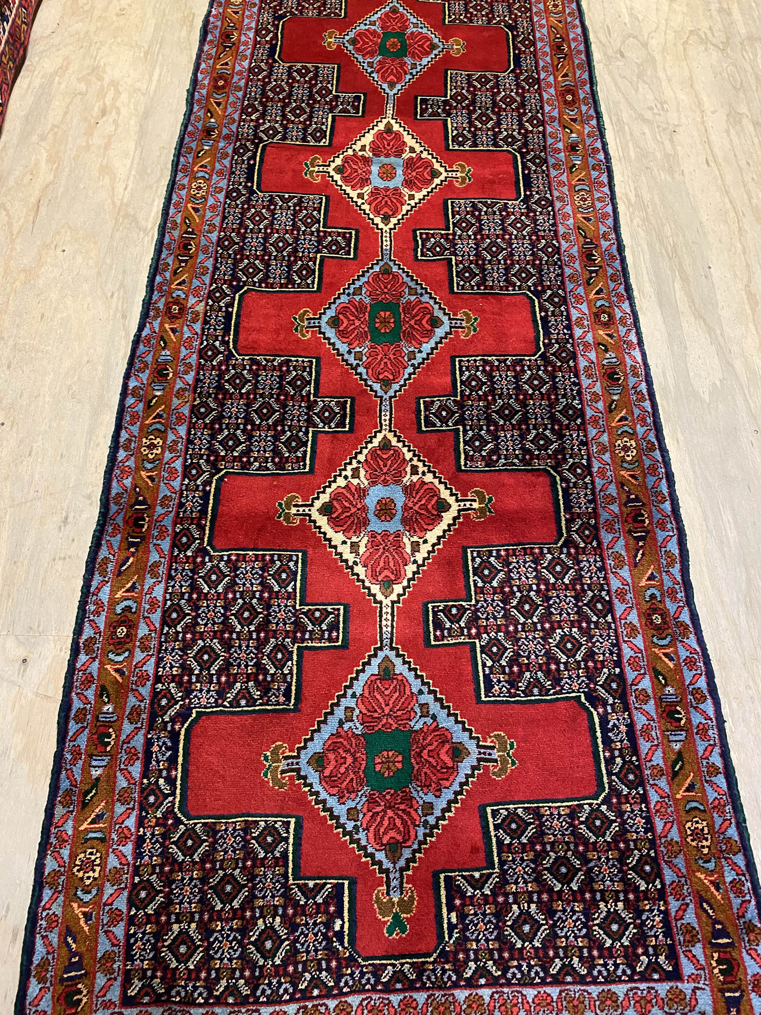 – Origin: Explore the rarity of this 4m hand-knotted Persian Senneh Bijar runner, celebrated for its originality and quality, woven in Sanandaj, a Kurdish province in West Persia.