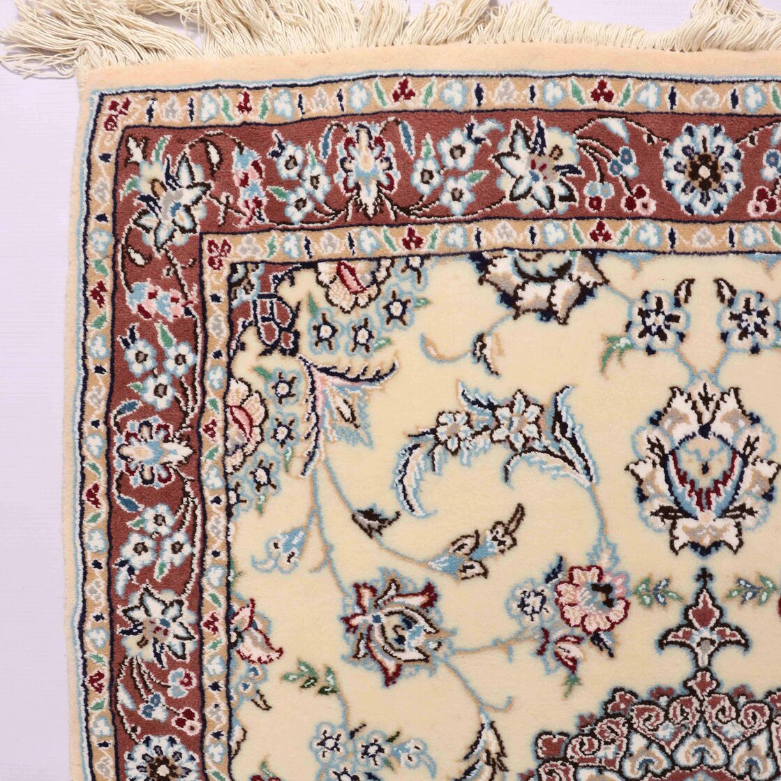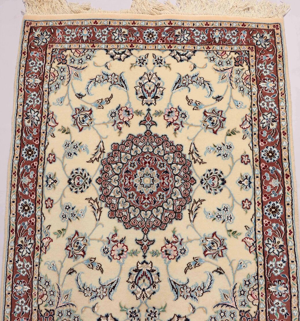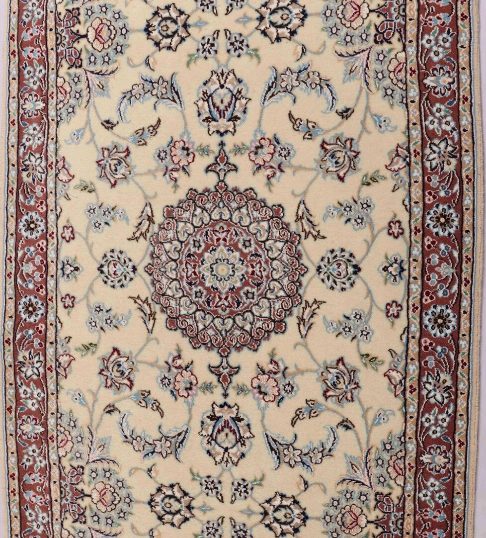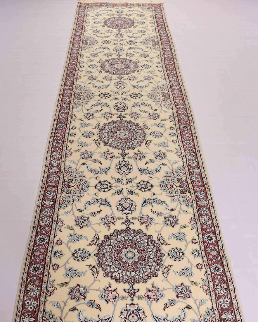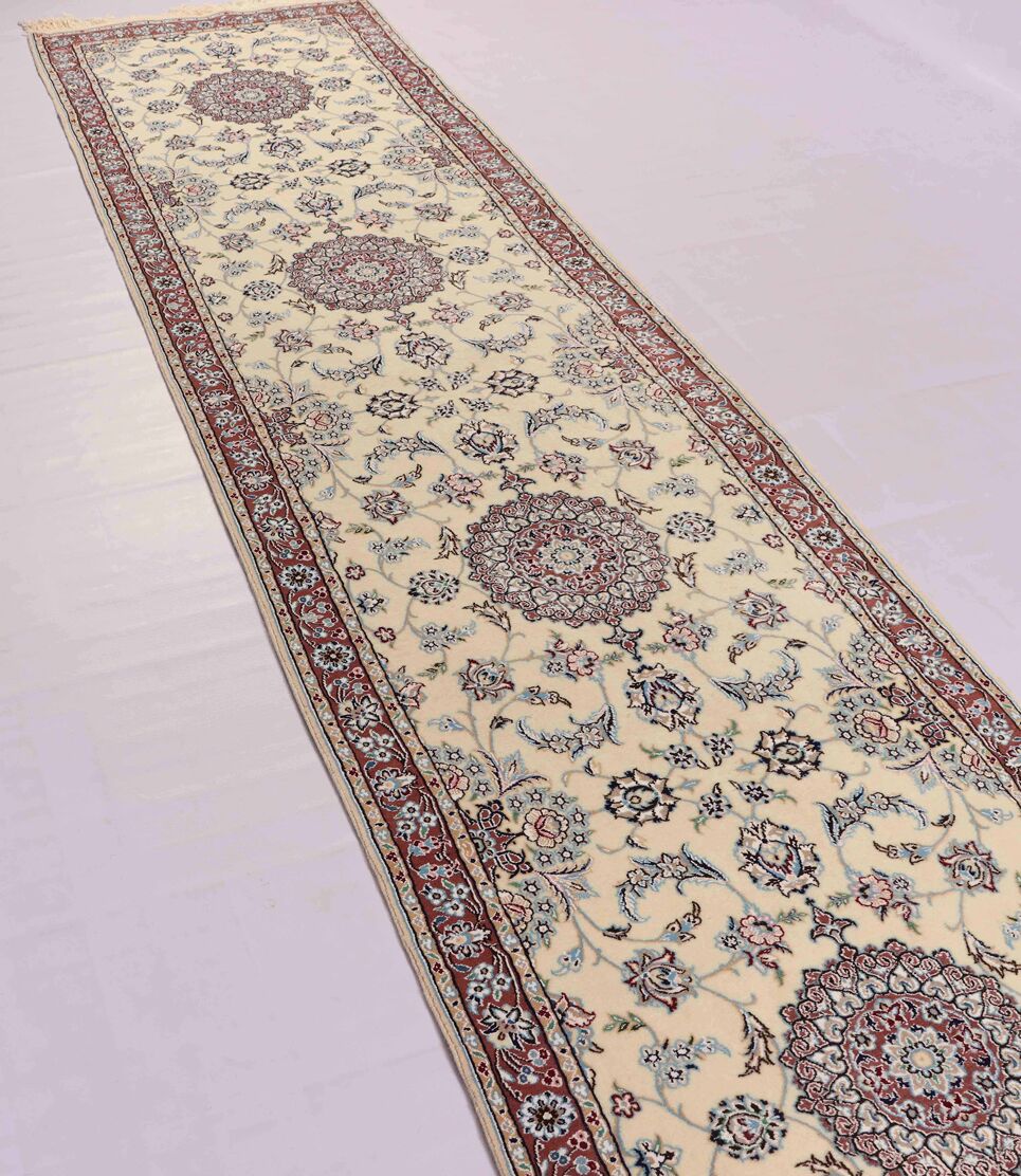 – Fine Elegance: Experience the allure of a fine authentic handmade Persian Nain Hall runner, a rarity over 3 meters in length, with pure lamb’s wool pile on a cotton base, featuring beige and blue, pink, red tones dyed using traditional methods.