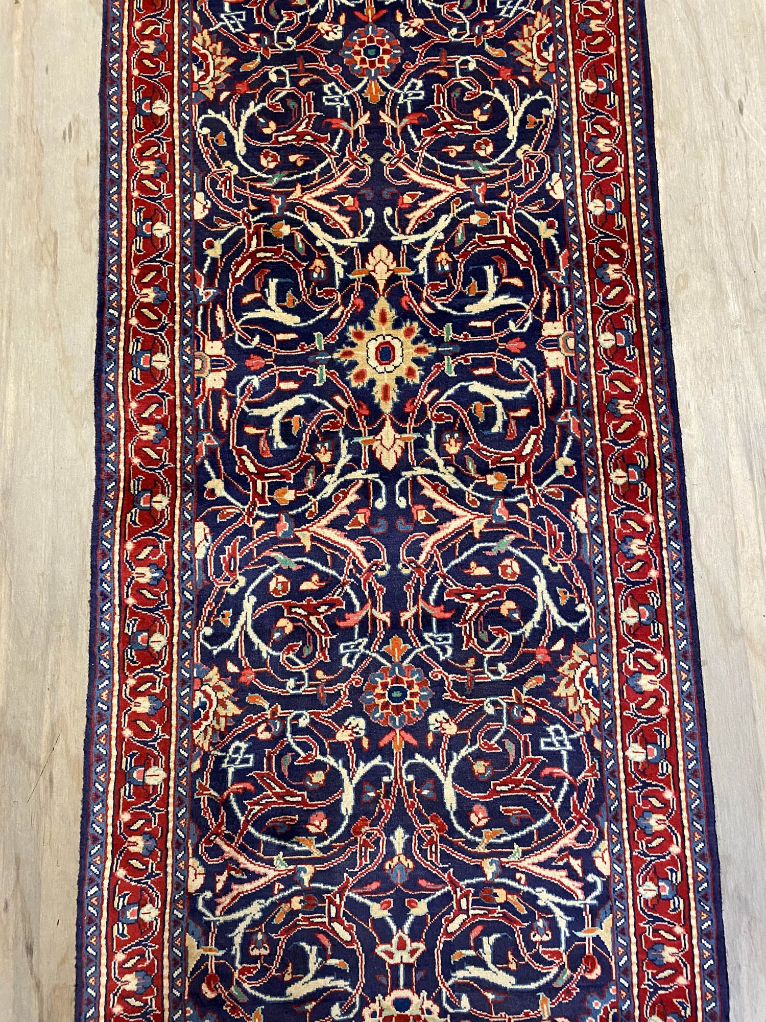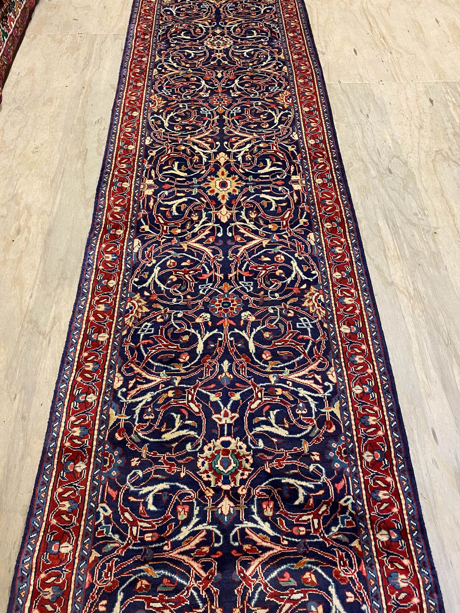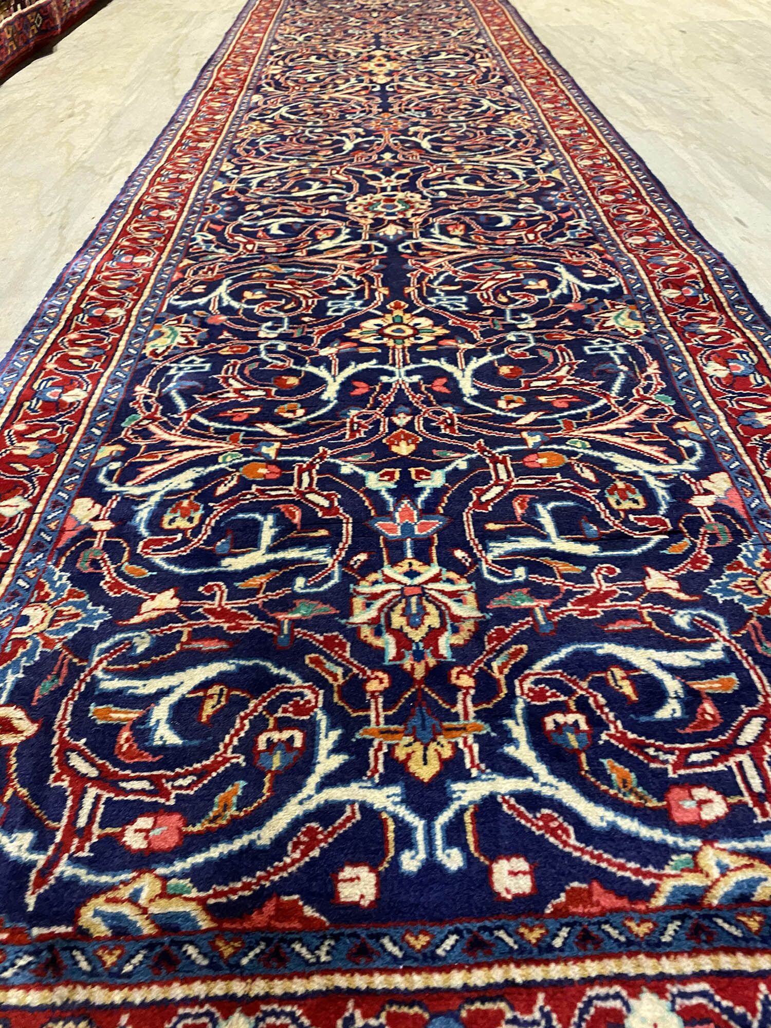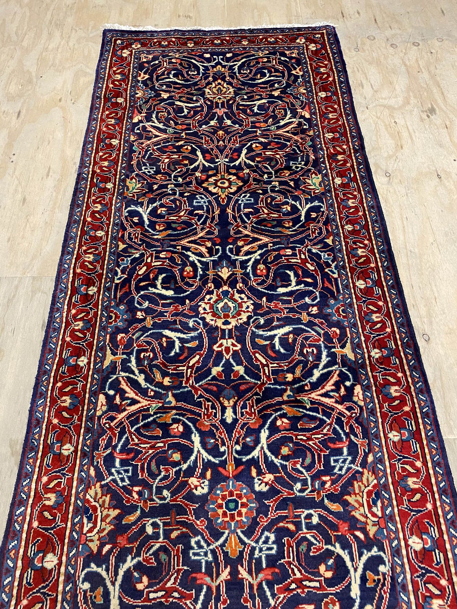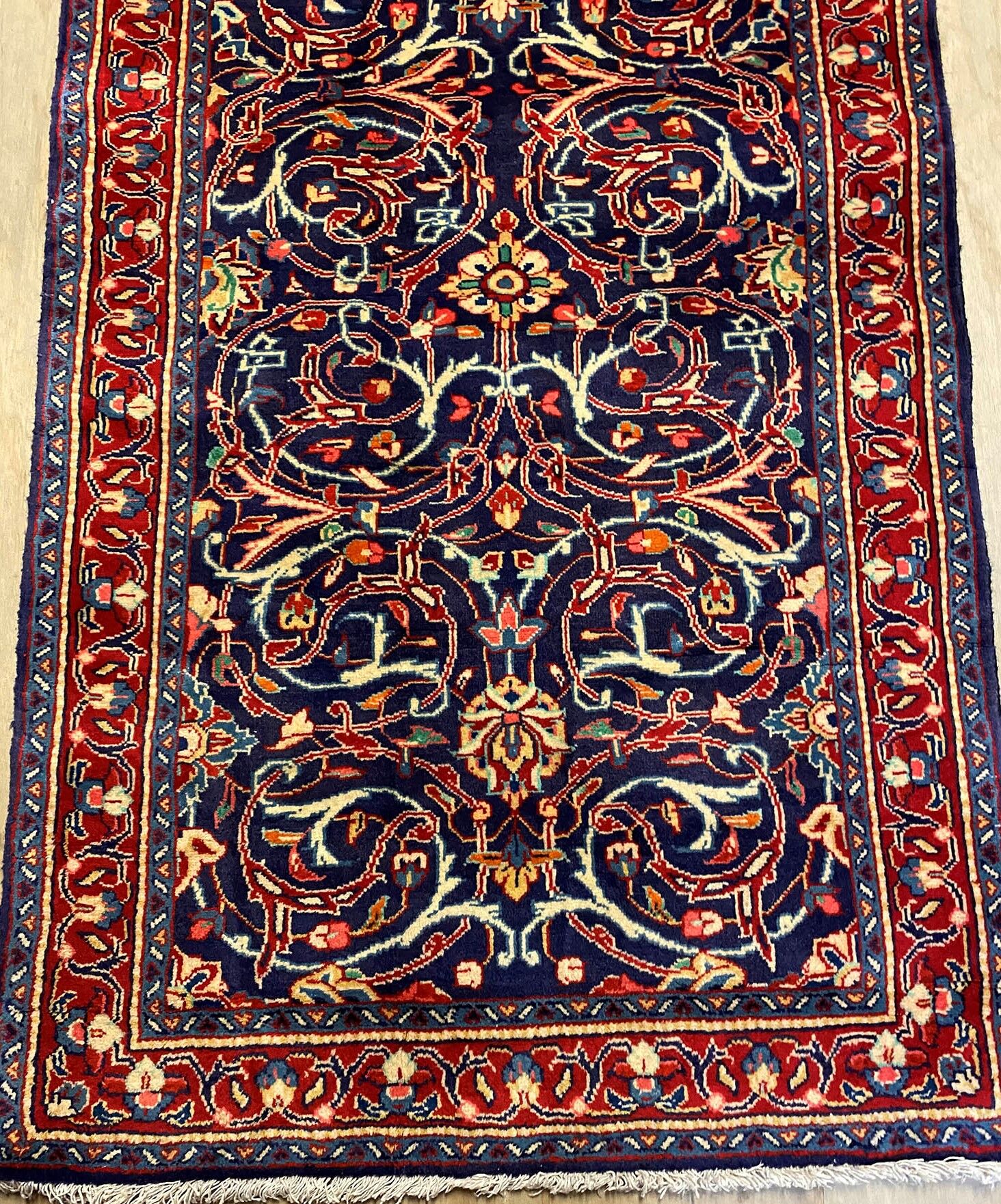 Lamb’s Wool Handmade Persian Sarough Hall Runner. Above All It Has A Very Dense And Heavy Pile. You Will Enjoy How It Will Feel Underneath Your Feet. It Also Pure Lamb’s Pile On Cotton Base. It Has an Indigo Blue and Red Tone Which Was Dyed Using Traditional Methods.