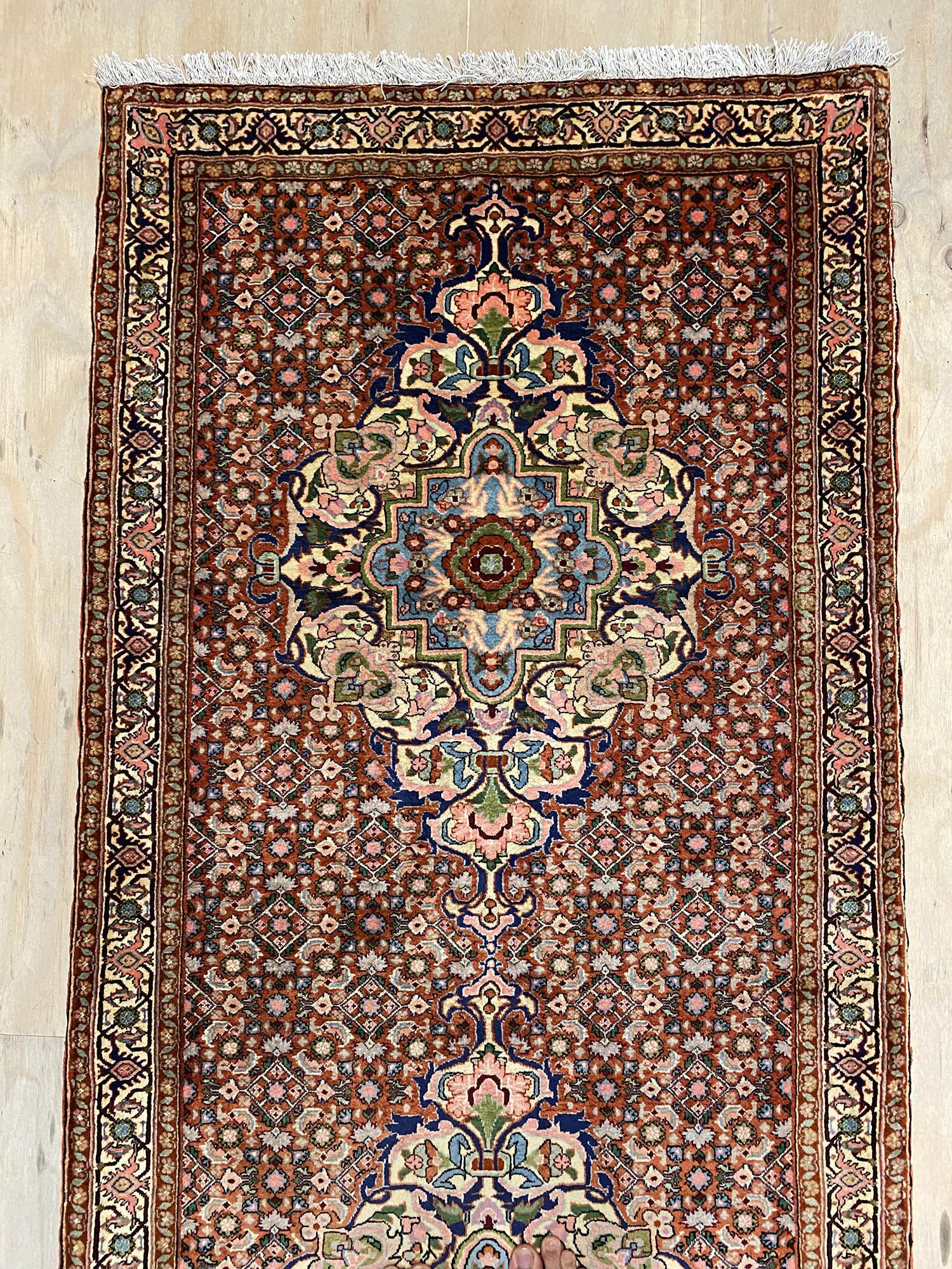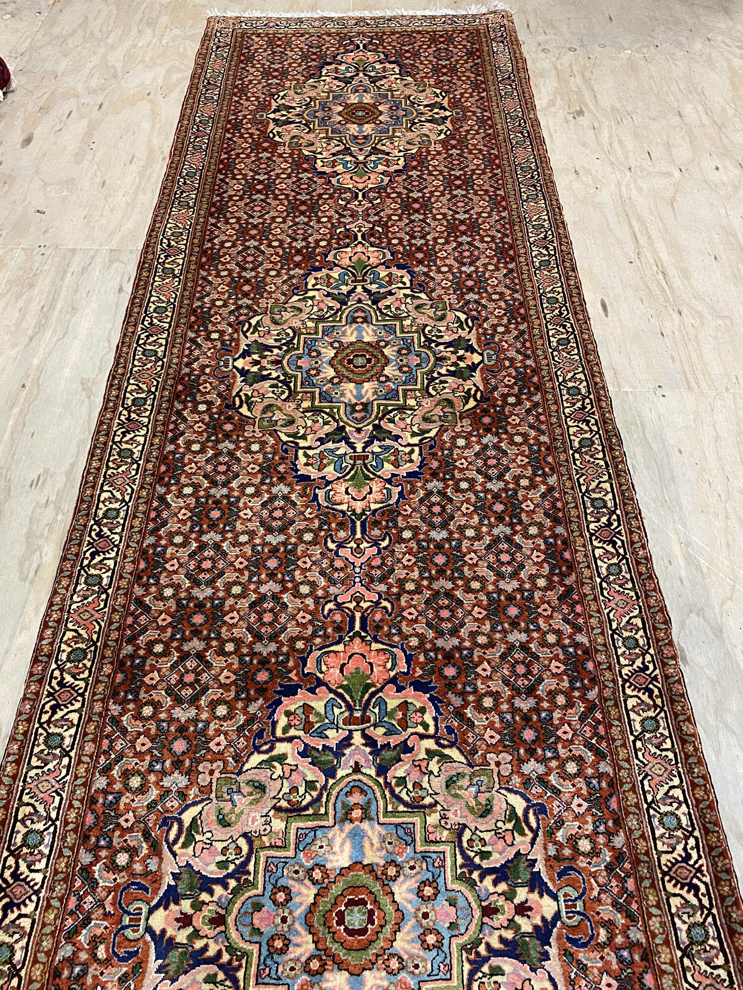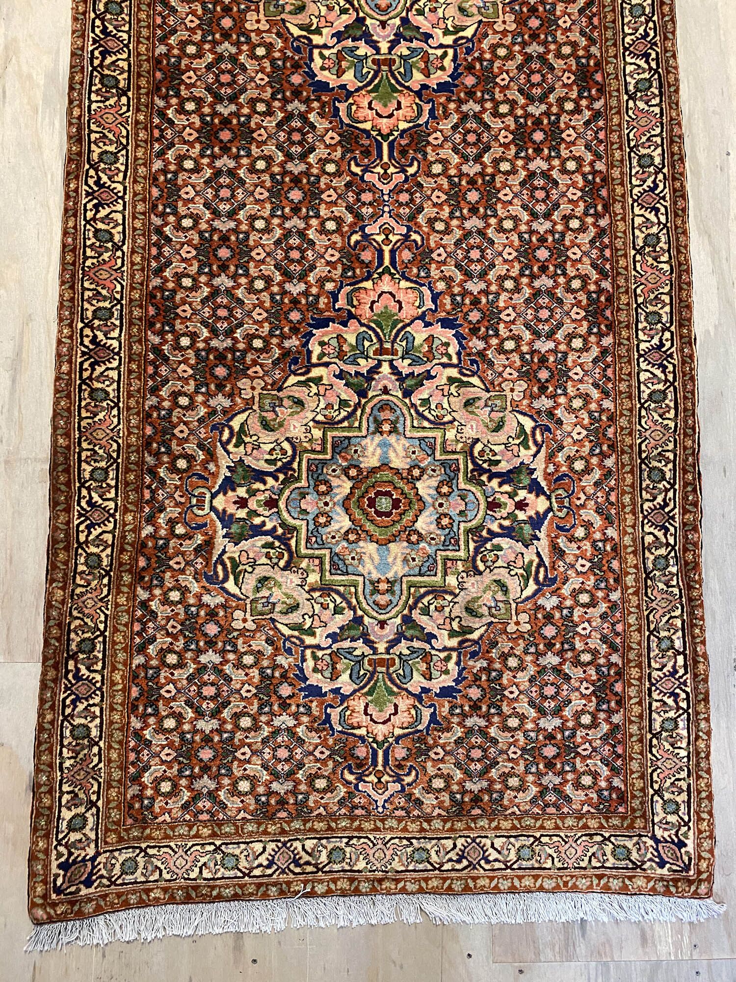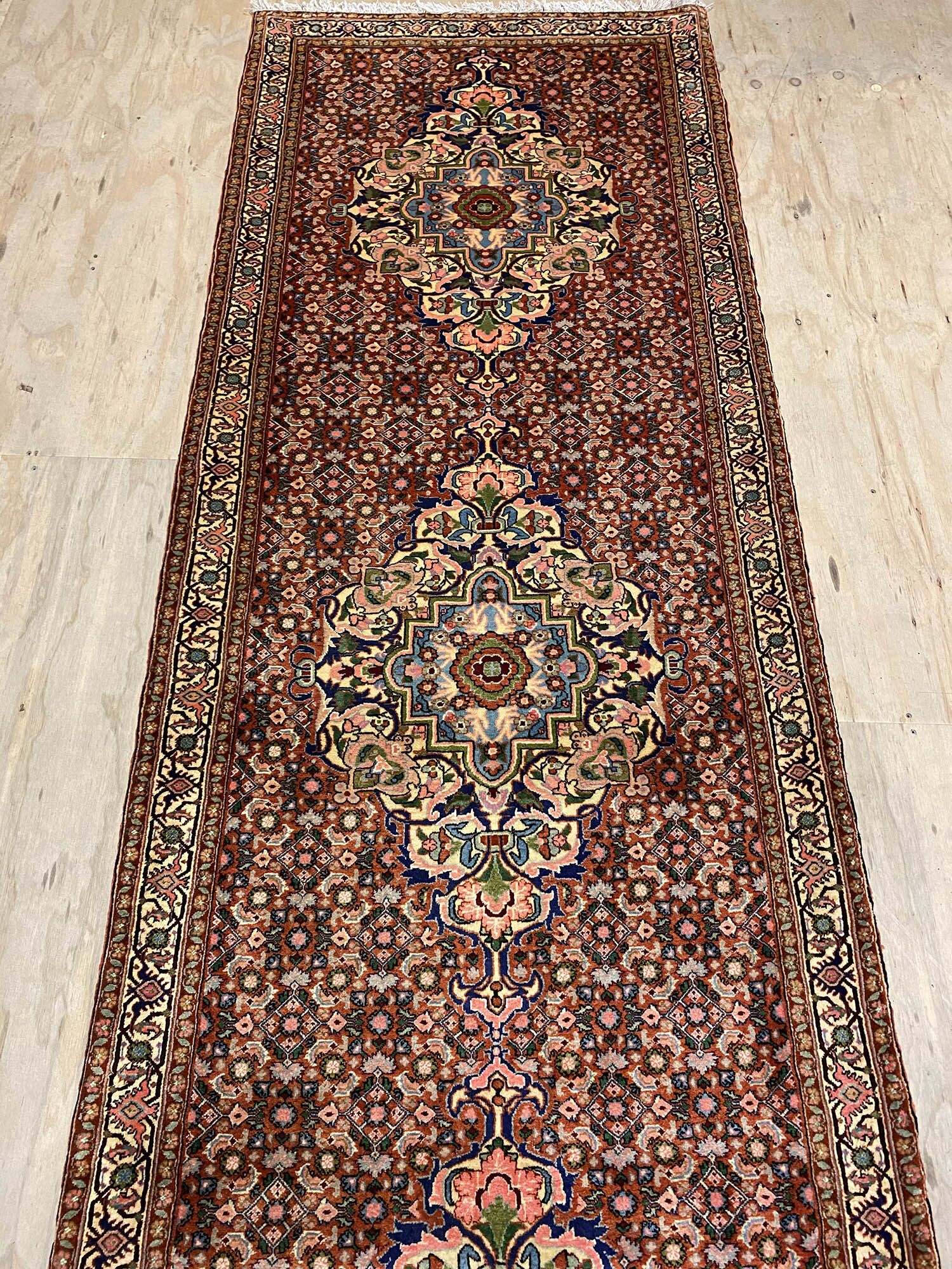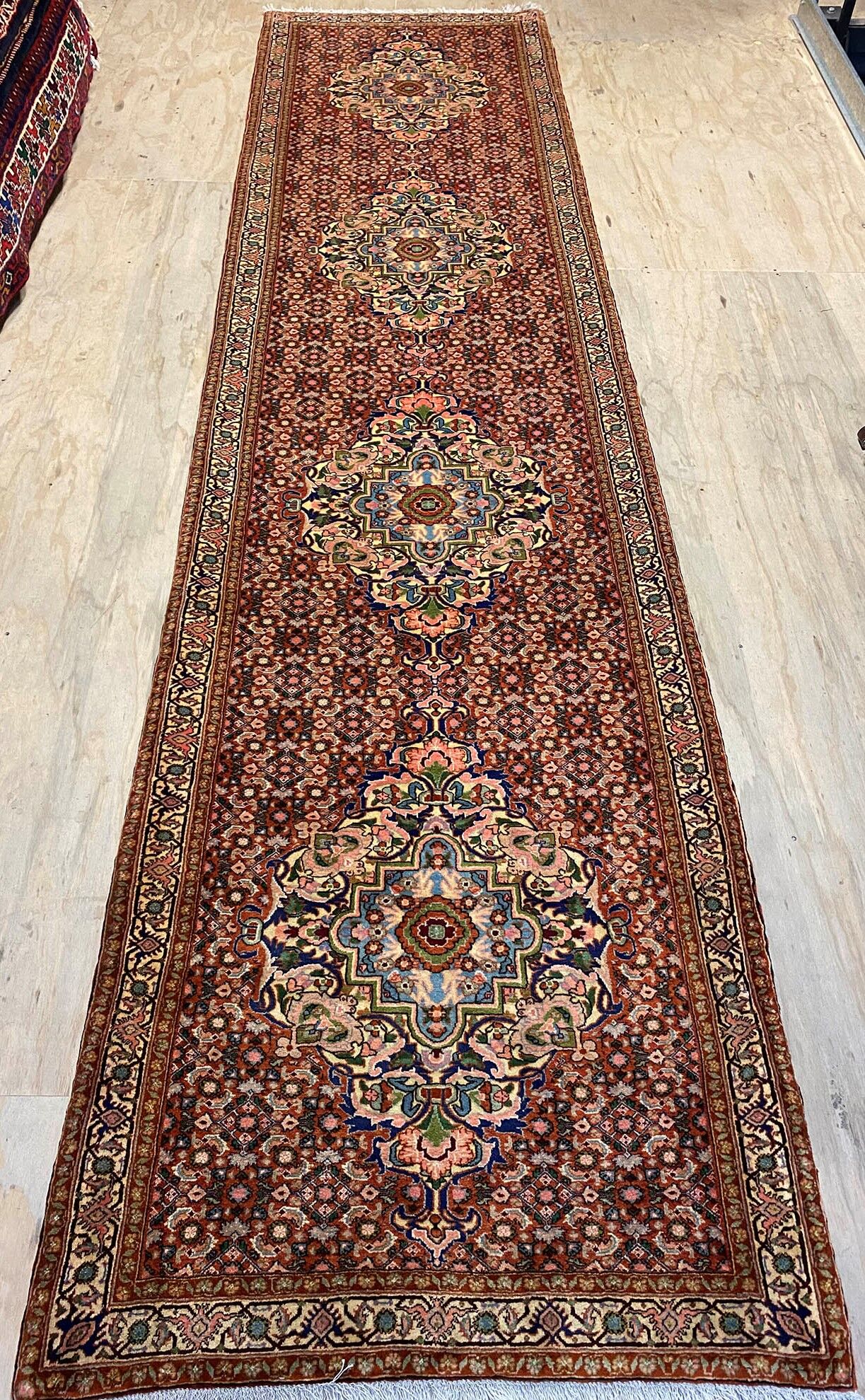 Rare 4m Hand Knotted Persian Senneh Bijar Runner. Above All It Is Hard To Find This Quality Original Handmade Hall Runners. It Has a Pure Lamb’s Wool Pile on Fine Cotton. Gold and Brown Tone Dyed Using Traditional Methods. Dense Quality from Sanandaj.