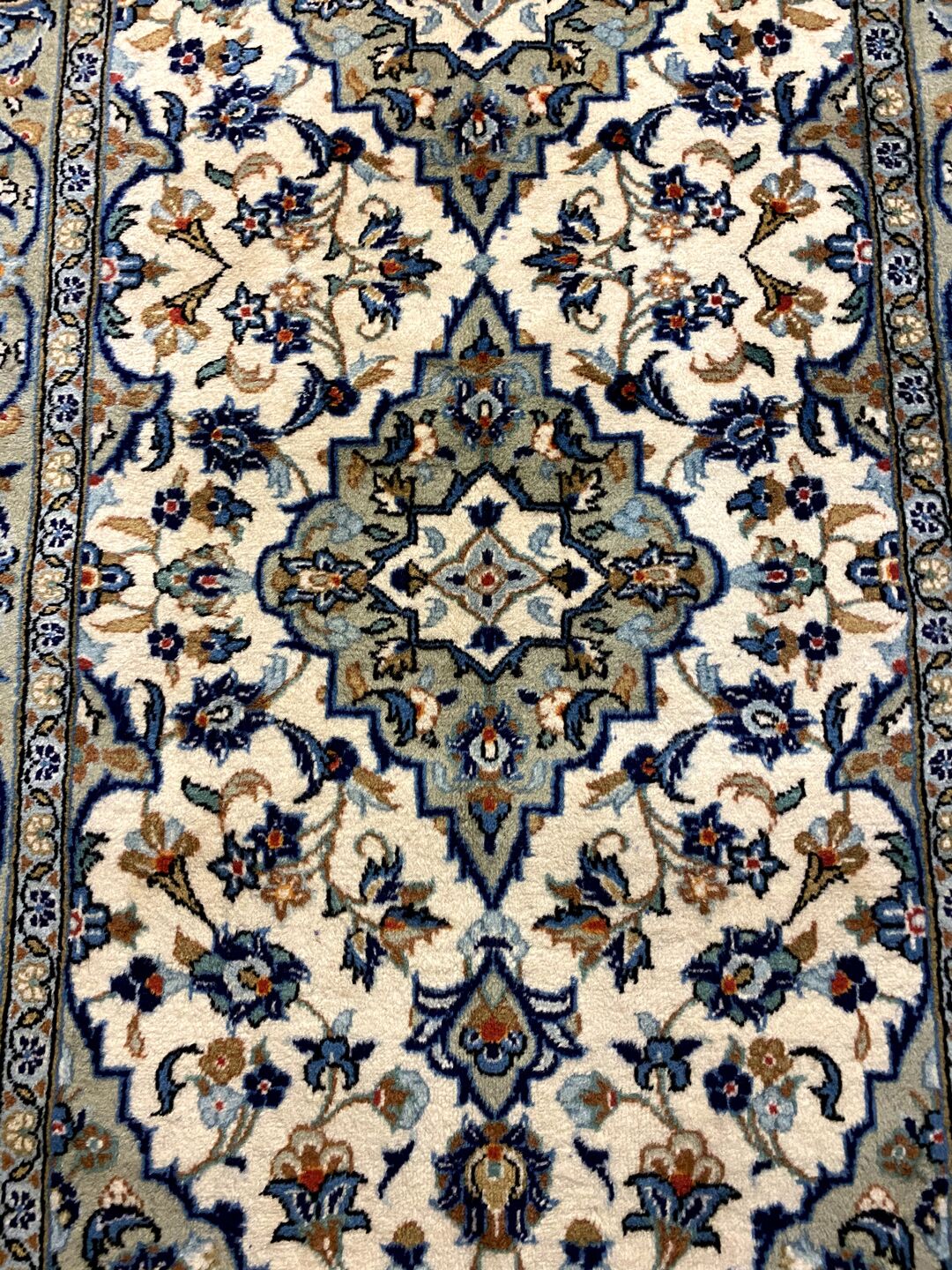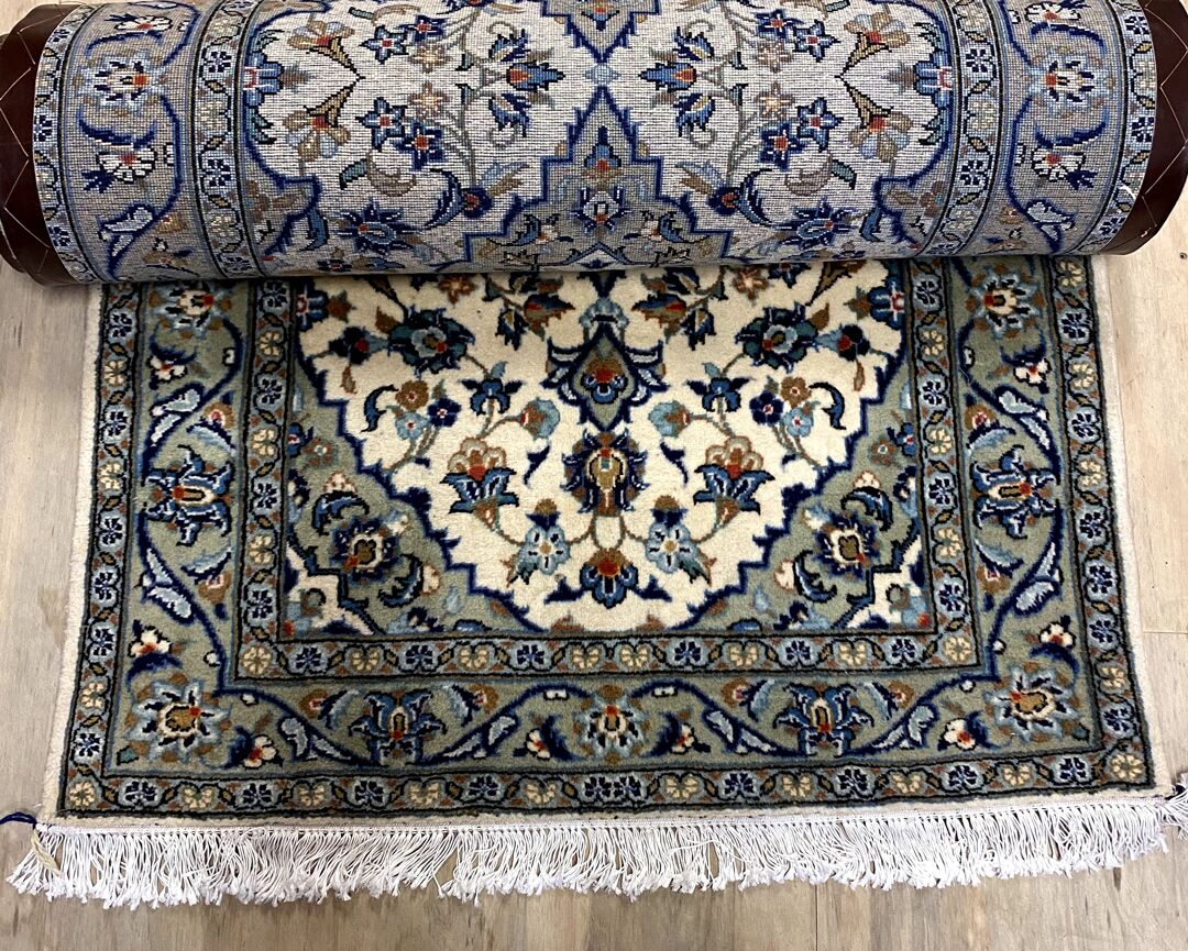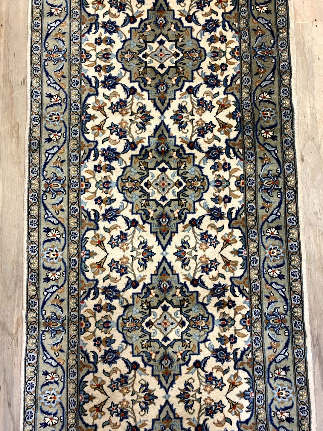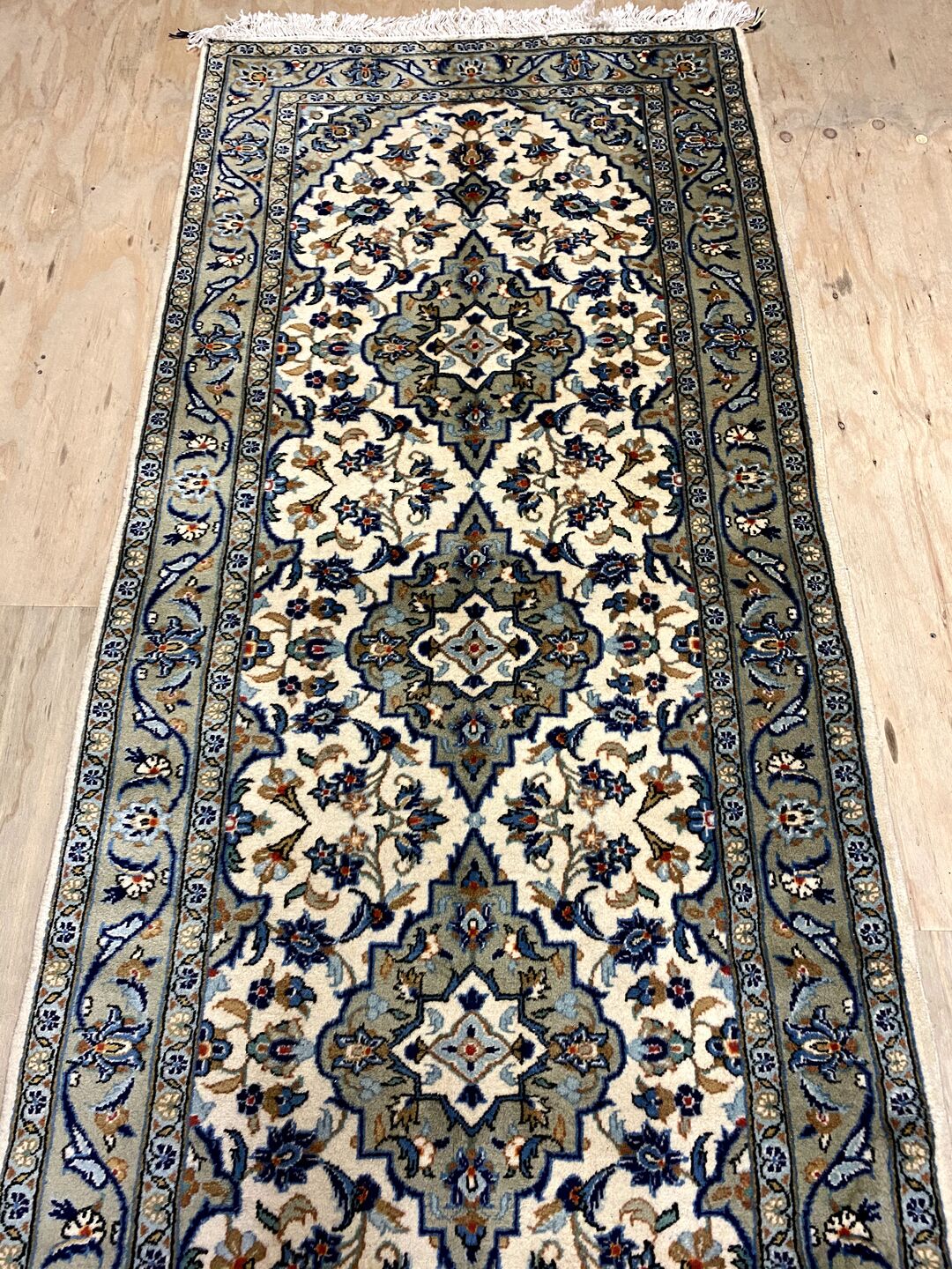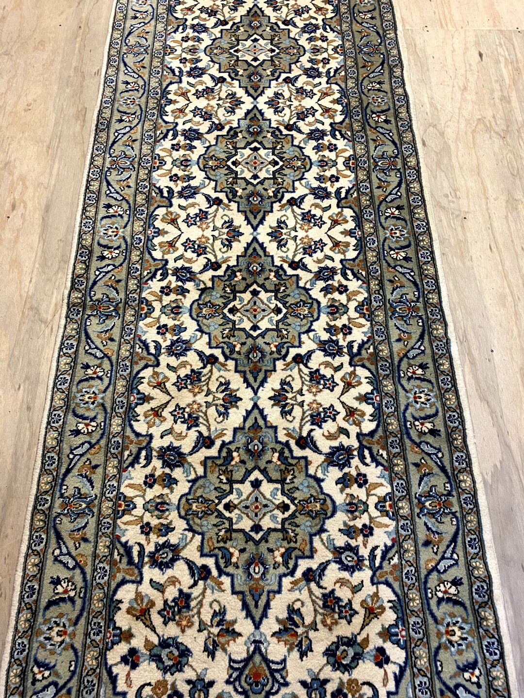 Gorgeous Authentic Hand Knotted Persian Kashan Runner. Above All It Is Hard To Get This Quality Original Handmade Runners Over 3m. It Has a Pure Lamb’s Wool Pile On Cotton Base. Beige & Creamy Tones Dyed Using Traditional Methods. Fine Quality Piece from City Of Kashan.