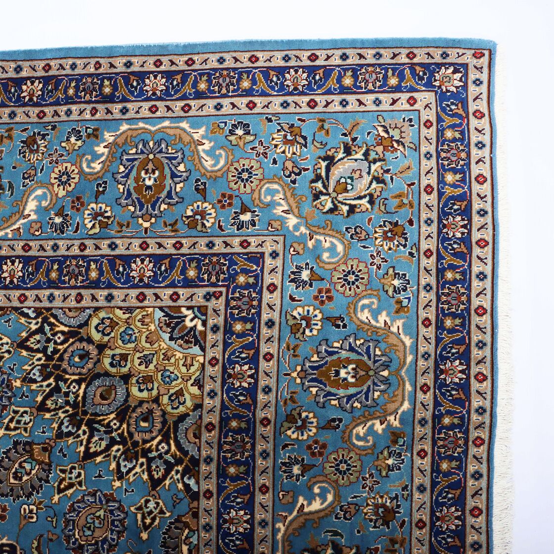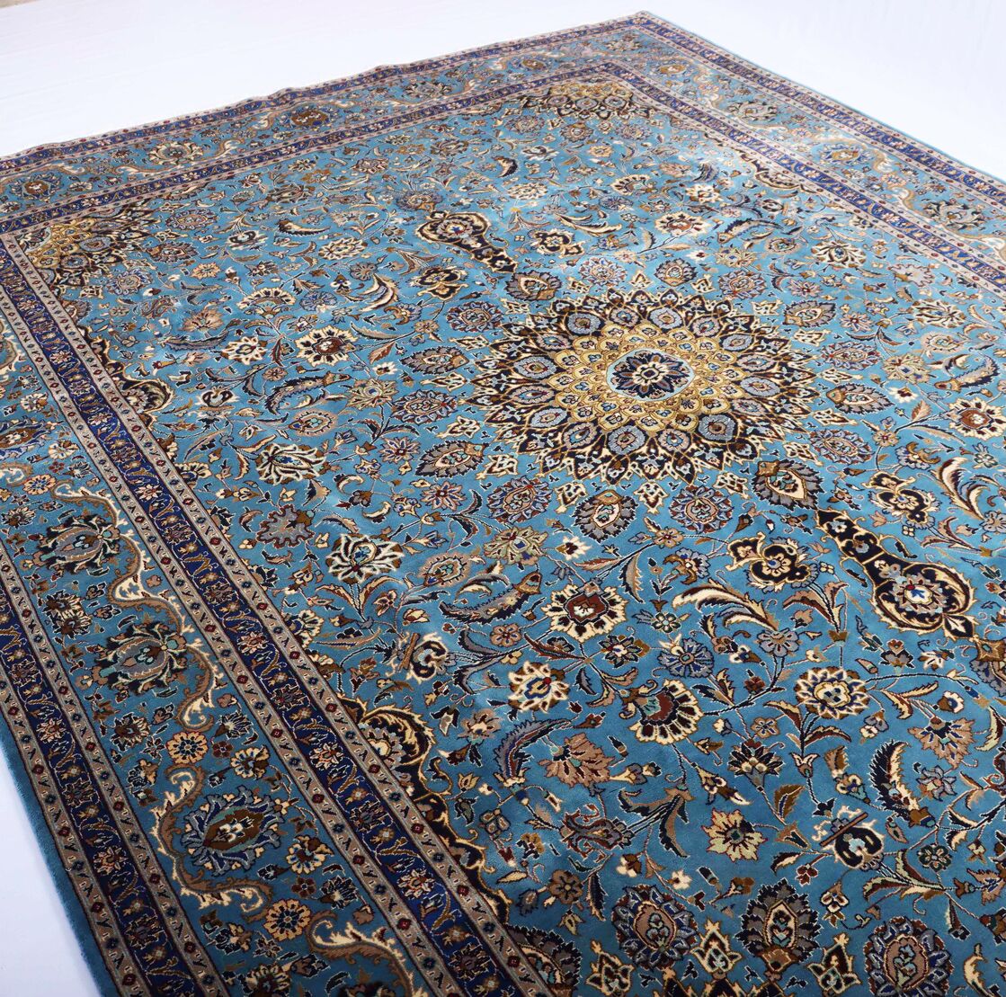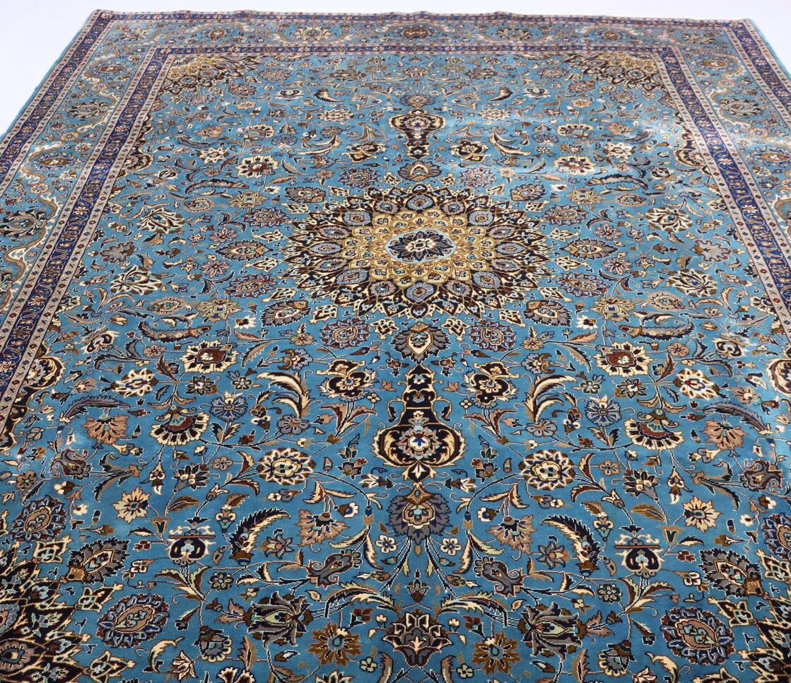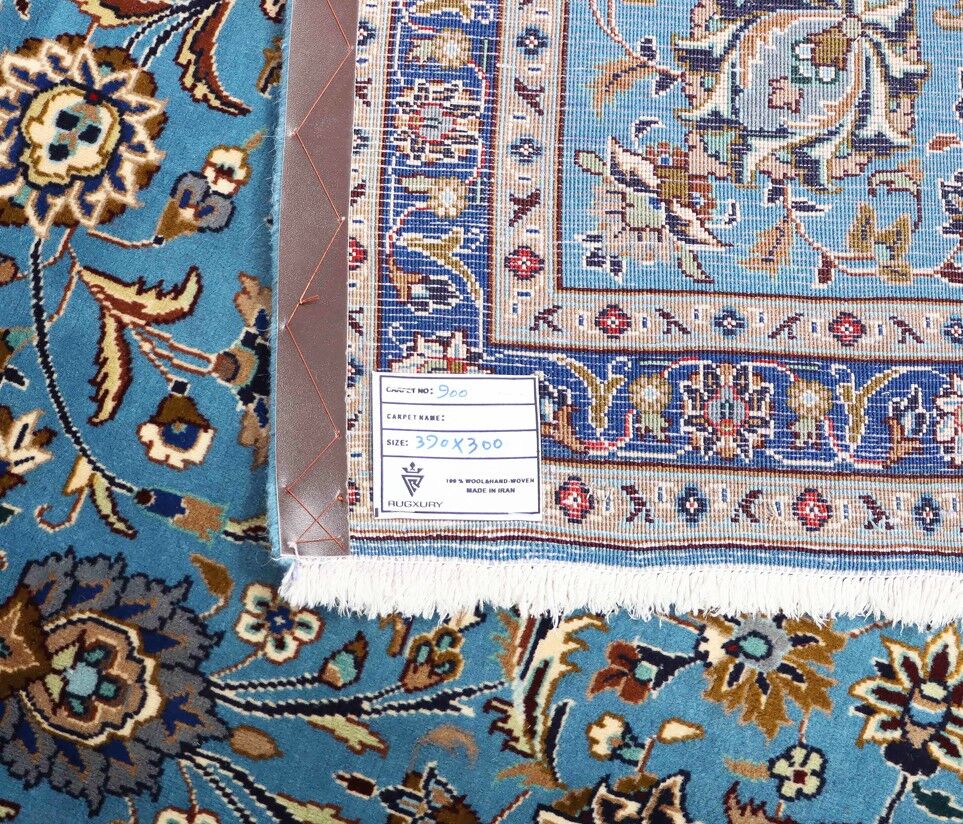 – Exquisite Craftsmanship: Immerse yourself in the amazing craftsmanship of this large room-size authentic handmade Persian Kashmar rug. A rare find, it features pure lamb’s wool pile on a cotton base, dyed in blue, beige, and brown tones using traditional methods.