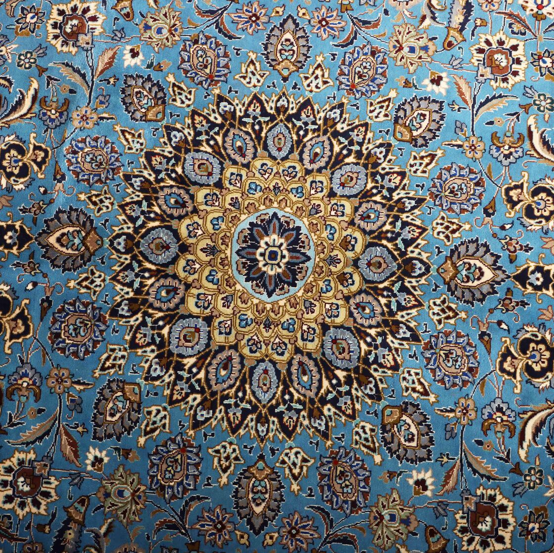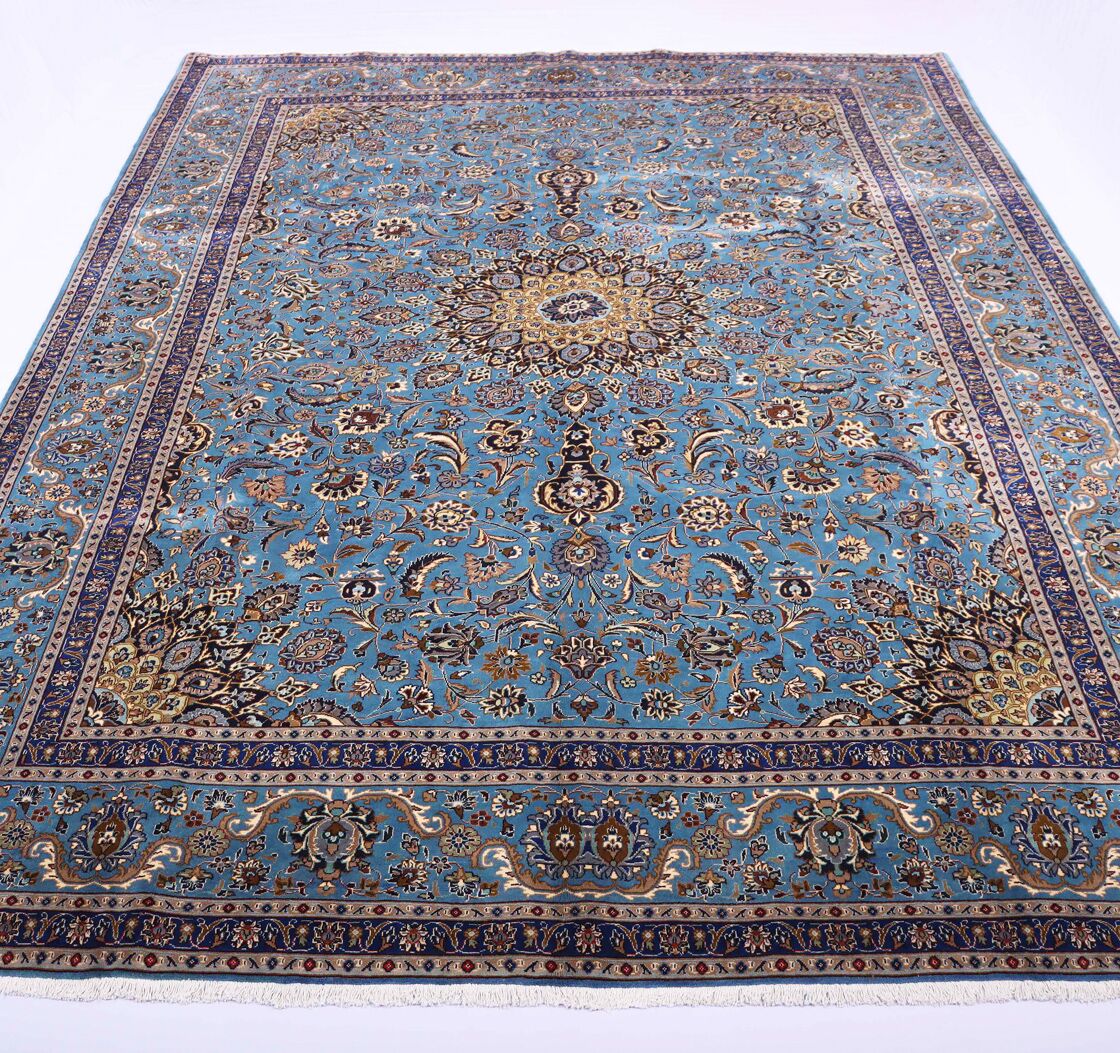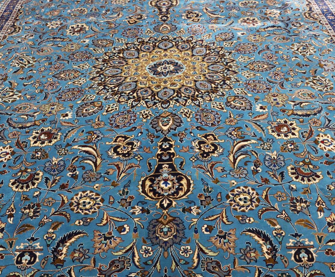 – Exquisite Craftsmanship: Immerse yourself in the amazing craftsmanship of this large room-size authentic handmade Persian Kashmar rug. A rare find, it features pure lamb’s wool pile on a cotton base, dyed in blue, beige, and brown tones using traditional methods.