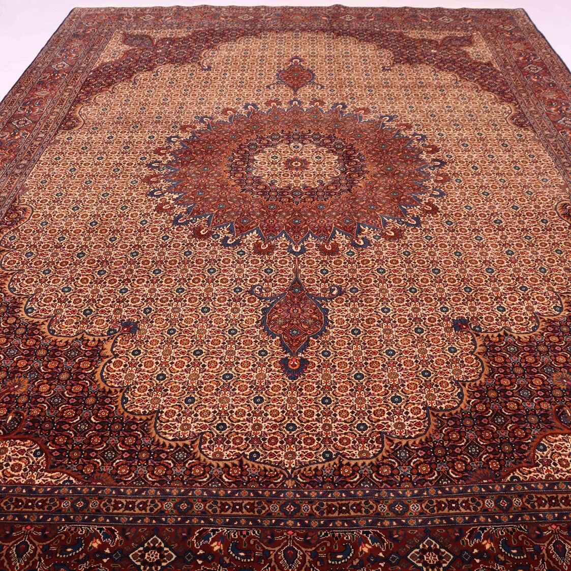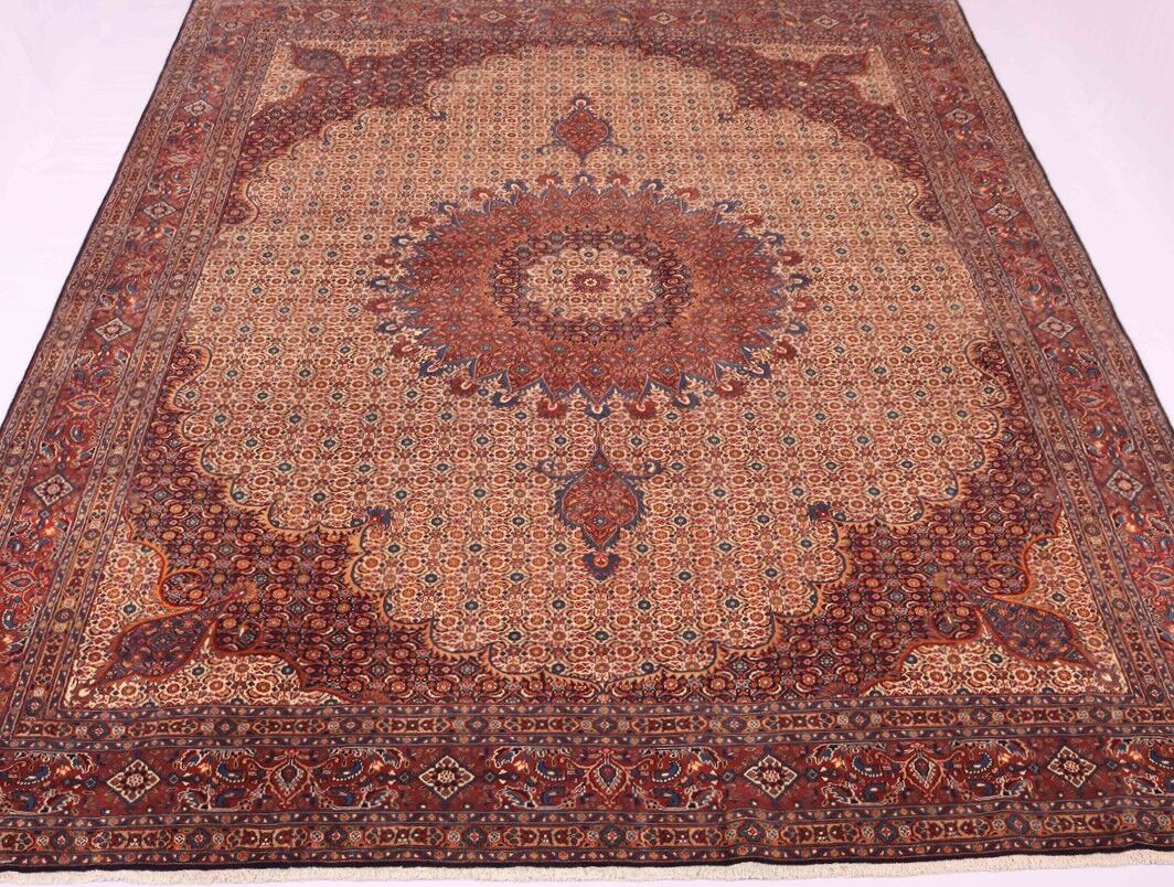 – Timeless Elegance: Immerse your space in the timeless pattern and fine workmanship of this super fine full room size Persian Mood Rug. Pure lamb’s wool pile on a fine cotton base creates a dense quality carpet in beige, blue, and red tones, crafted with traditional methods.