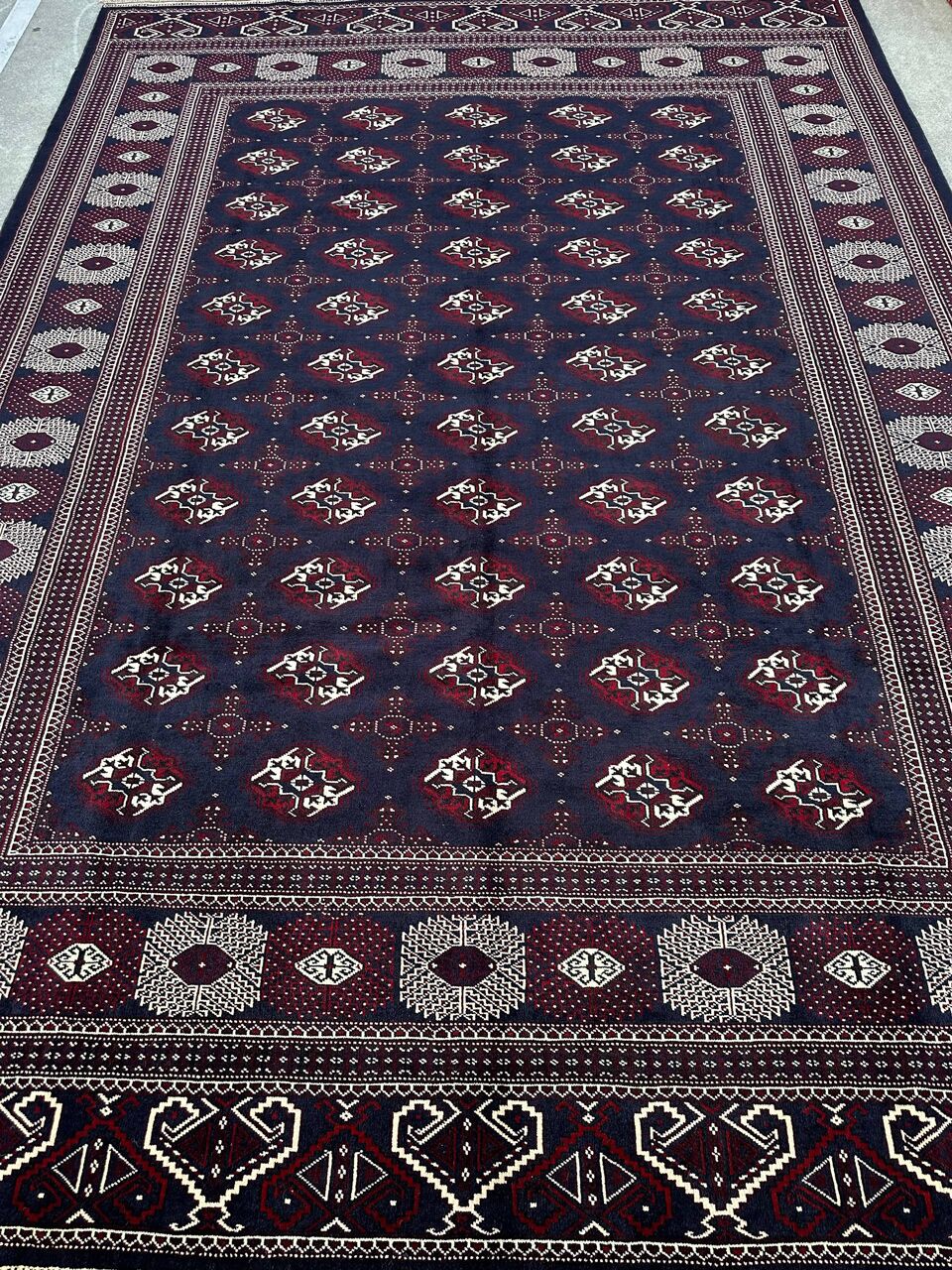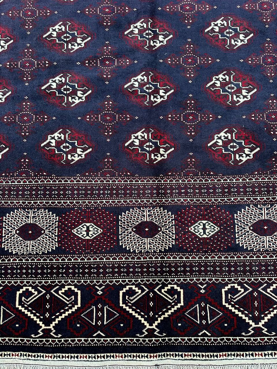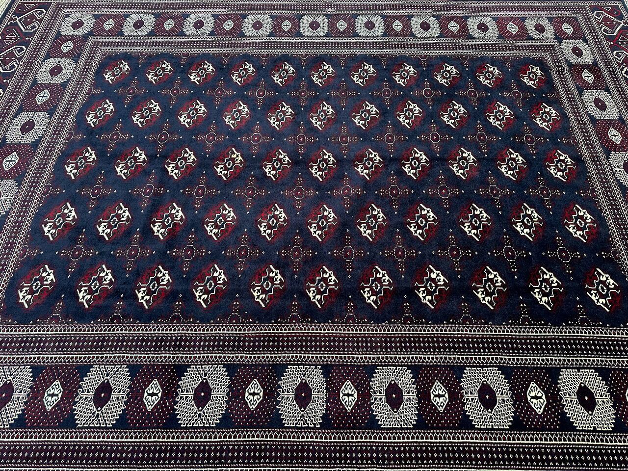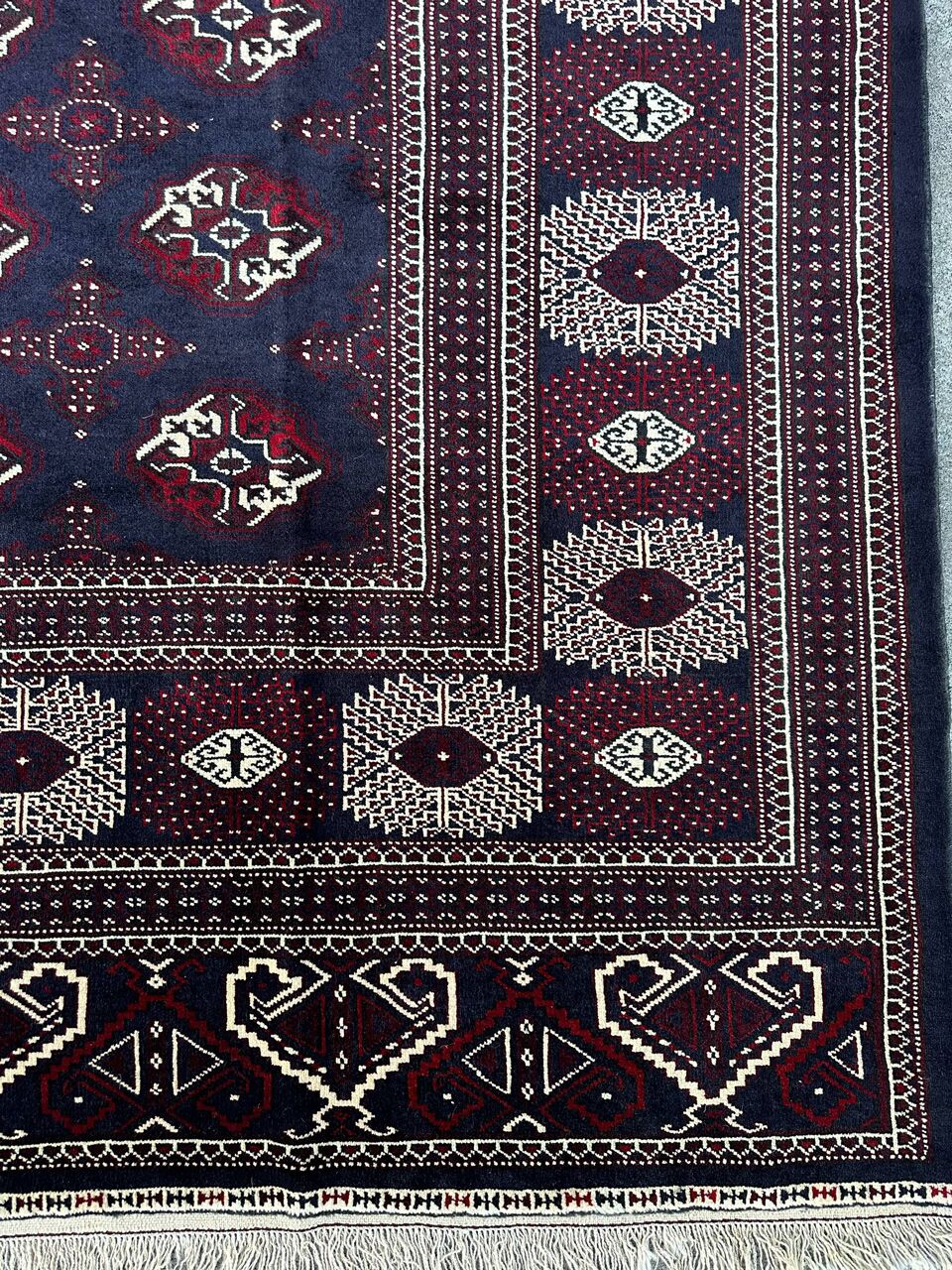 – Tribal Elegance: Immerse your space in the tribal elegance of this room-size hand-knotted Turkoman rug. Crafted with pure hand-spun wool pile on a cotton base, it features a rich Indigo Blue tone dyed using traditional methods.