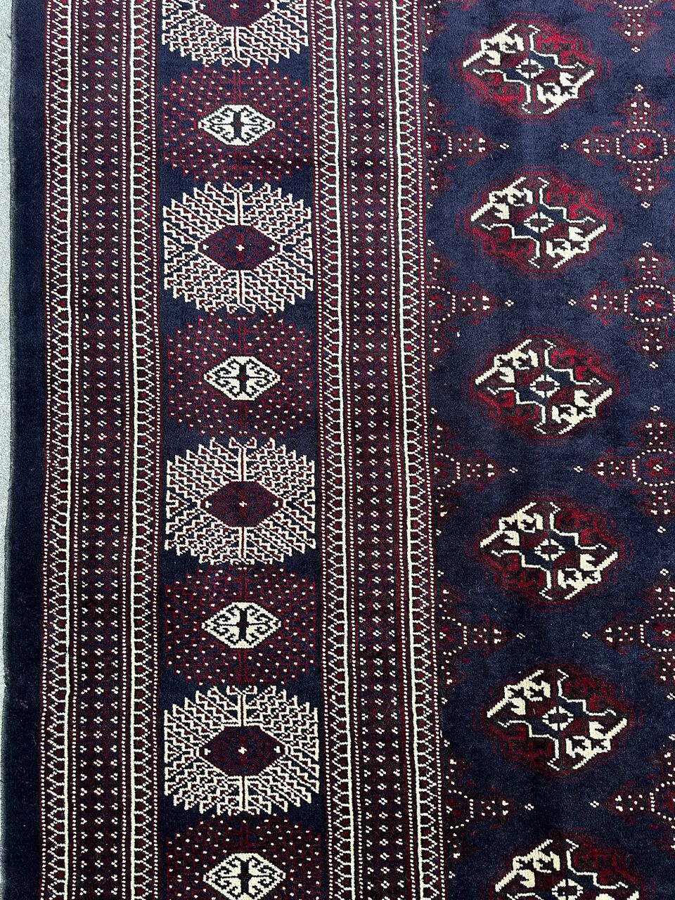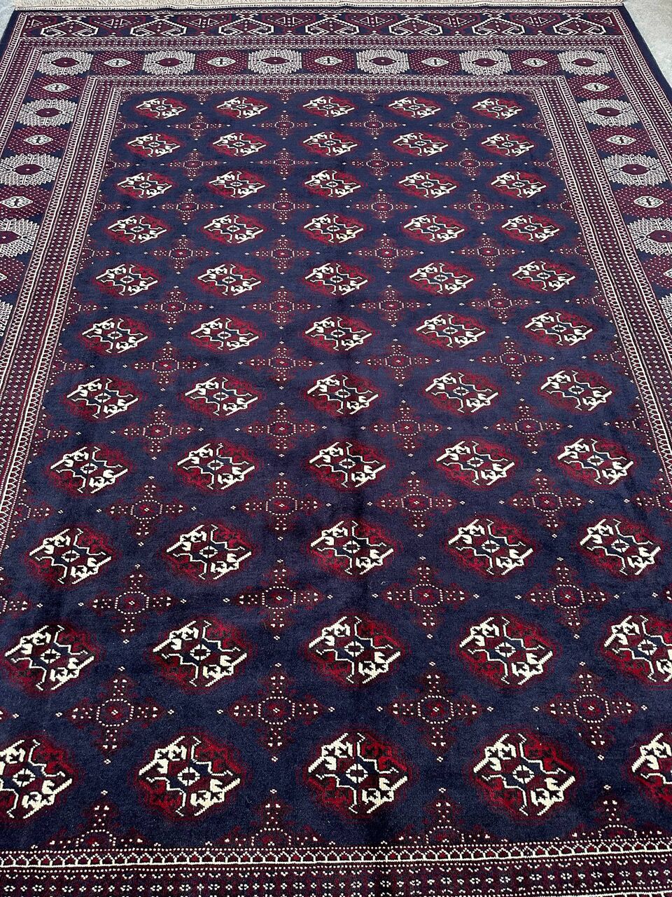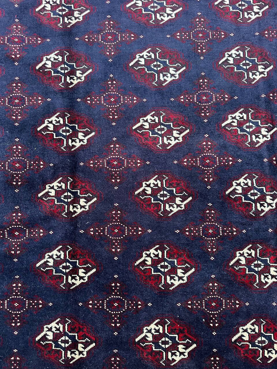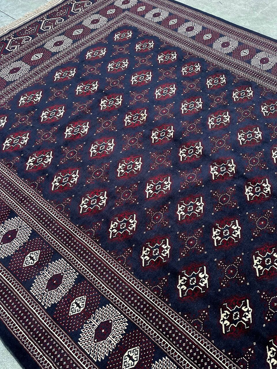 – Tribal Elegance: Immerse your space in the tribal elegance of this room-size hand-knotted Turkoman rug. Crafted with pure hand-spun wool pile on a cotton base, it features a rich Indigo Blue tone dyed using traditional methods.