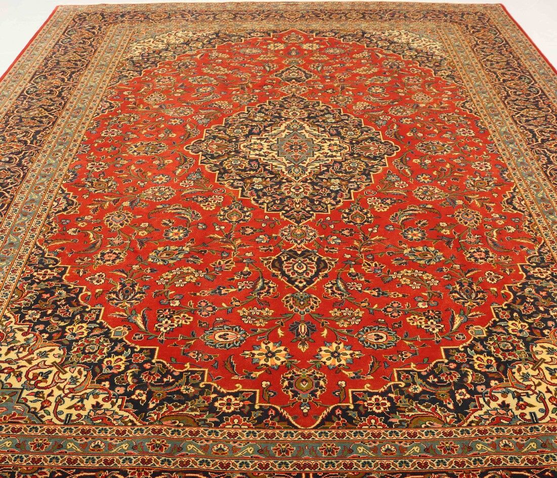 Large Room Size Vintage Persian Kashan Rug. Above All It Is Hard To Get This Quality Original Handmade Rug. It Has a Pure Lamb’s Pile on Cotton Base. Main Colors Are Deep Red, Beige And Faded Red Dyed Using Traditional Methods. Fine Quality Piece from City Of Kashan. size:395x295cm Gallery Replacement: 10500$