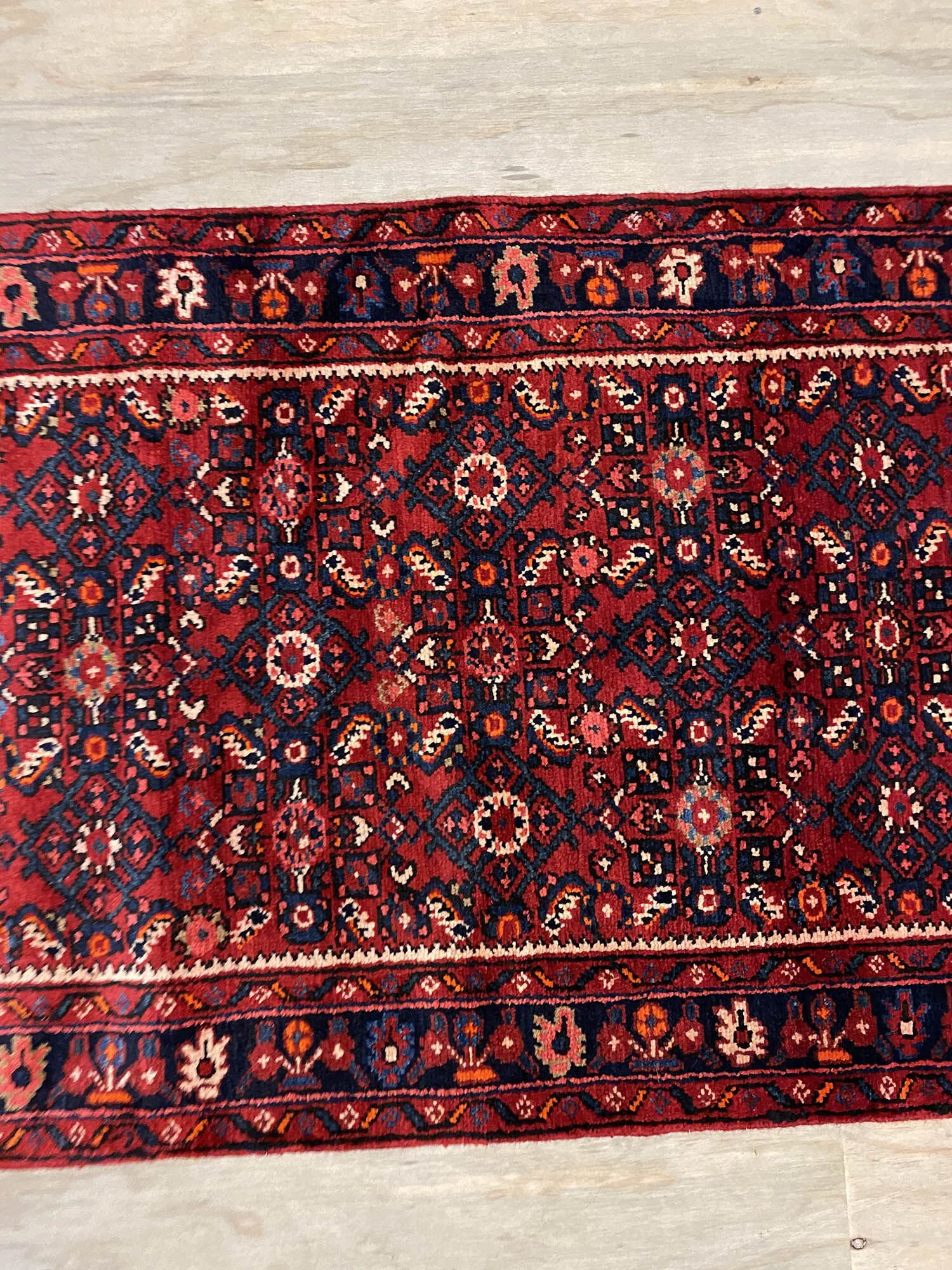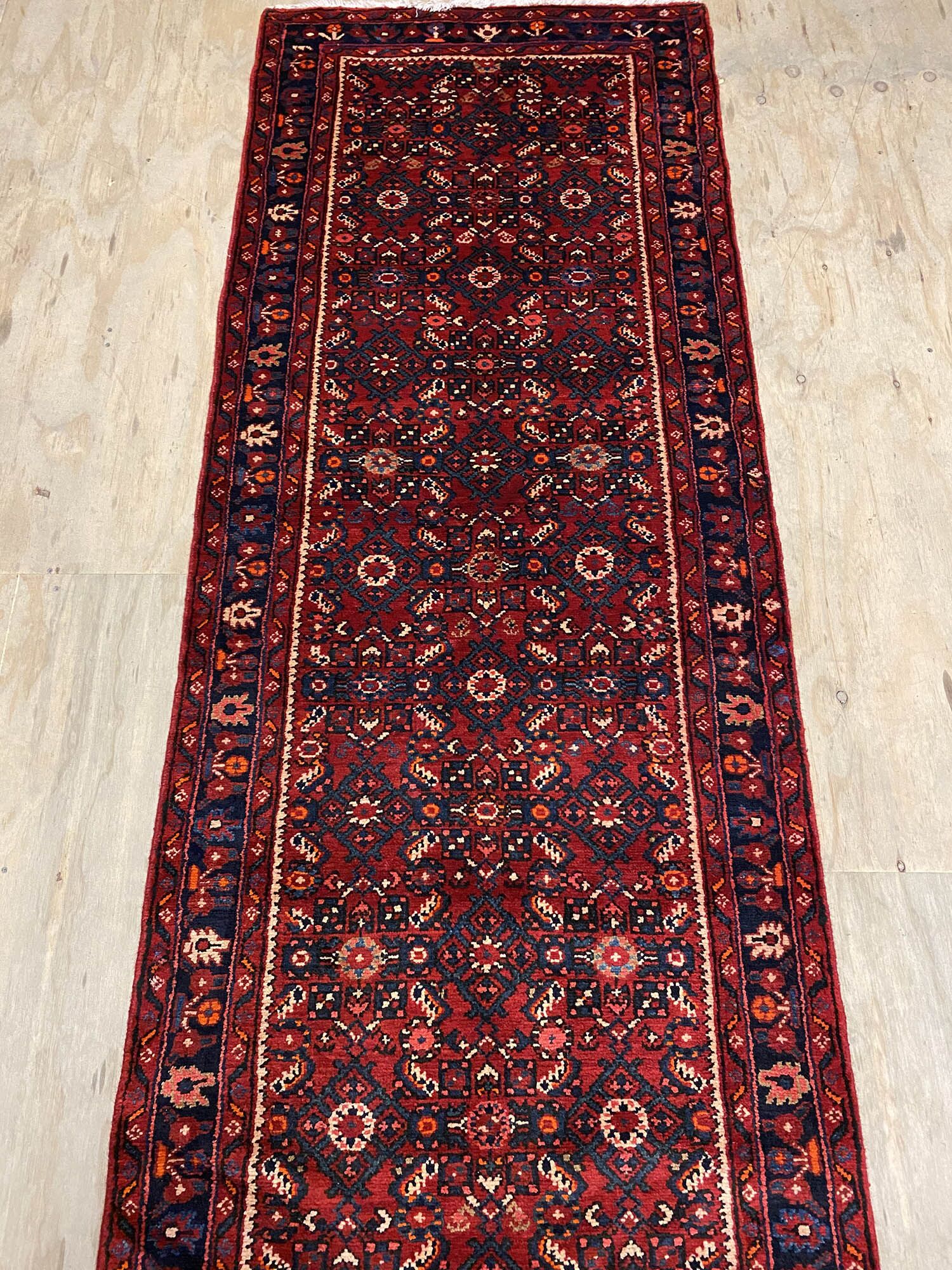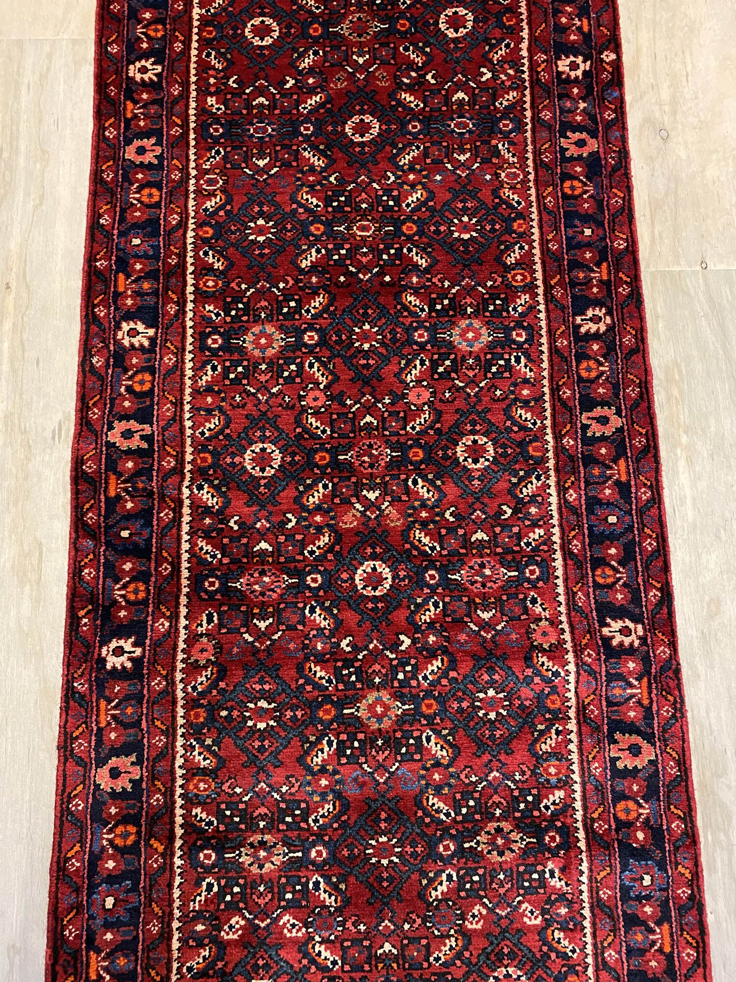 Hosseinabad Design Handmade Persian Hamedan Runner. Above All It Is Hard Wearing & Durable Runner. It Also Has Pure Hand Spun Wool Pile On Cotton Base. Gorgeous Red Background Dyed Using Traditional Methods.