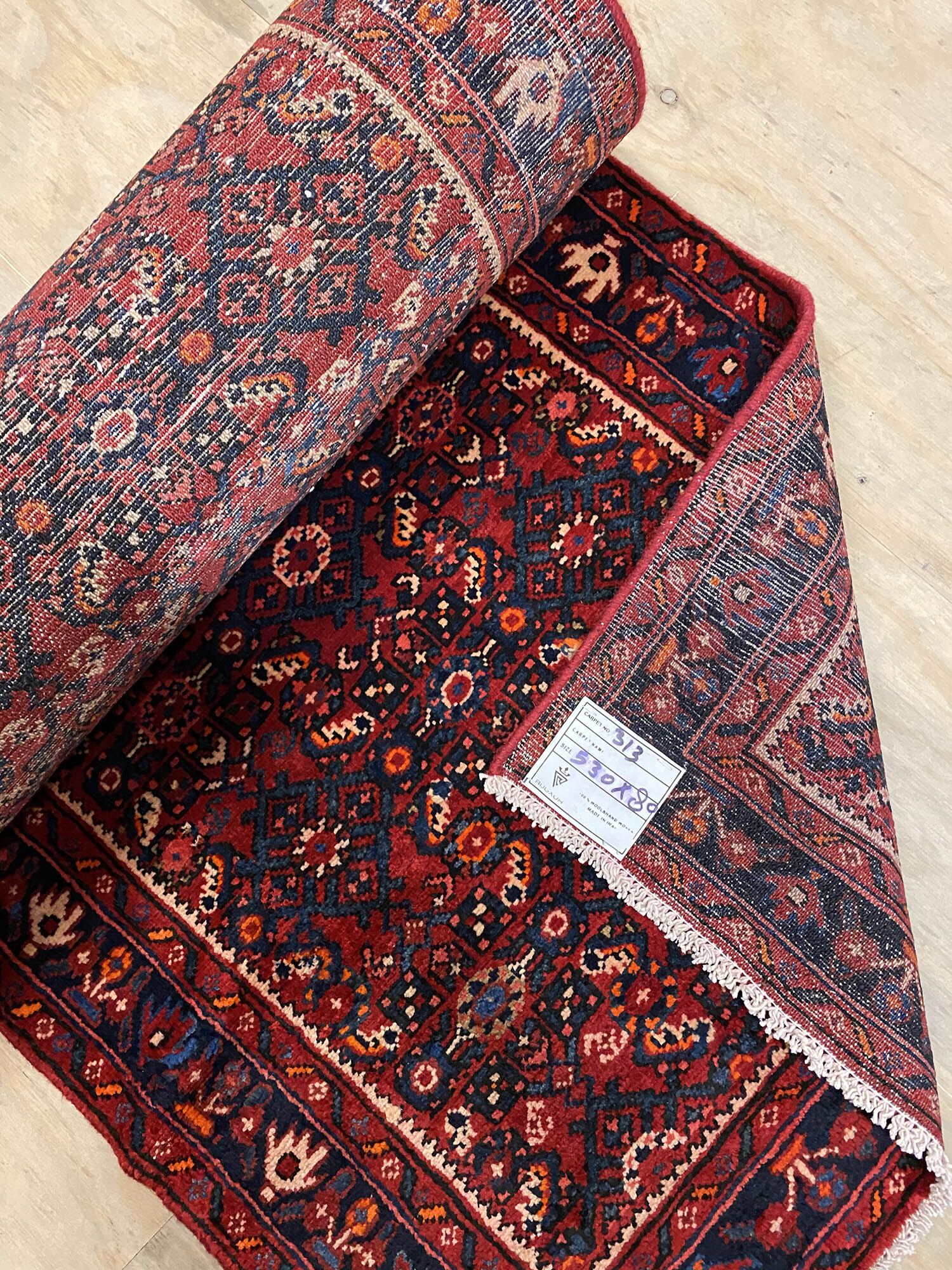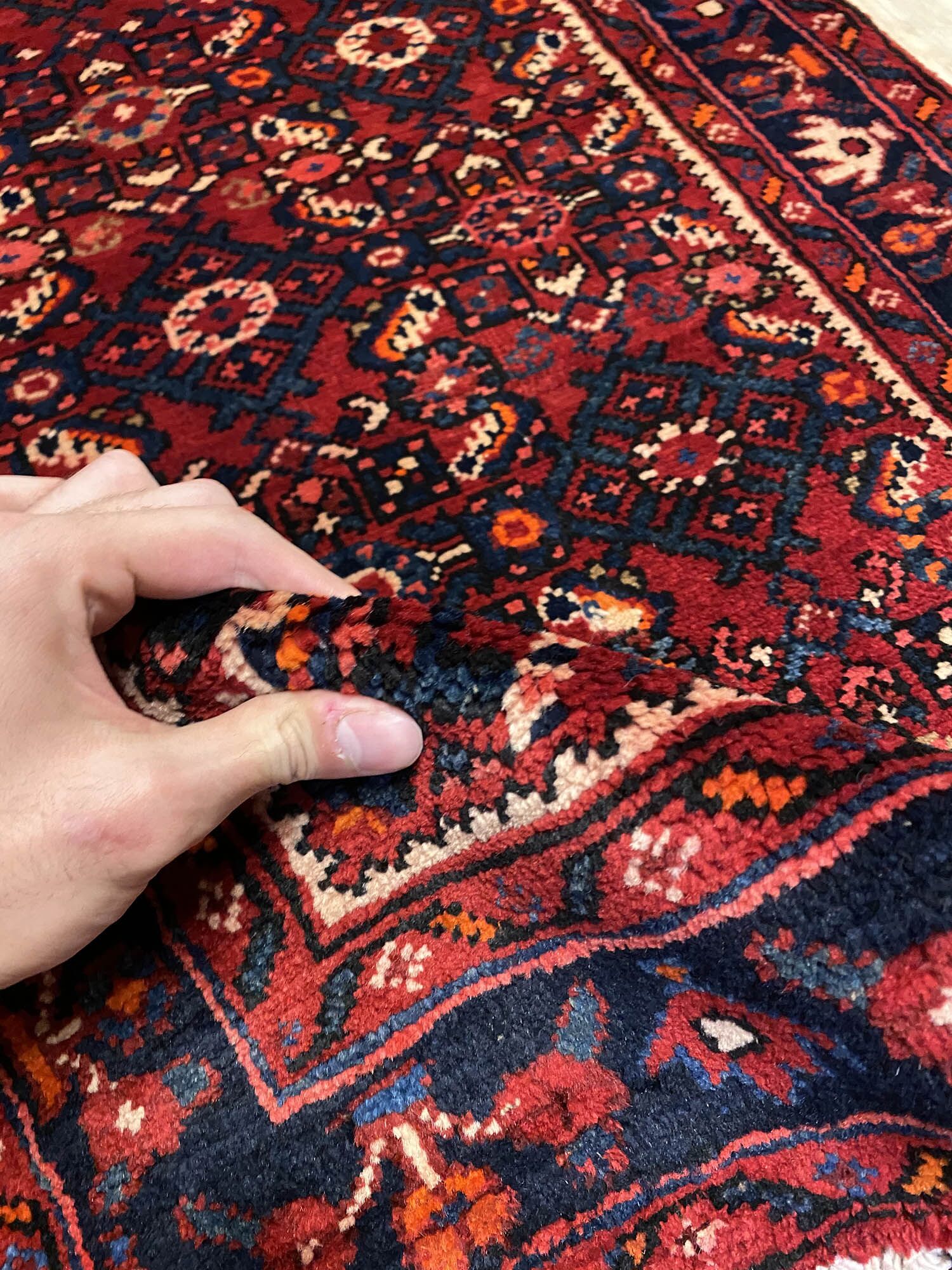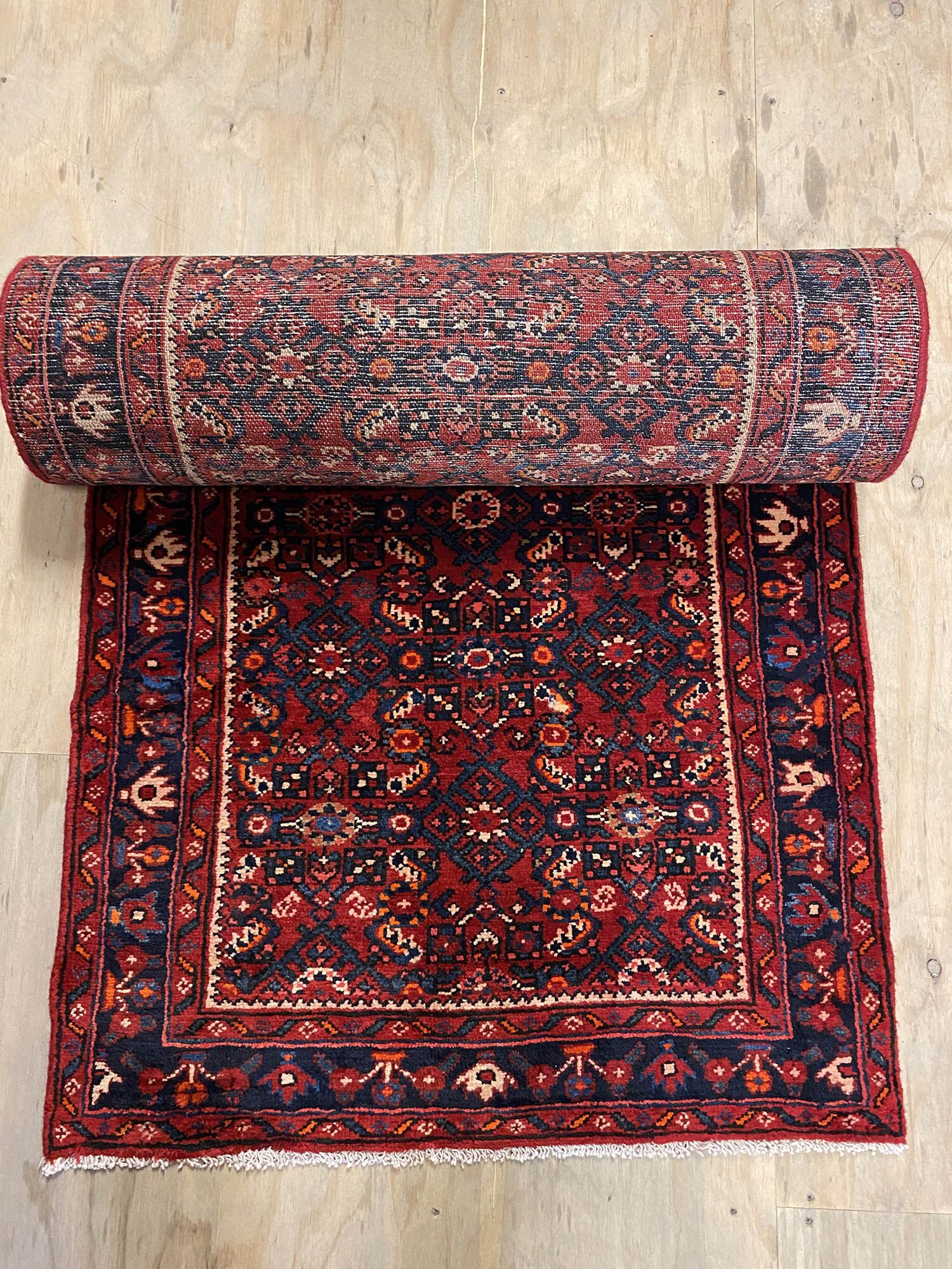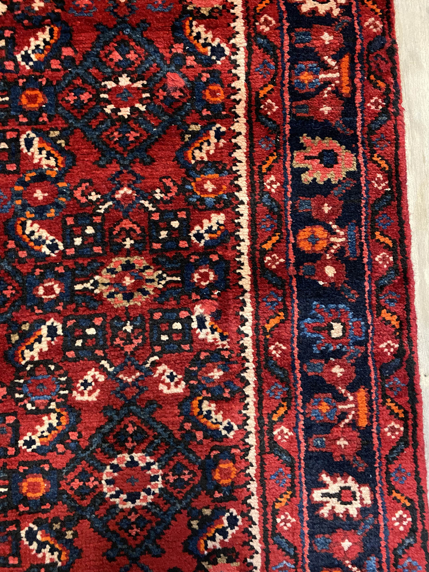 Hosseinabad Design Handmade Persian Hamedan Runner. Above All It Is Hard Wearing & Durable Runner. It Also Has Pure Hand Spun Wool Pile On Cotton Base. Gorgeous Red Background Dyed Using Traditional Methods.