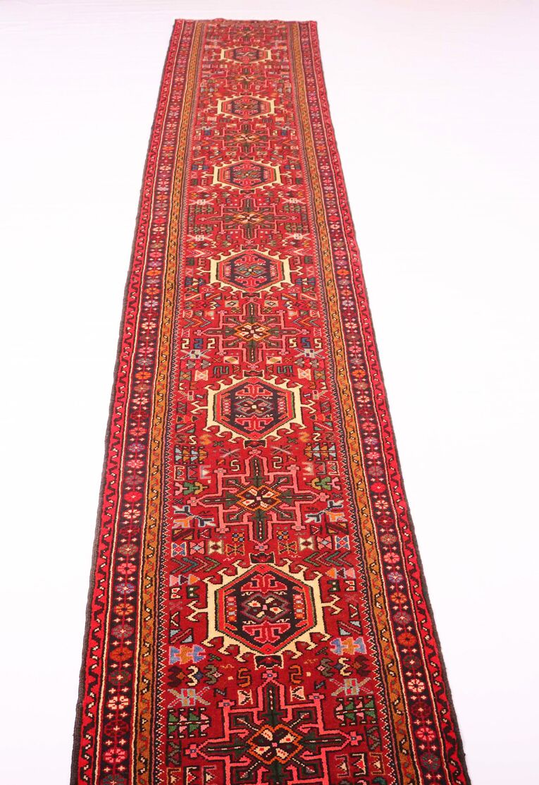 – Rare Oversize Beauty: Transform your space with this rare oversize and heavy-quality Persian Qarajeh Hall Runner, a unique find with a length of over 4m. The runner boasts a pure hand-spun wool pile on a cotton base, featuring beige and salmon pink tones dyed using traditional methods.