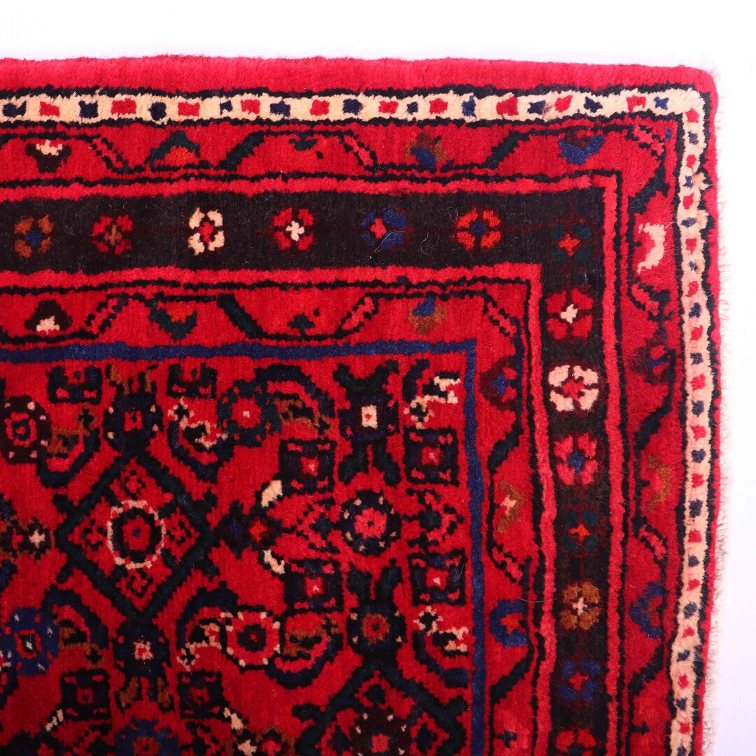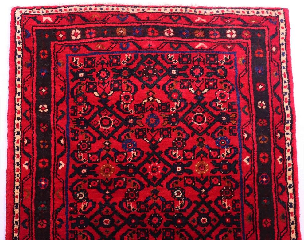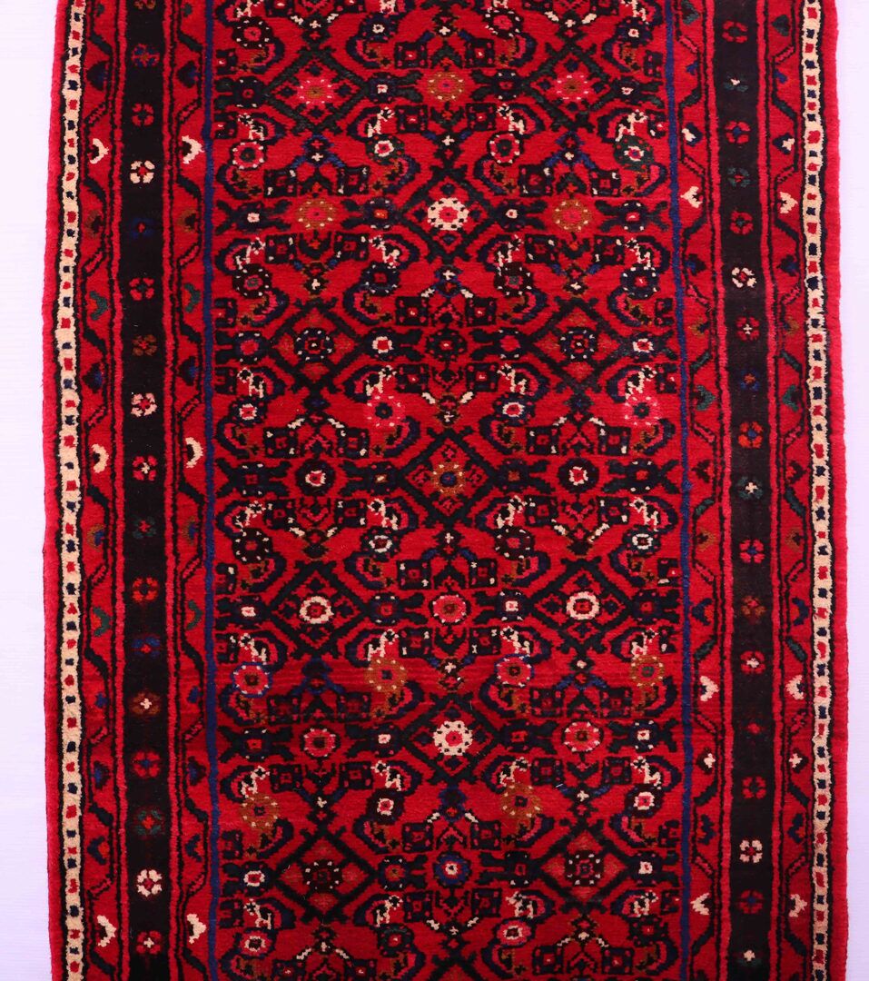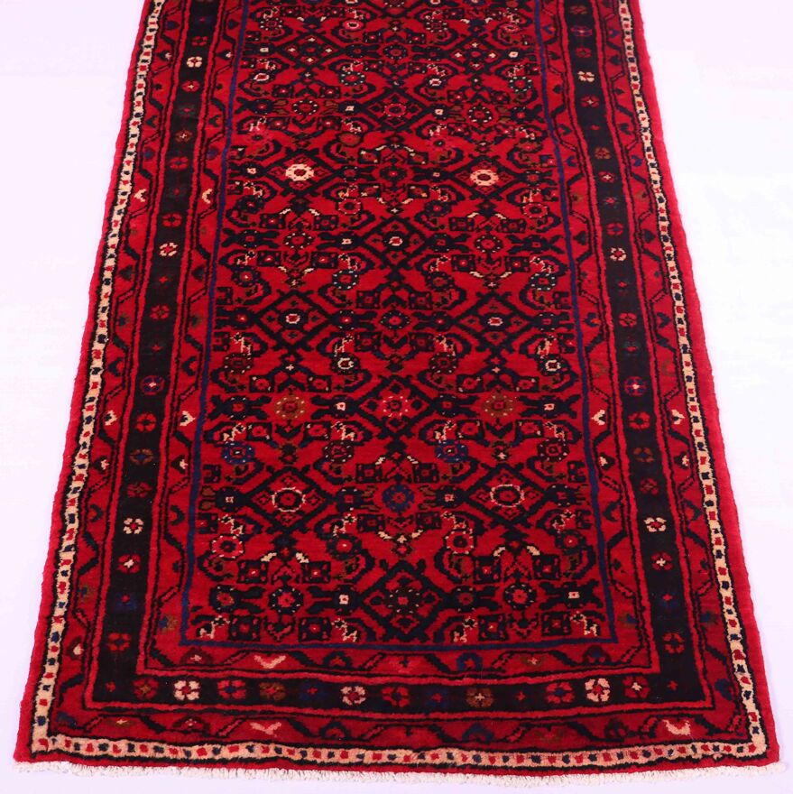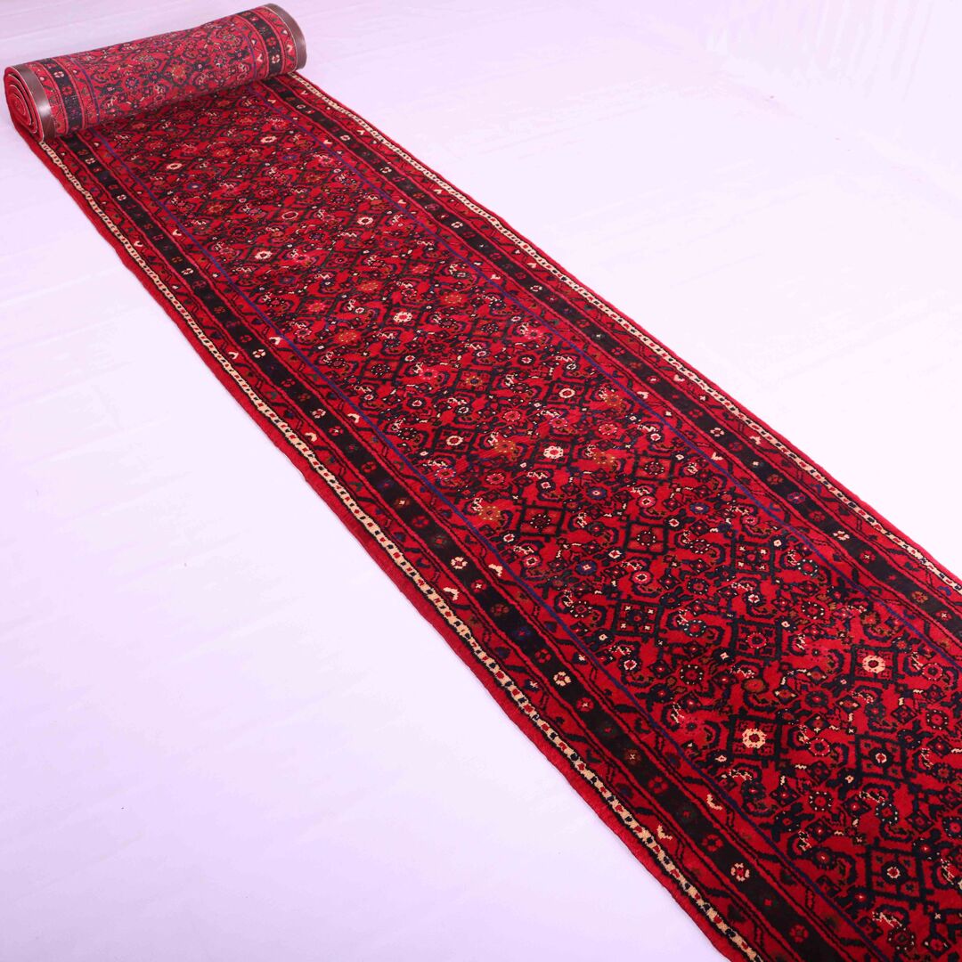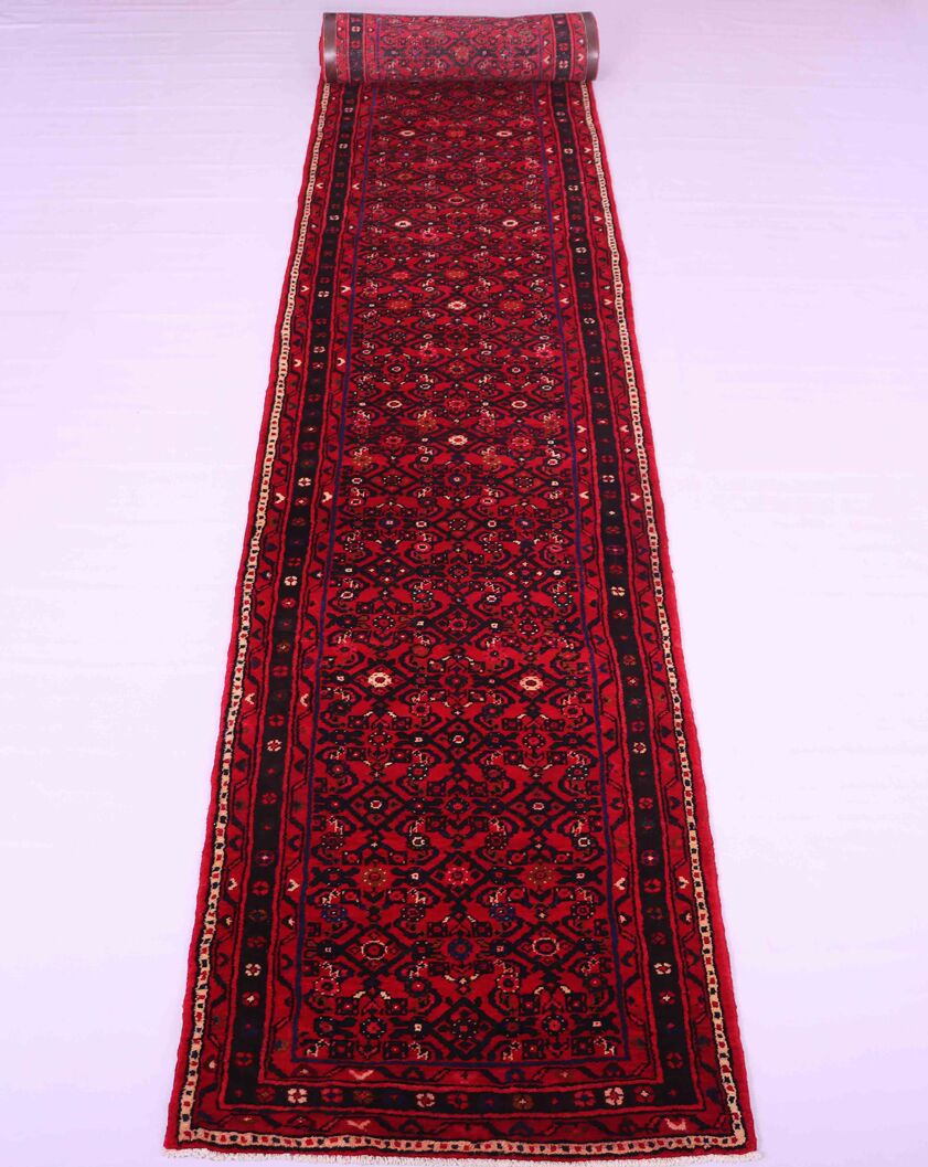 Hosseinabad Design Handmade Persian Hamadan Runner. Above All It Is Hard Wearing & Durable Runner. It Also Has Pure Hand Spun Wool Pile On Cotton Base. Gorgeous Red Background Dyed Using Traditional Methods.