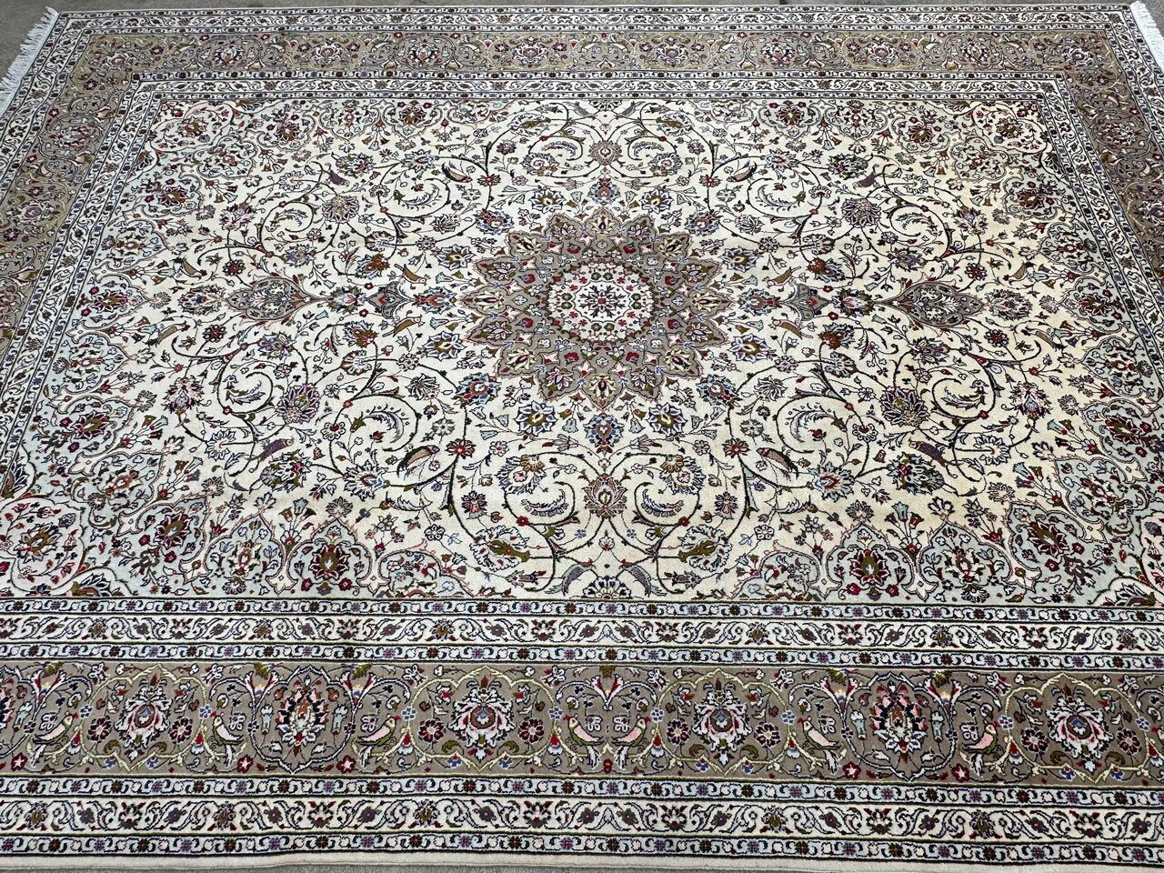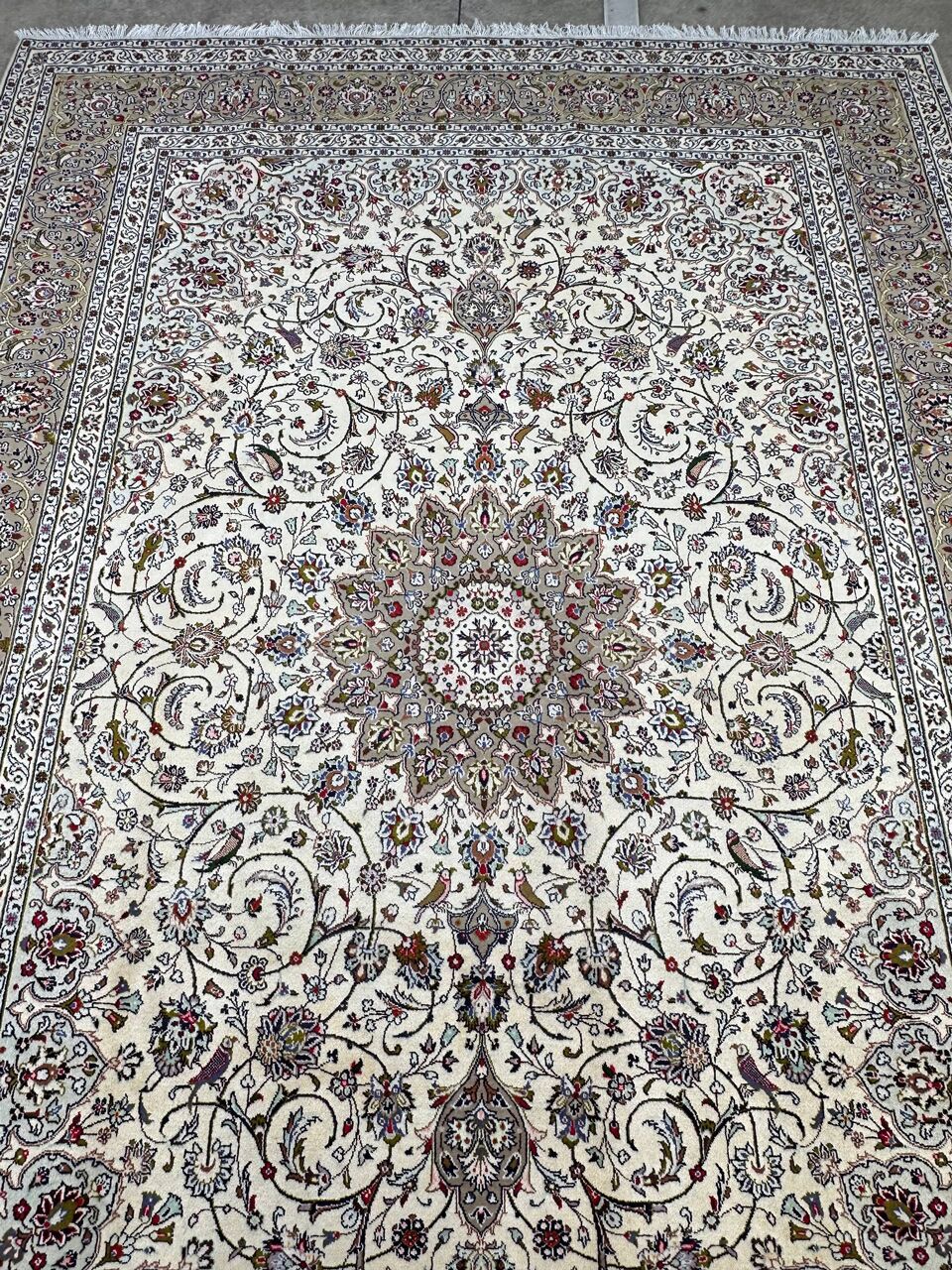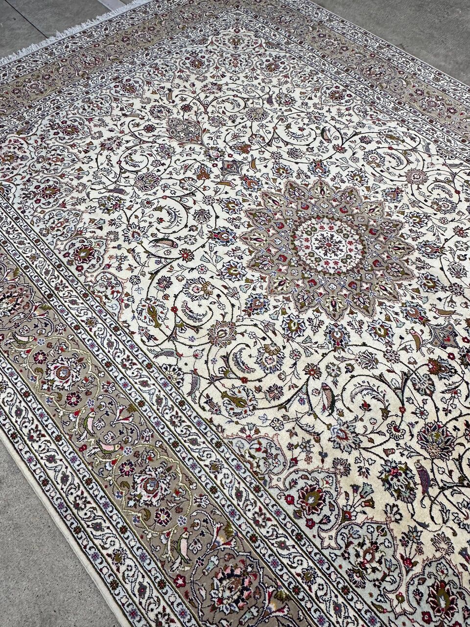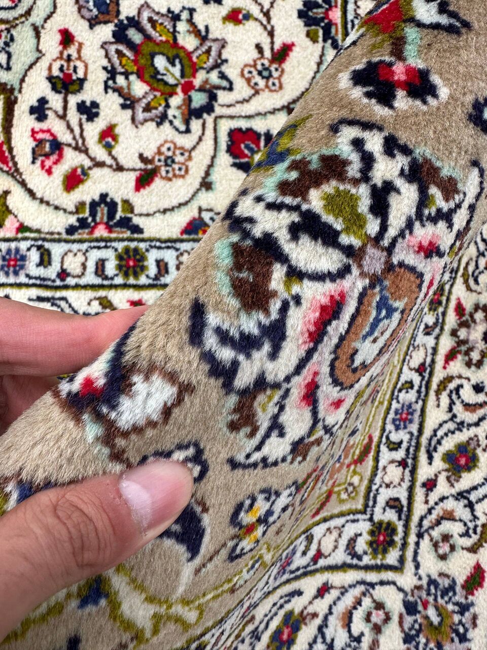 – Timeless Elegance: Immerse yourself in the timeless elegance of this room-size Persian Kashan rug. A rare gem, it features a pure lamb’s wool pile on a cotton base, dyed in beige and pistachio tones using traditional methods.