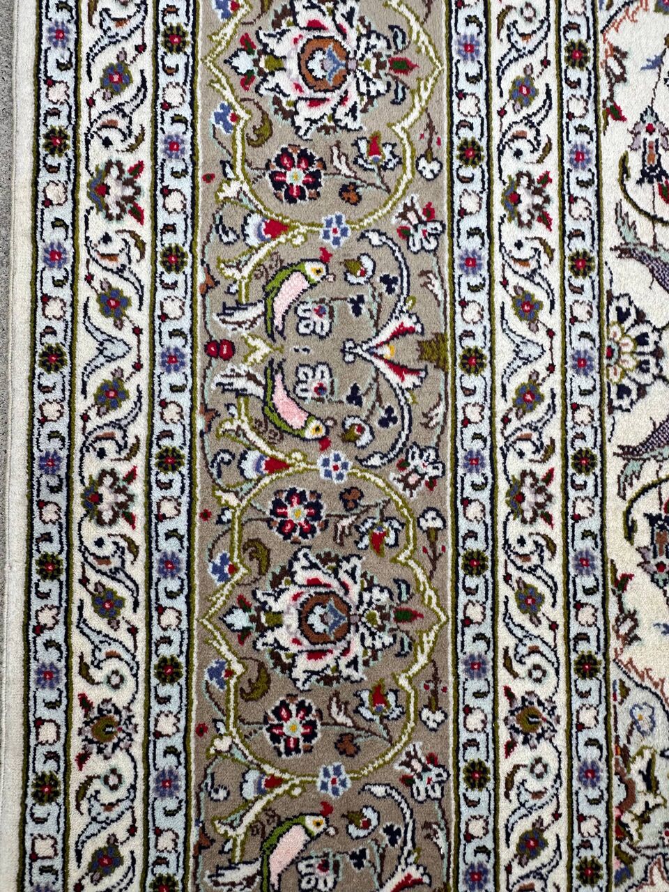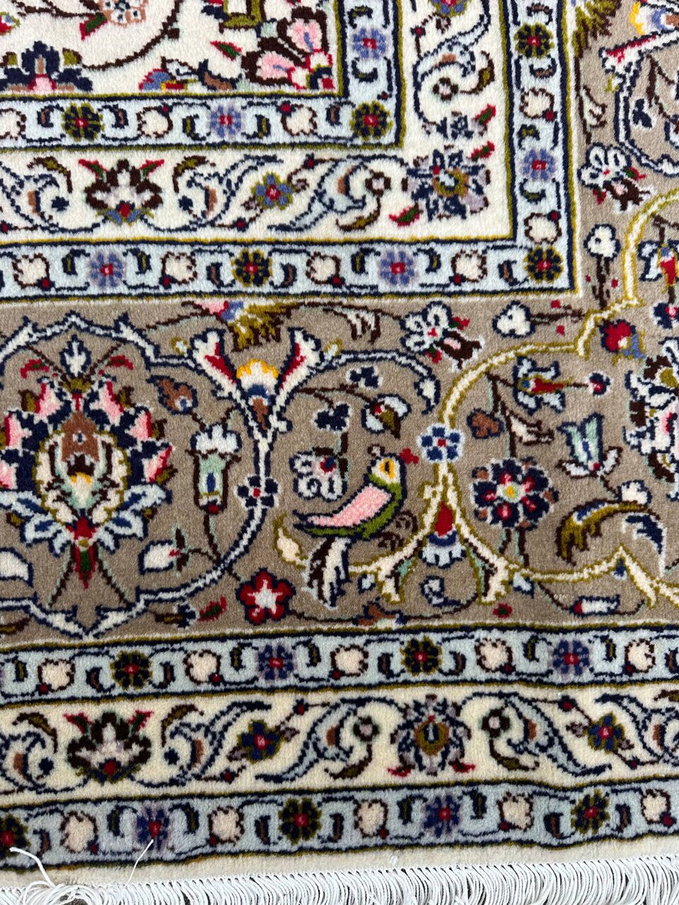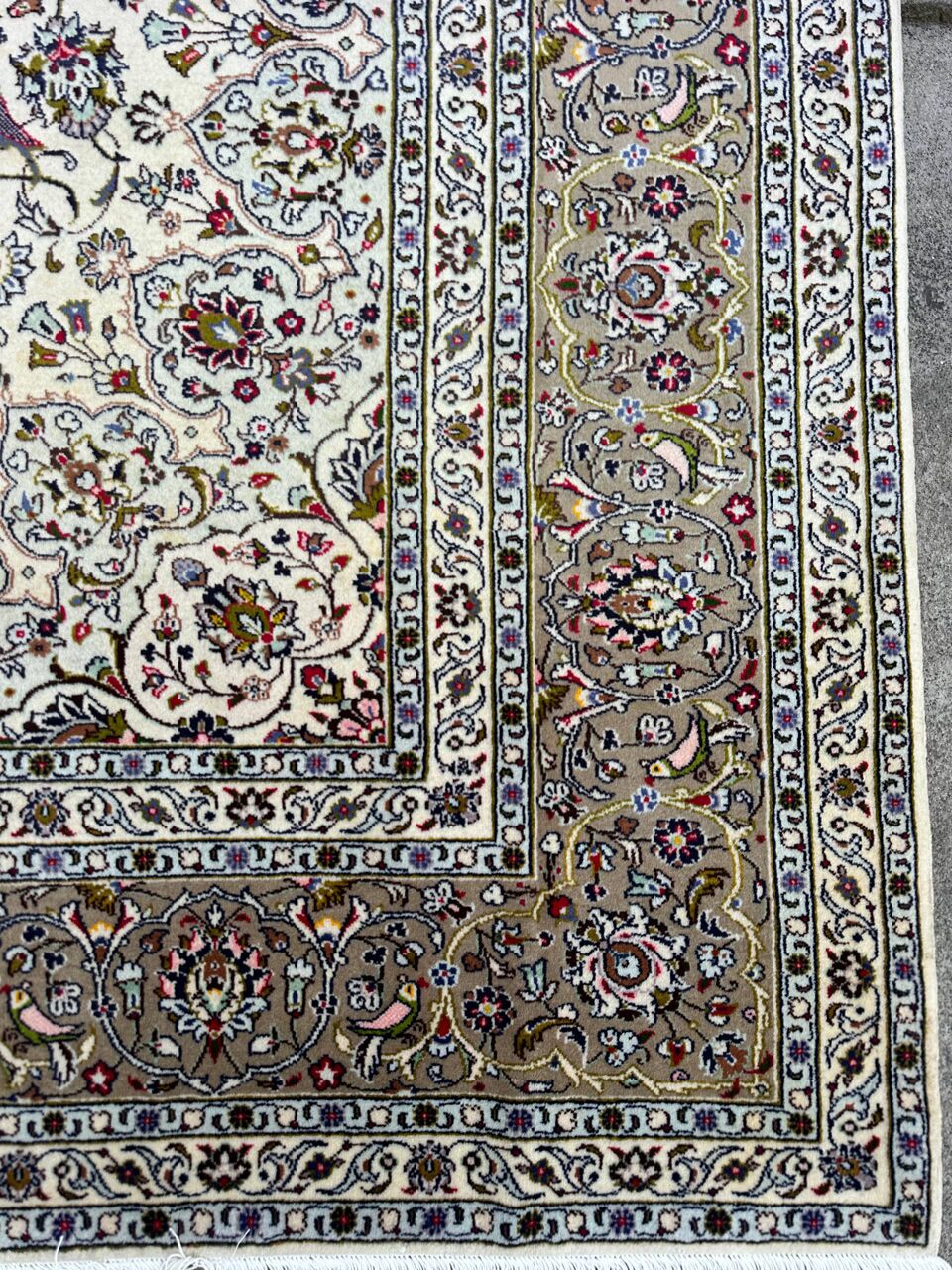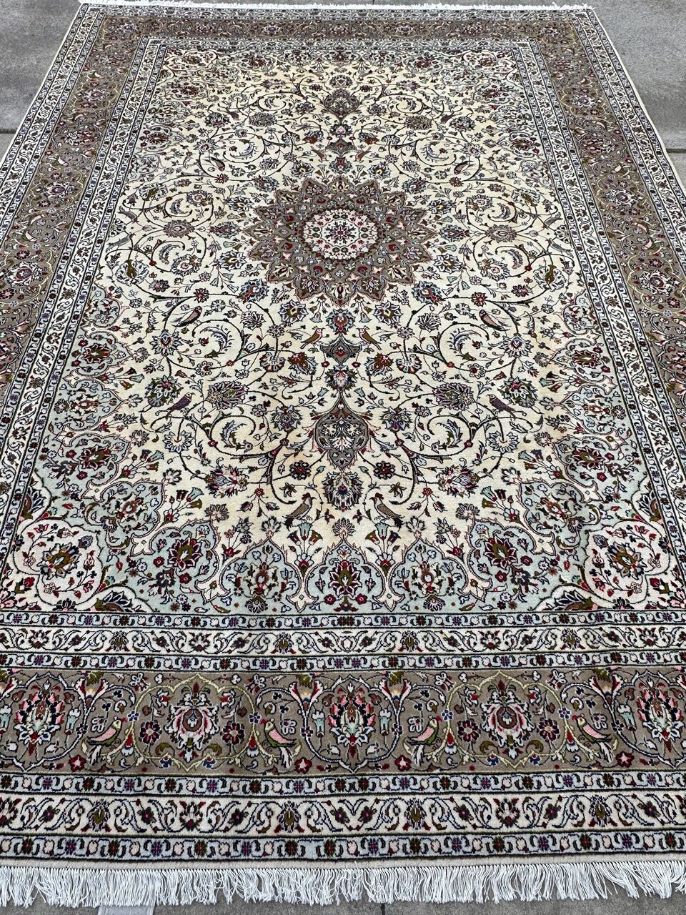 – Timeless Elegance: Immerse yourself in the timeless elegance of this room-size Persian Kashan rug. A rare gem, it features a pure lamb’s wool pile on a cotton base, dyed in beige and pistachio tones using traditional methods.