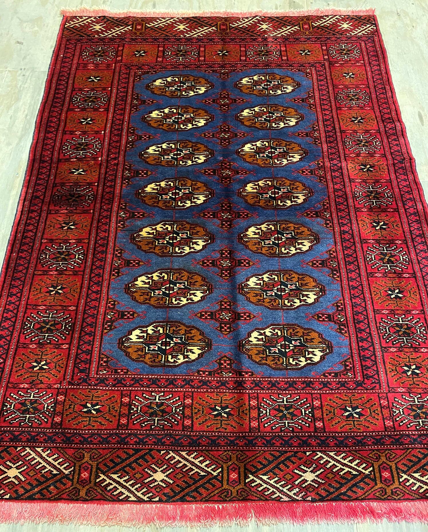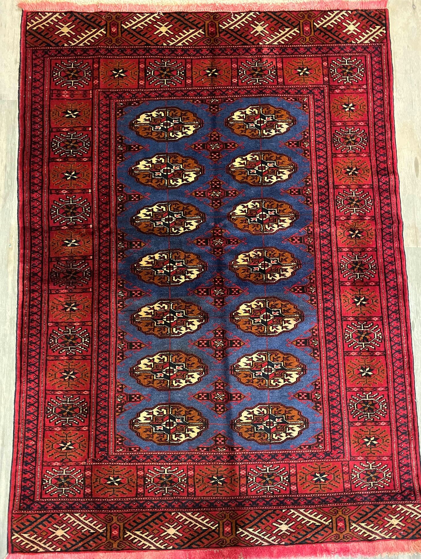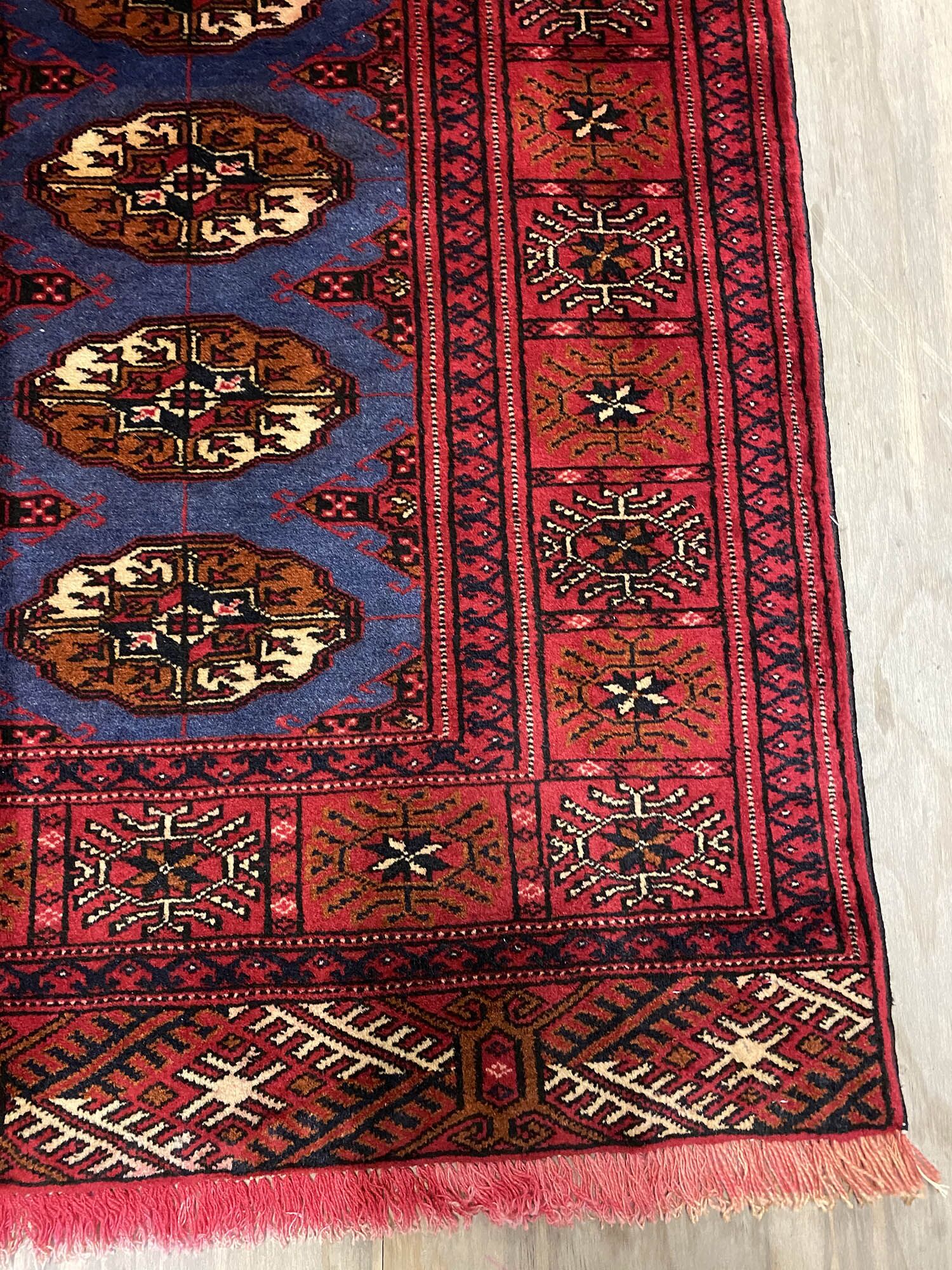 Discounted Hand Knotted Tribal Bokhara Turkoman Rug. Above All It Is Pure Hand Spun Wool Pile On Wool Base. It Also Has Rare Indigo Blue And Red Tone Dyed Using Traditional Methods.