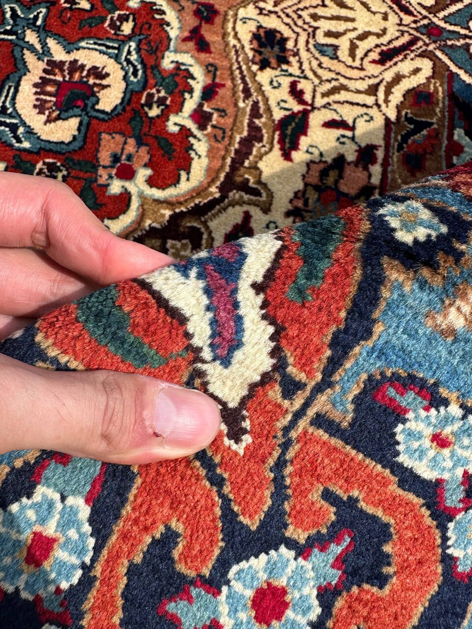 – Quality Craftsmanship: Crafted with precision, it boasts a pure lamb’s wool pile on a cotton base. The indigo blue background is dyed using traditional methods.