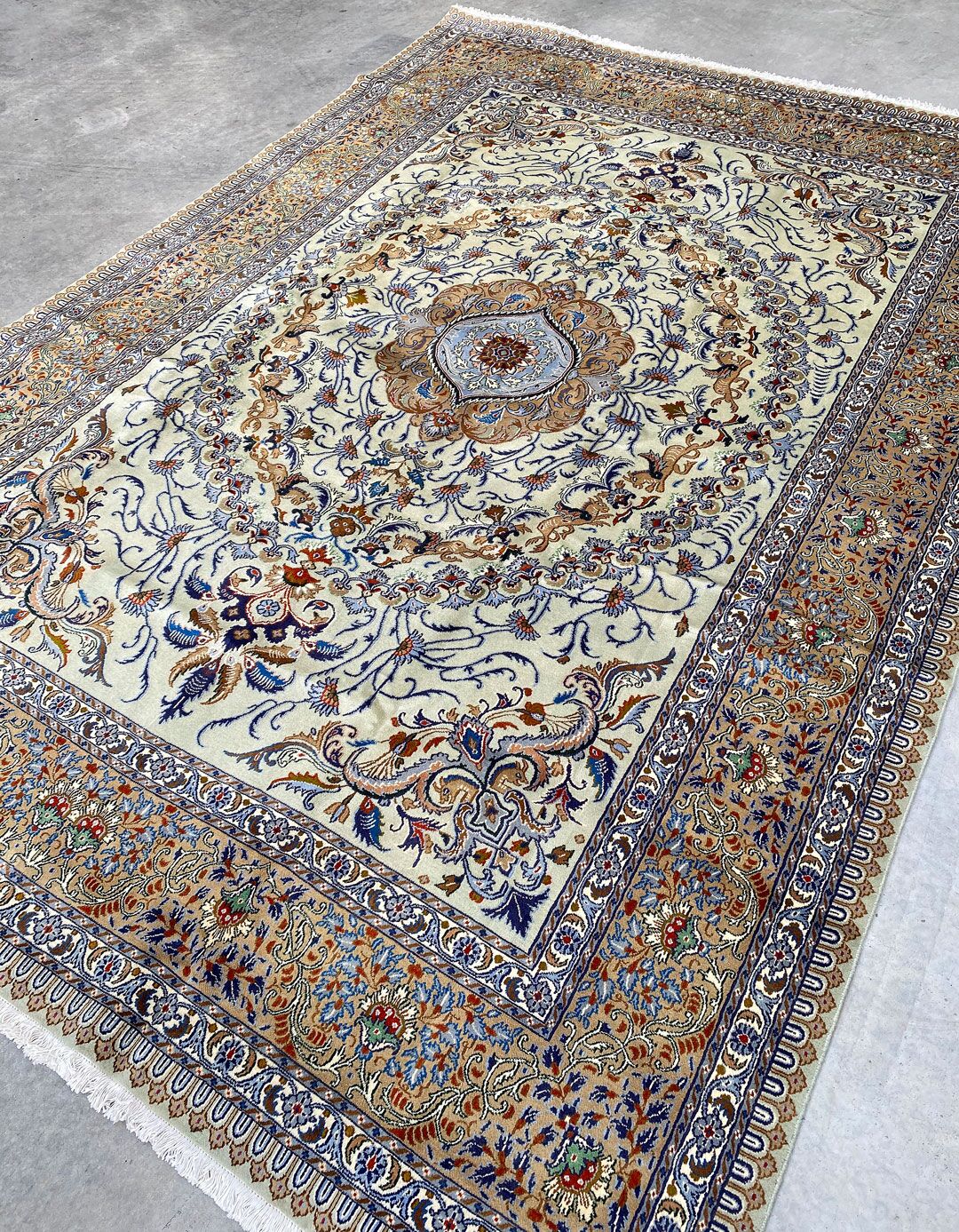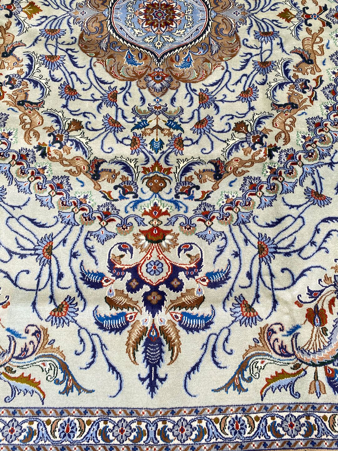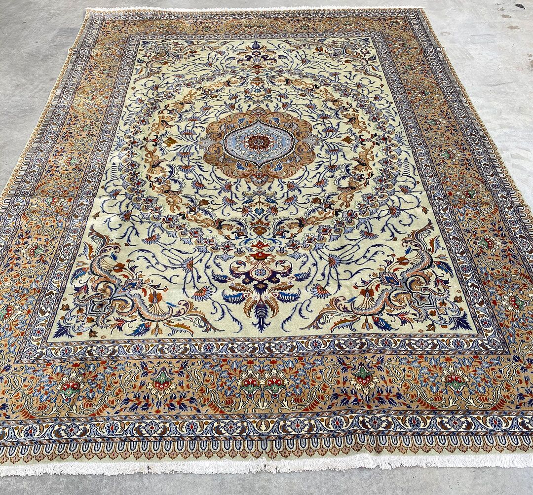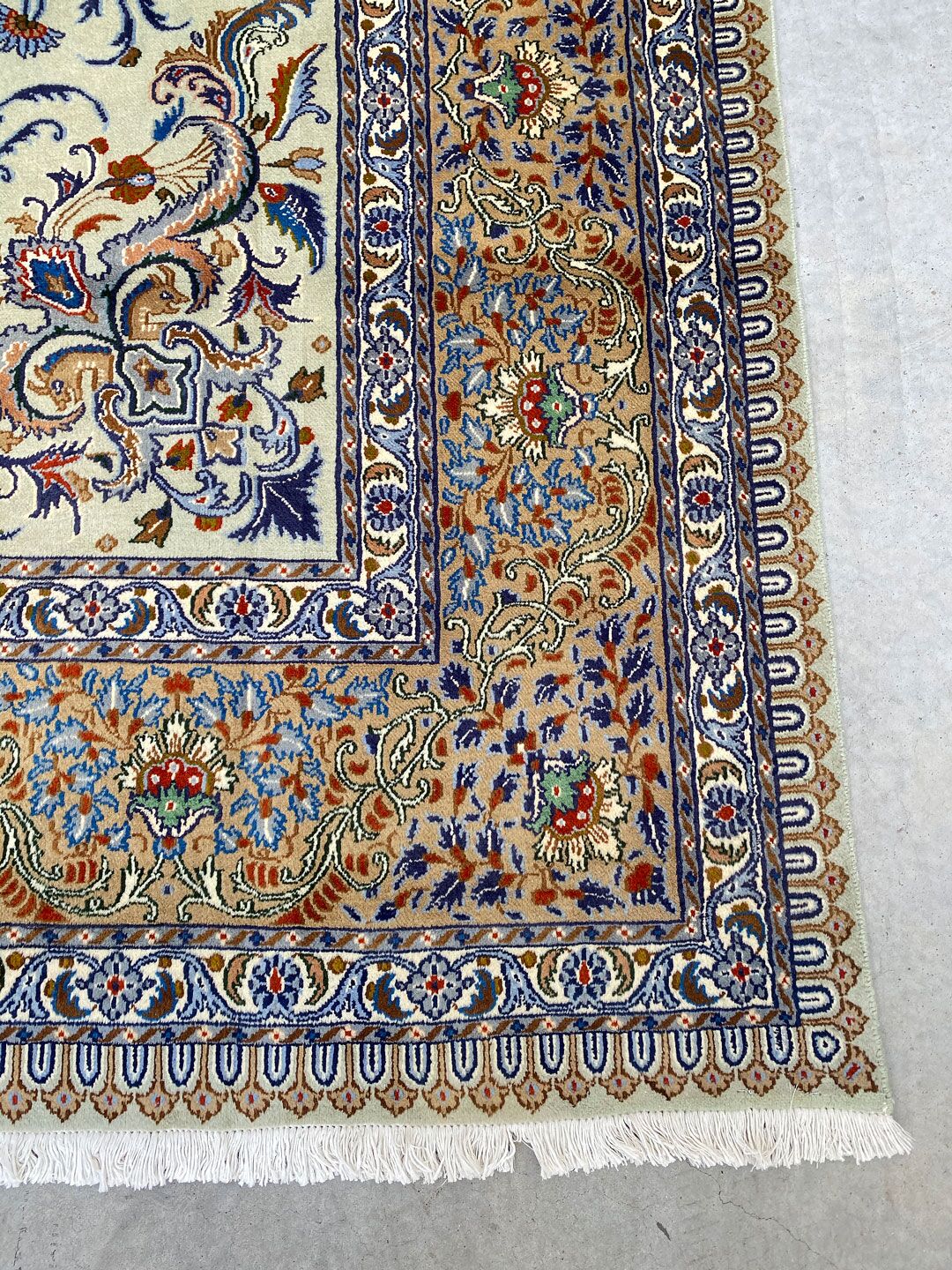 – Masterpiece Full Room Size Hand Knotted Birjand Rug: A rare find in larger sizes, featuring a pure lamb’s wool pile on fine cotton. The unique pistachio tone on the background, along with beige and blue colors dyed using traditional methods, adds to its fine quality.
