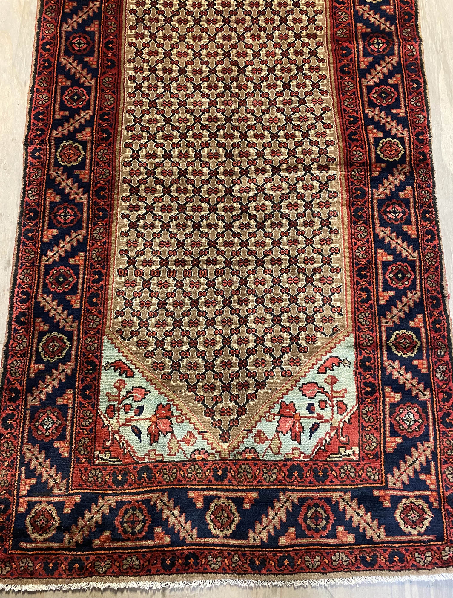 Rare Vintage Hand Knotted Kurdish Koliai Runner. Above All It Is Hard To Find Original Handmade Rugs From Kurdistan Region. Pure Hand Spun Wool Pile On Cotton Base. Light Brown And Green Tone Dyed Using Traditional Methods.