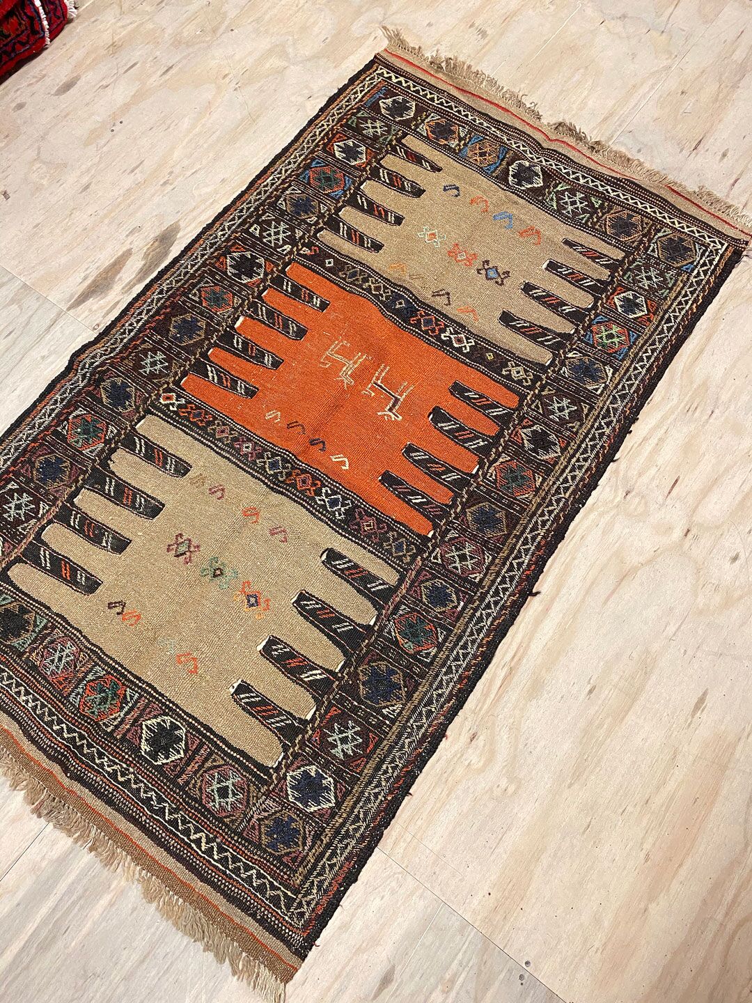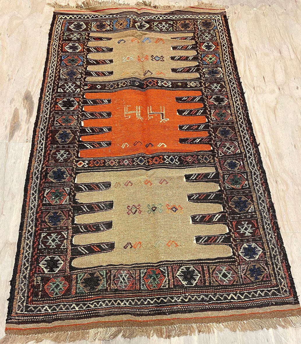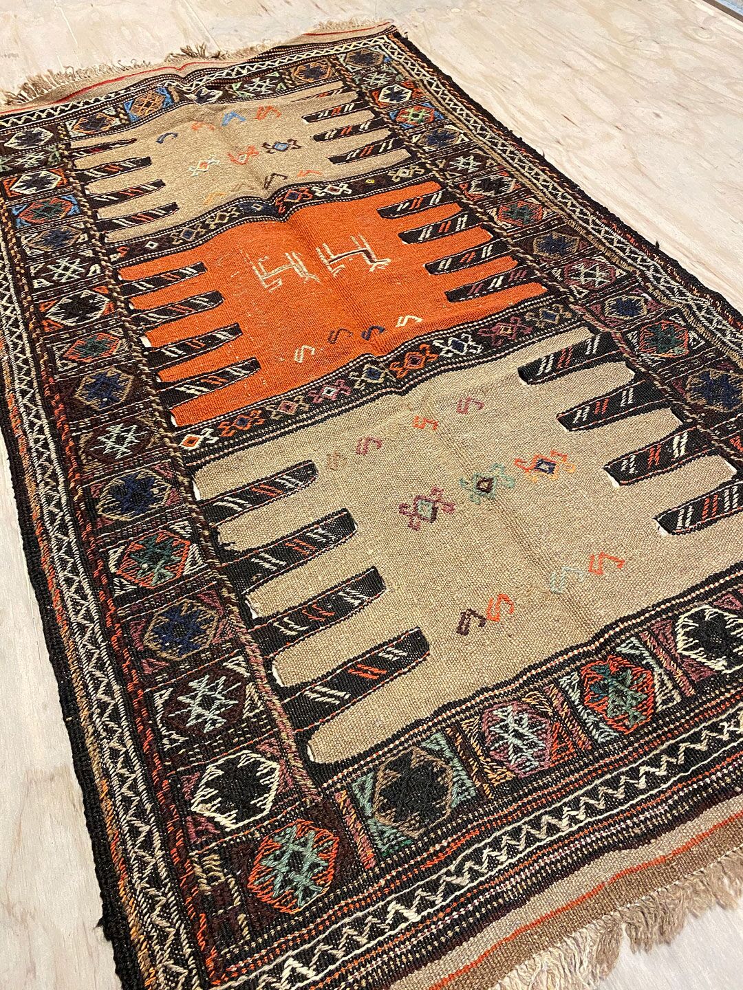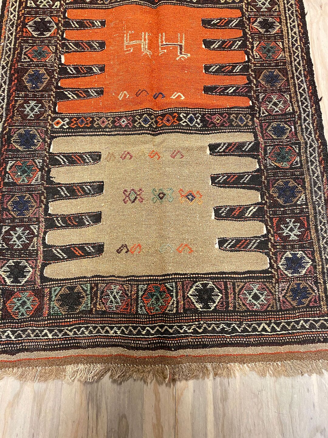– Geometric Design: Experience the elegance of this hand-knotted Persian Sanandaj Kilim rug, a rare and high-quality handmade hall rug from Kurdistan.