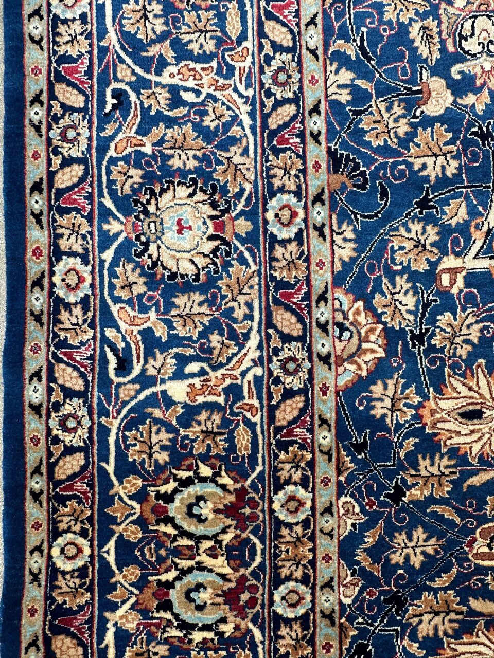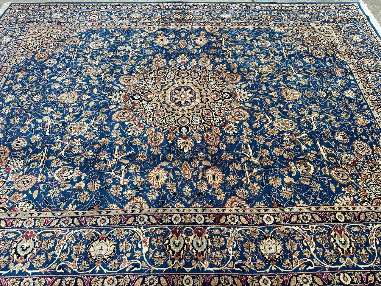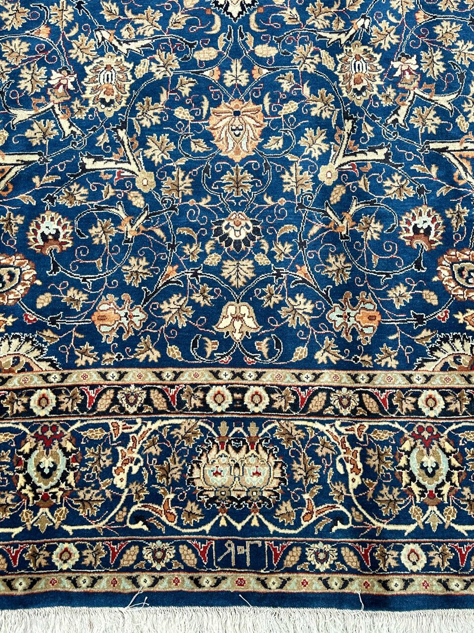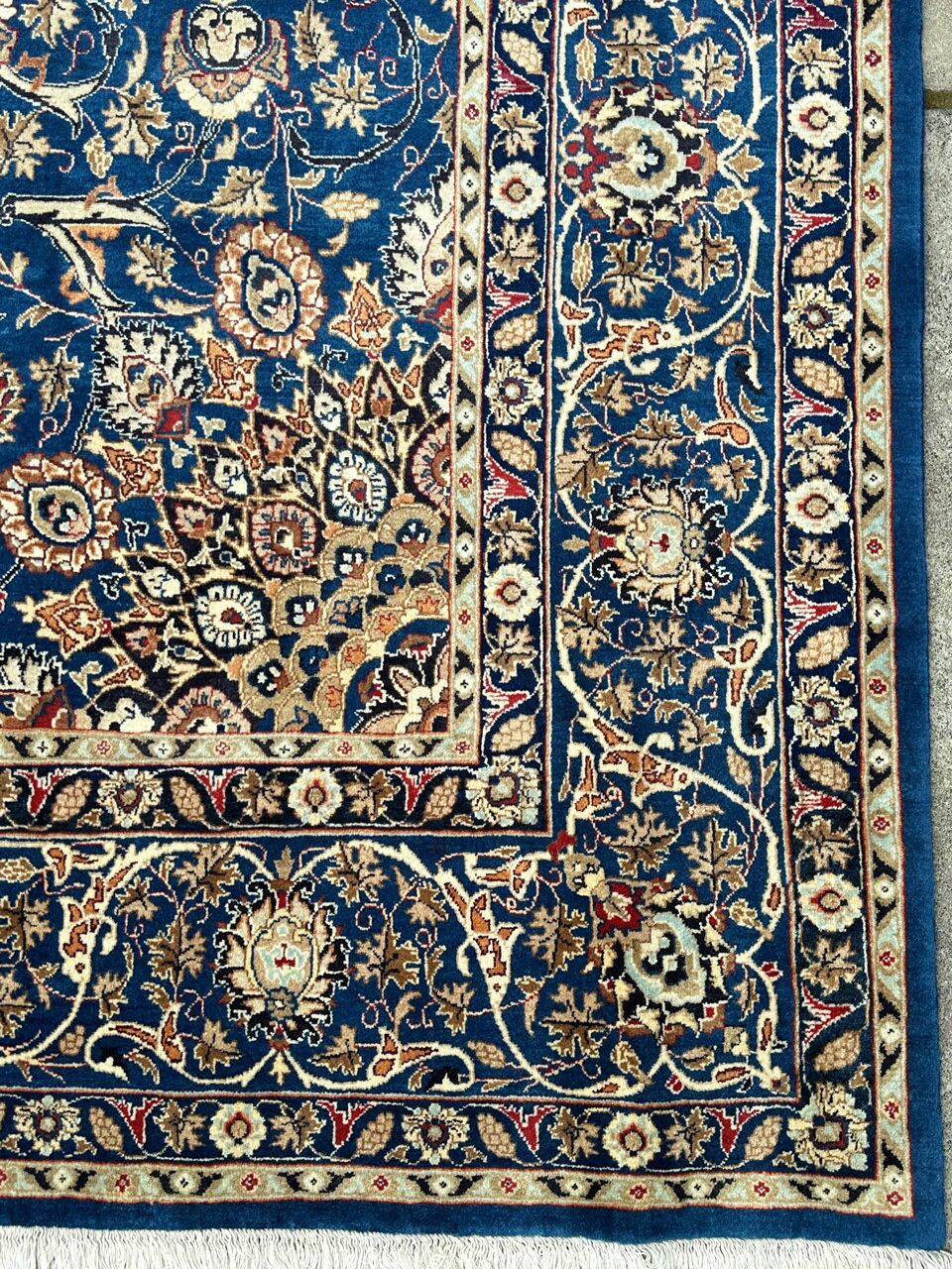 – Exquisite Craftsmanship: Immerse yourself in the amazing craftsmanship of this large room-size authentic handmade Persian Kashmar rug. A rare find, it features pure lamb’s wool pile on a cotton base, dyed in blue, beige, and brown tones using traditional methods.