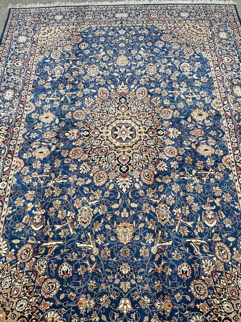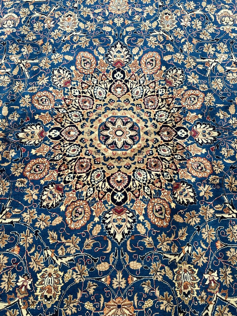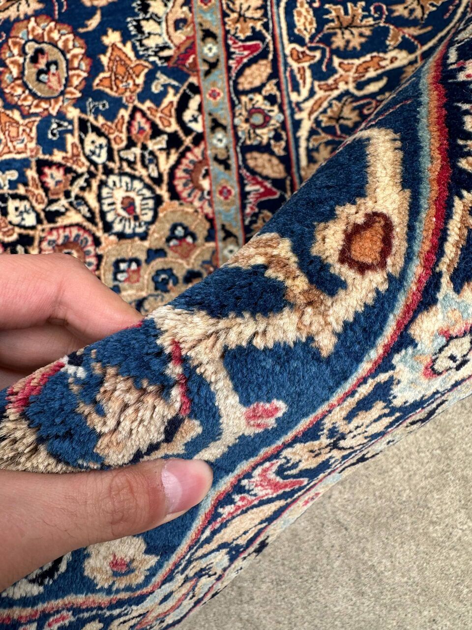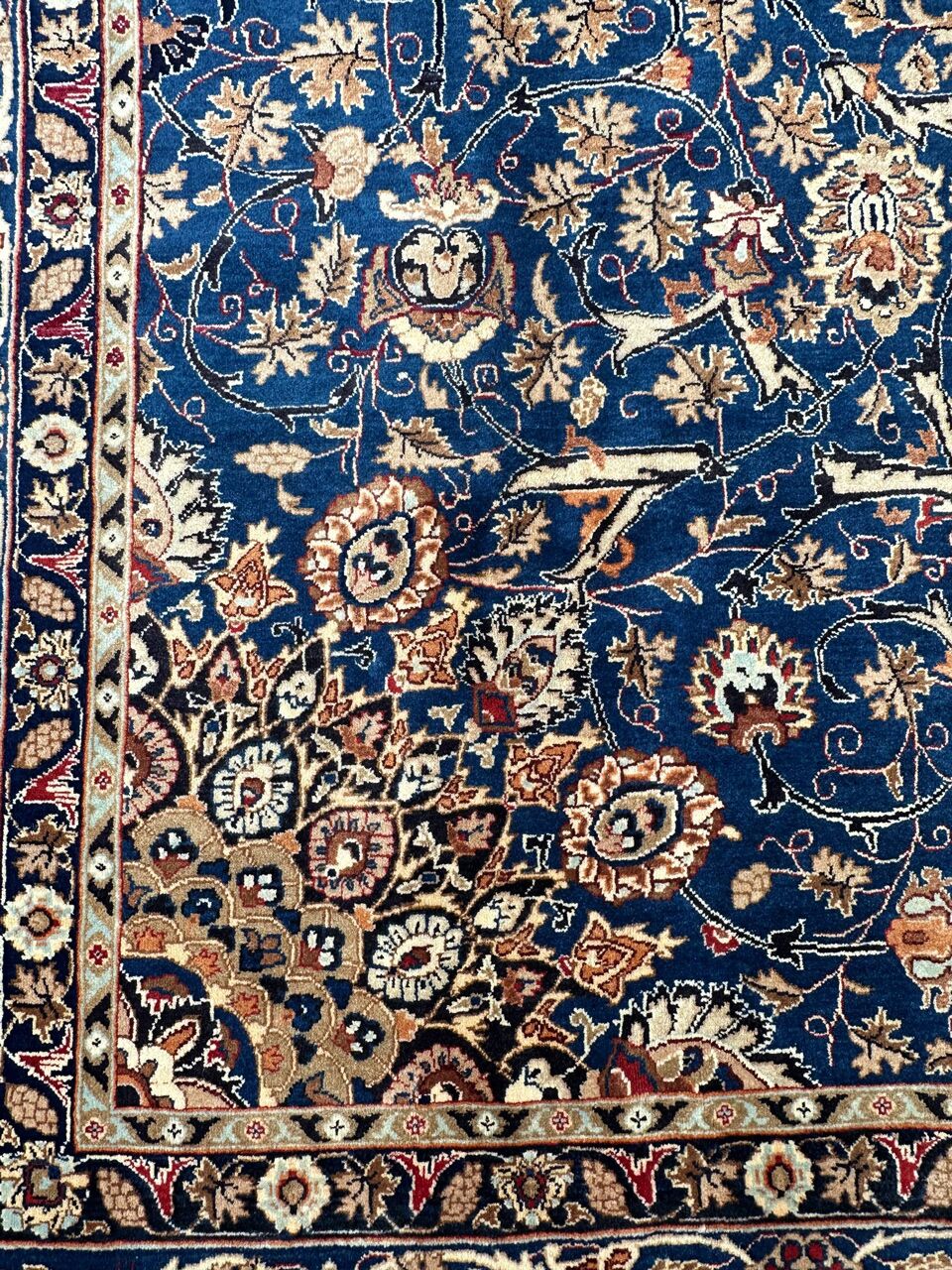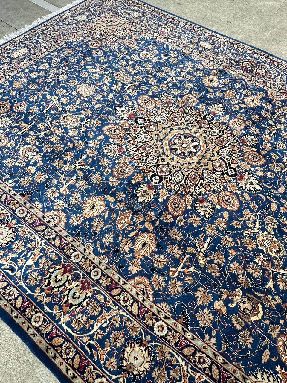 – Exquisite Craftsmanship: Immerse yourself in the amazing craftsmanship of this large room-size authentic handmade Persian Kashmar rug. A rare find, it features pure lamb’s wool pile on a cotton base, dyed in blue, beige, and brown tones using traditional methods.