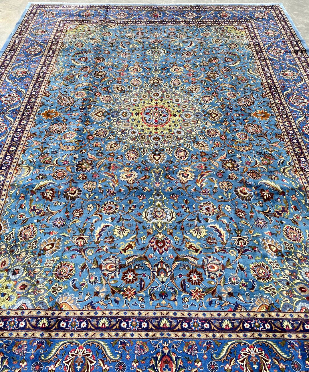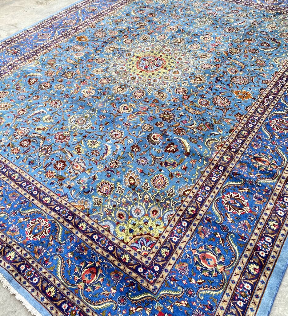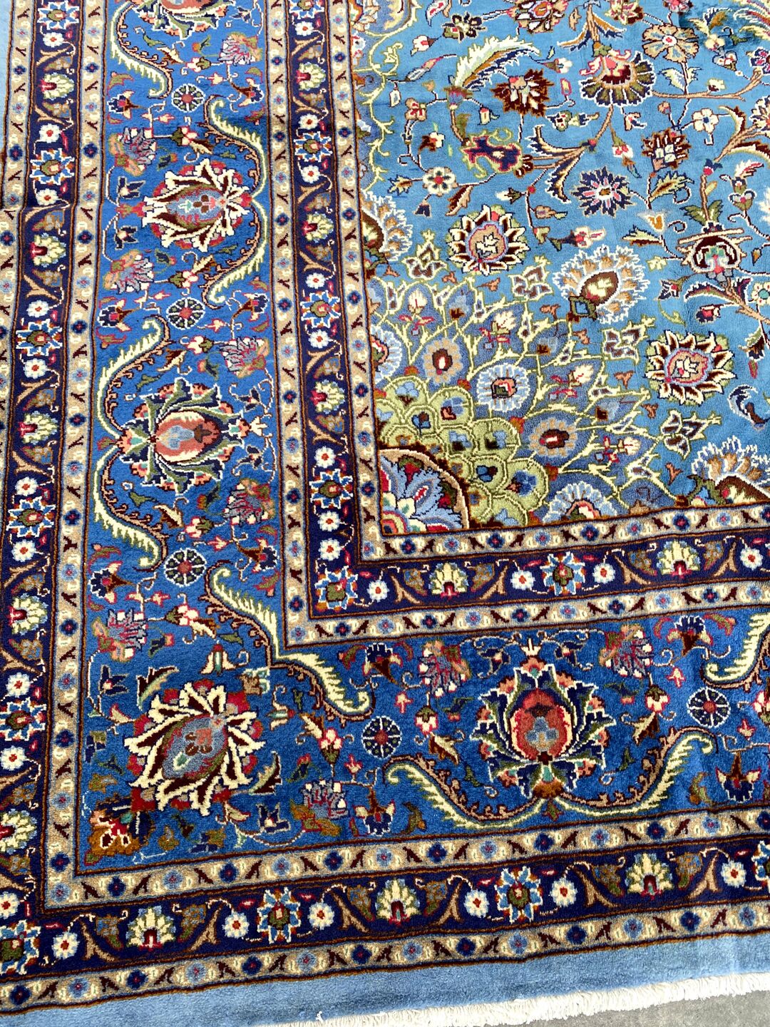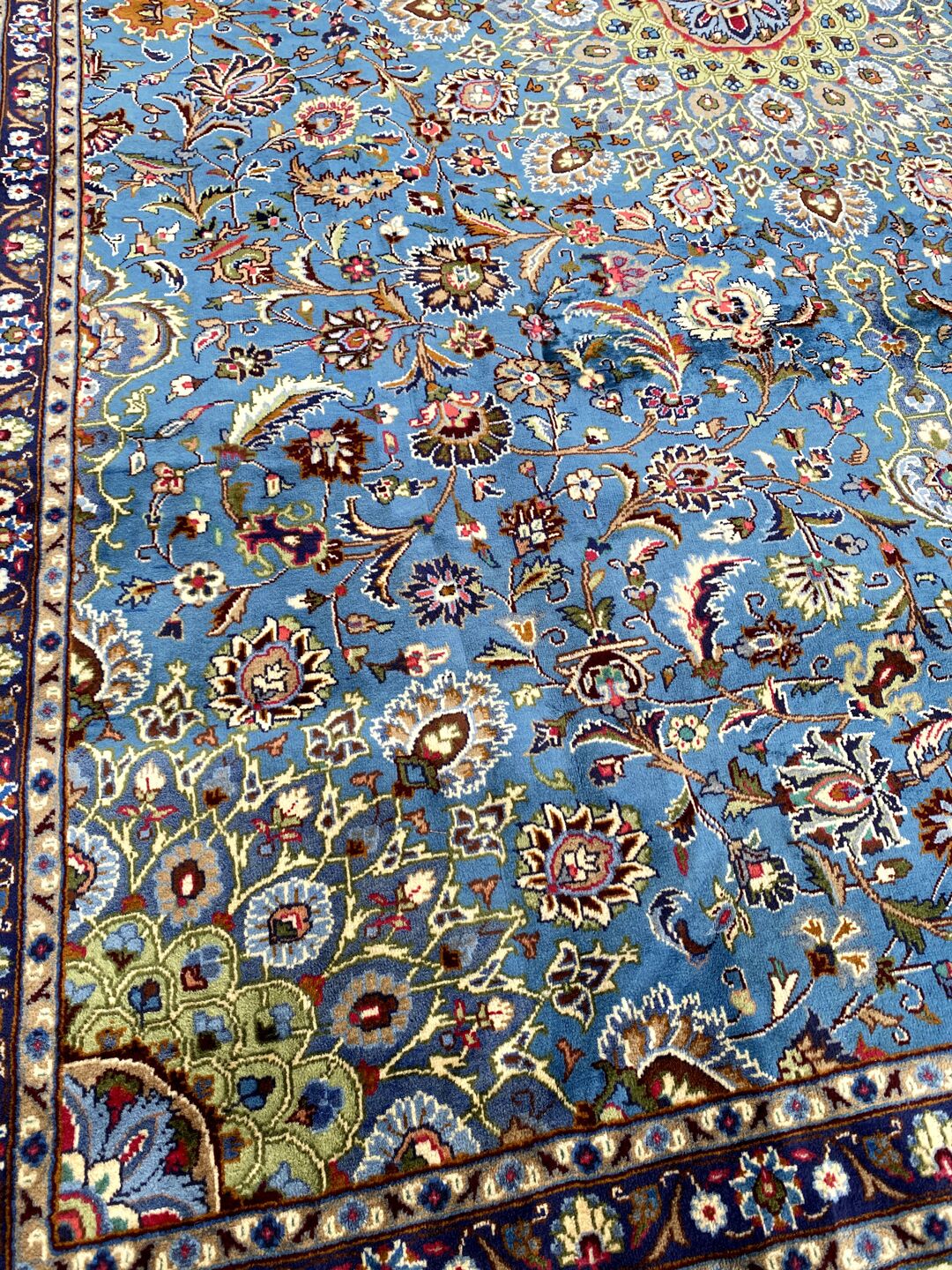 – Rare Find: This amazing Persian Kashmar rug, designed for larger spaces, is a testament to originality and quality that’s hard to find. Crafted with pure lamb’s wool pile on a cotton base.