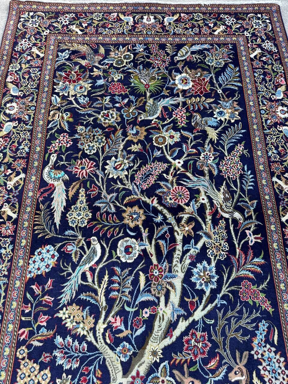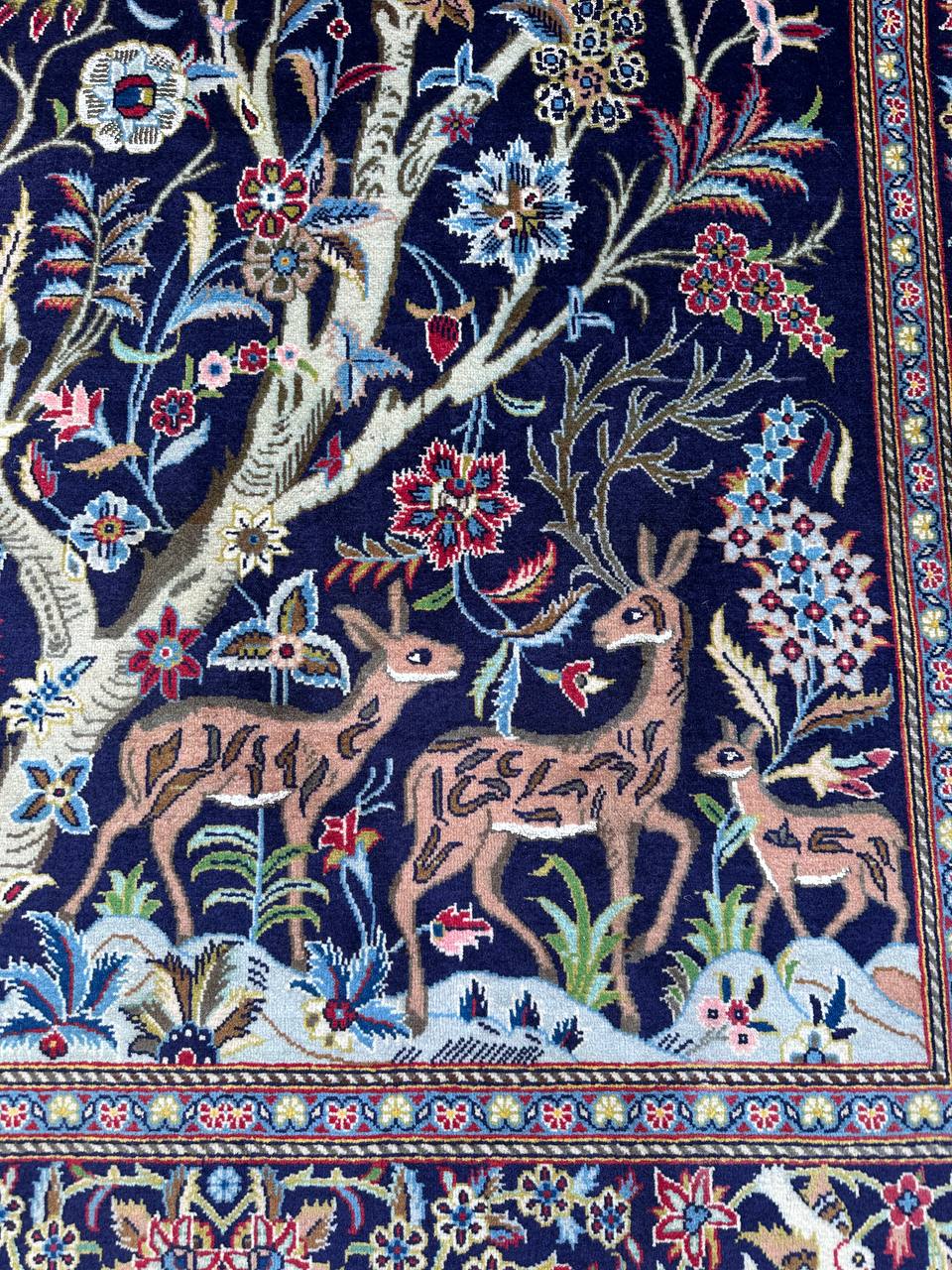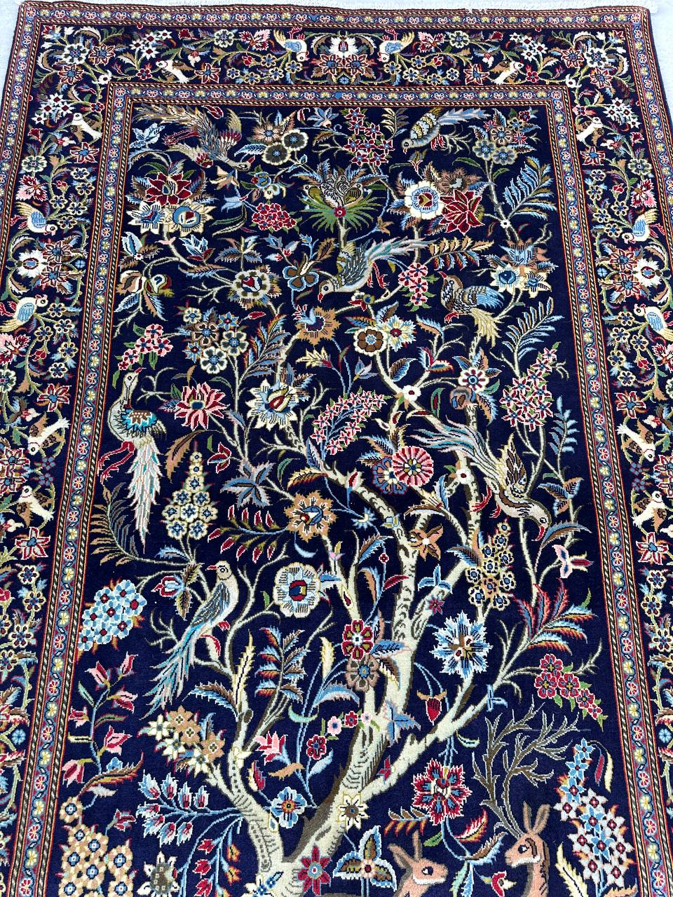– Tree of Life Design: Featuring the classic Tree of Life design set against a deep navy-blue background, this rug symbolizes beauty, harmony, and elegance.