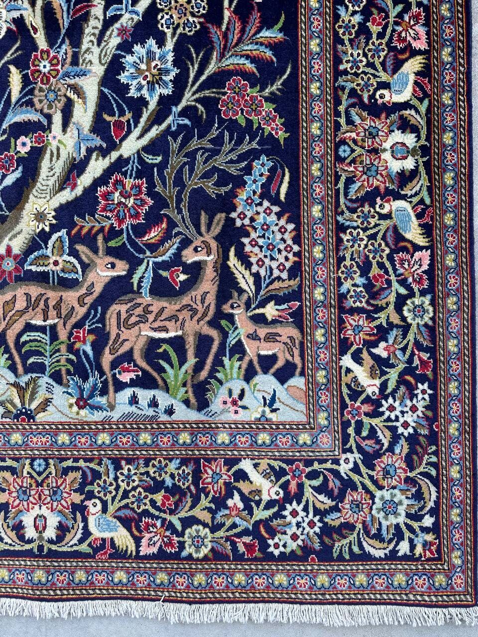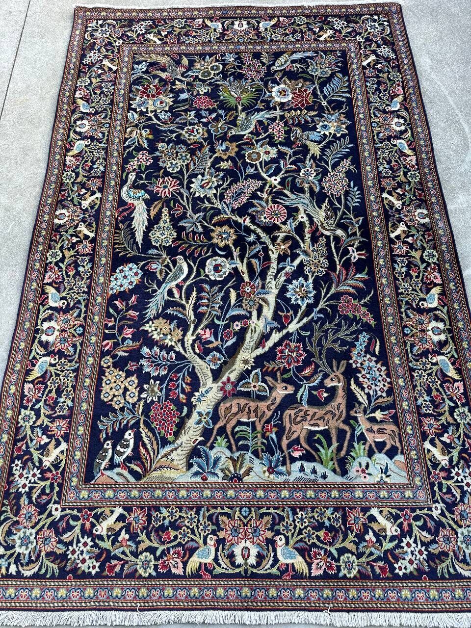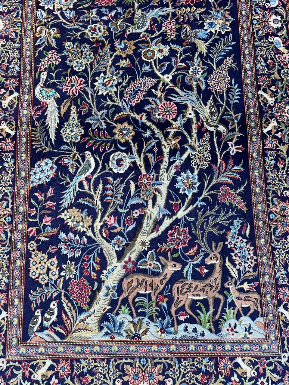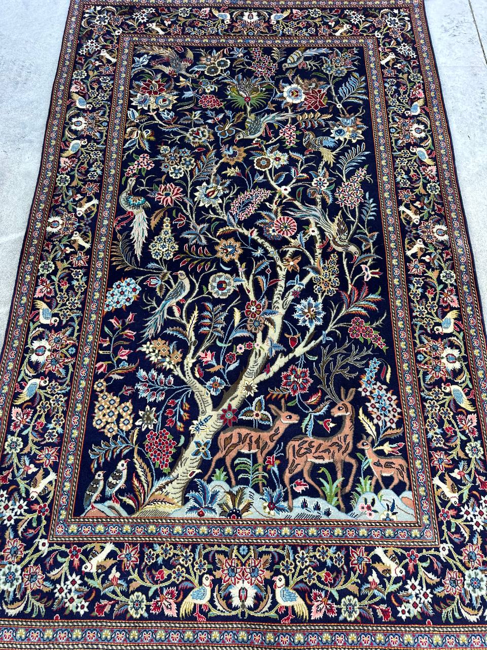 – Tree of Life Design: Featuring the classic Tree of Life design set against a deep navy-blue background, this rug symbolizes beauty, harmony, and elegance.