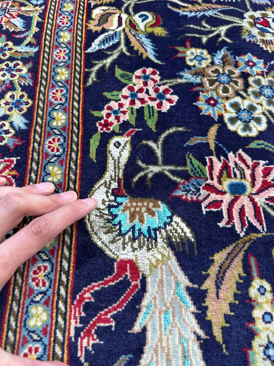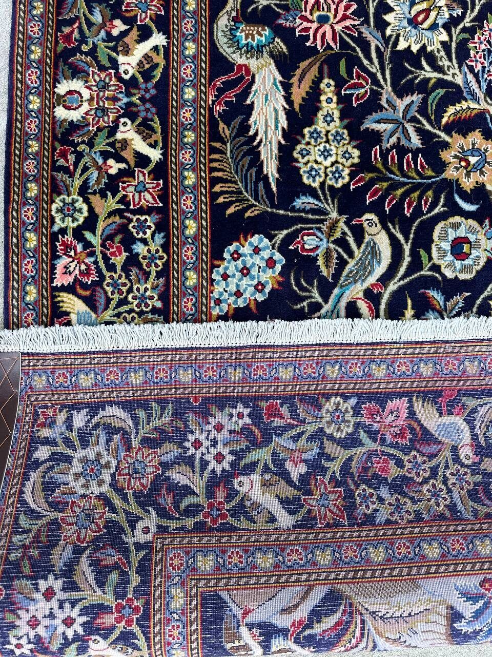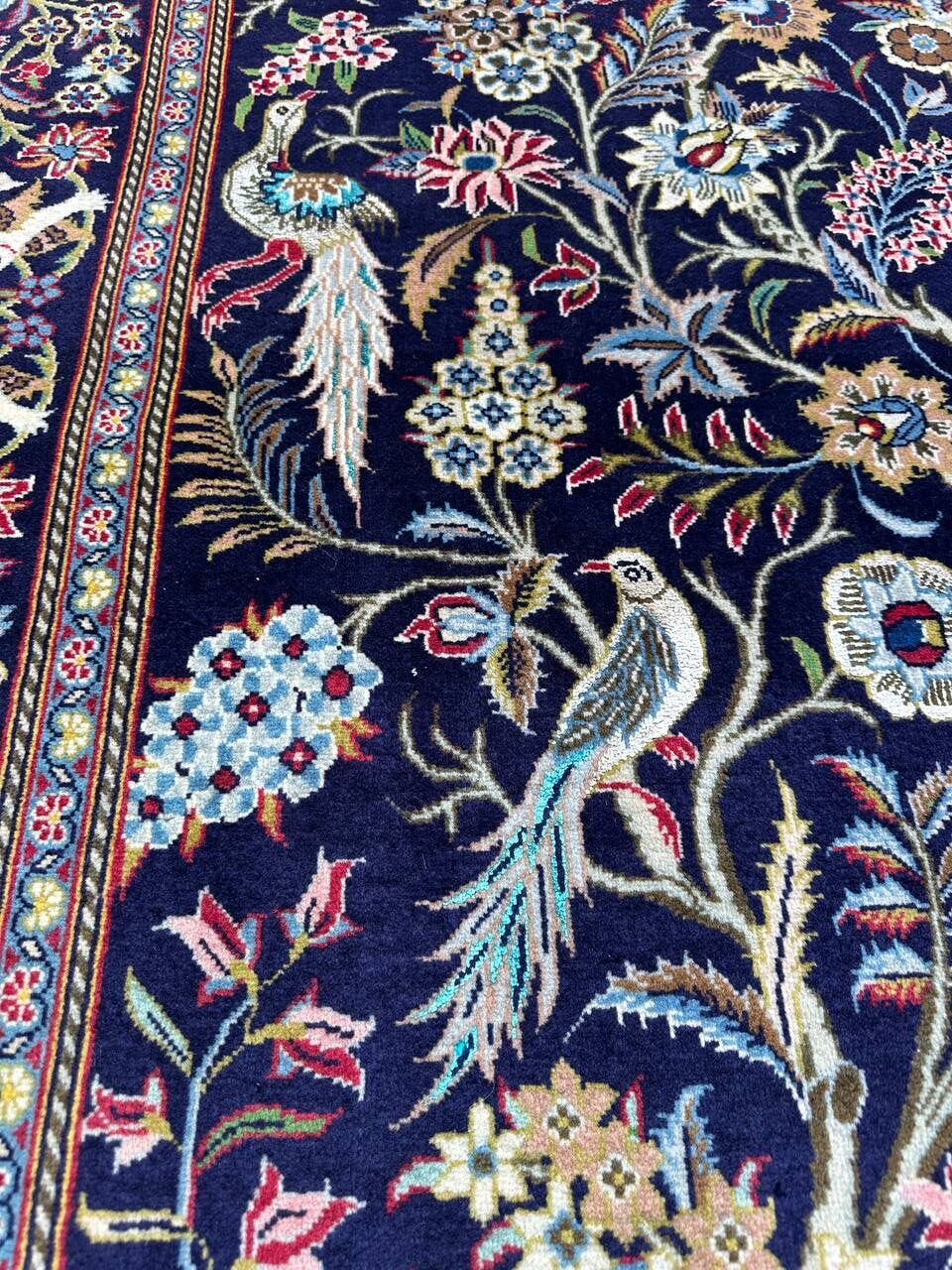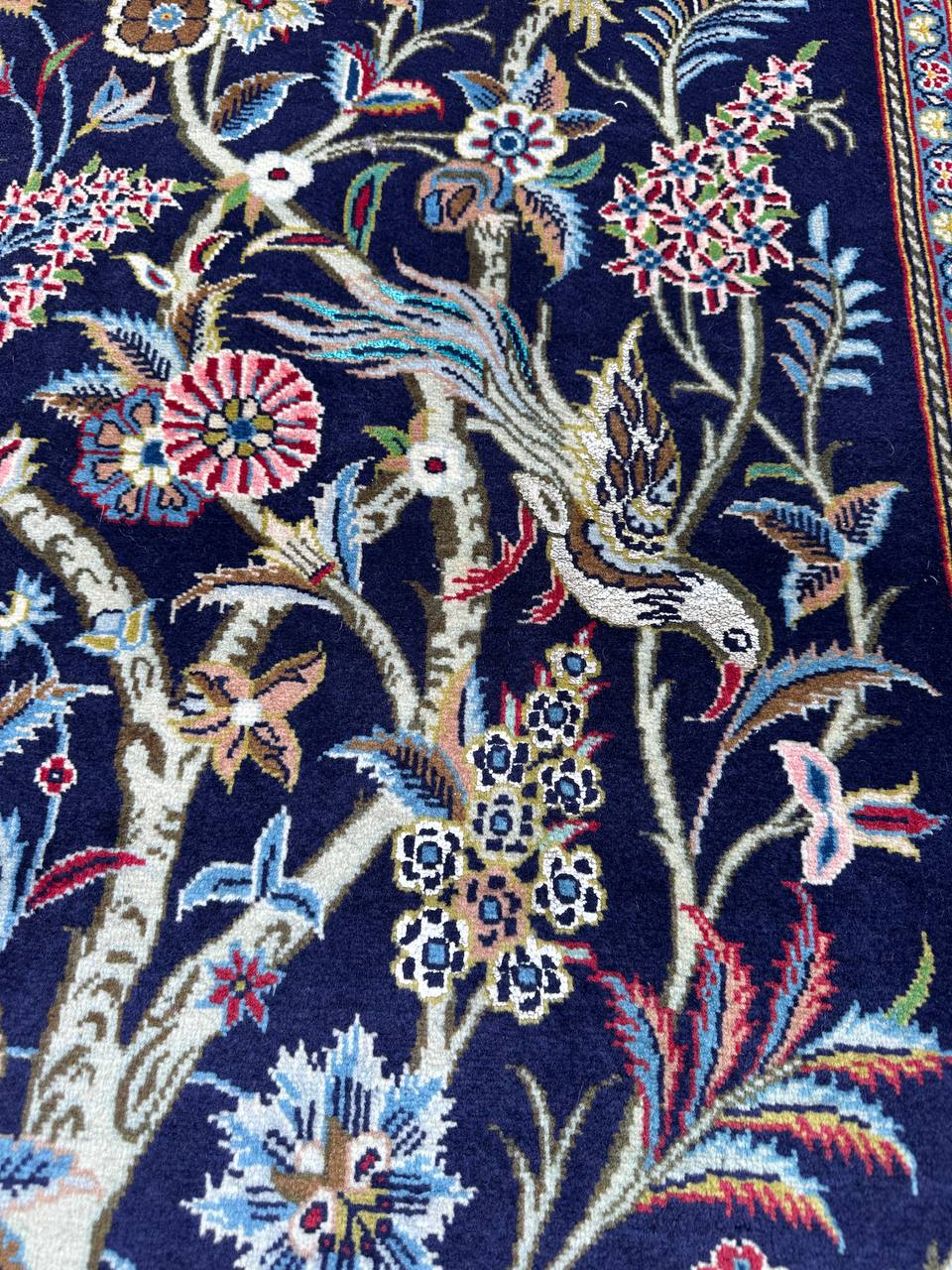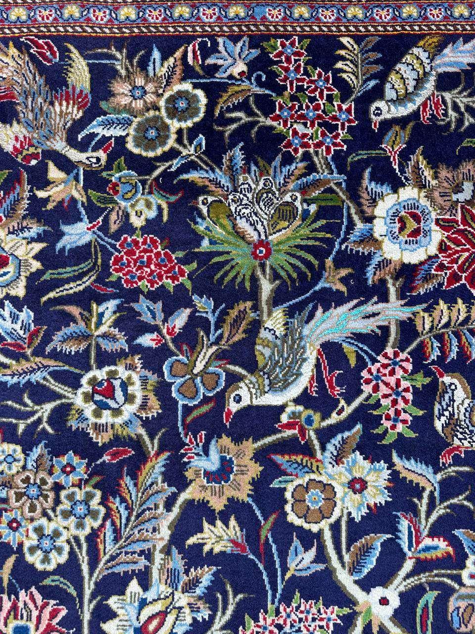 – Exquisite Craftsmanship & Materials: A true masterpiece, this Persian Kashan rug is hand-knotted with a luxurious blend of fine wool and shimmering silk. With a raj count of 60 knots, it showcases exceptional detailing and durability. The motifs, birds, and flowers are woven in silk, giving the rug a refined, radiant sheen.