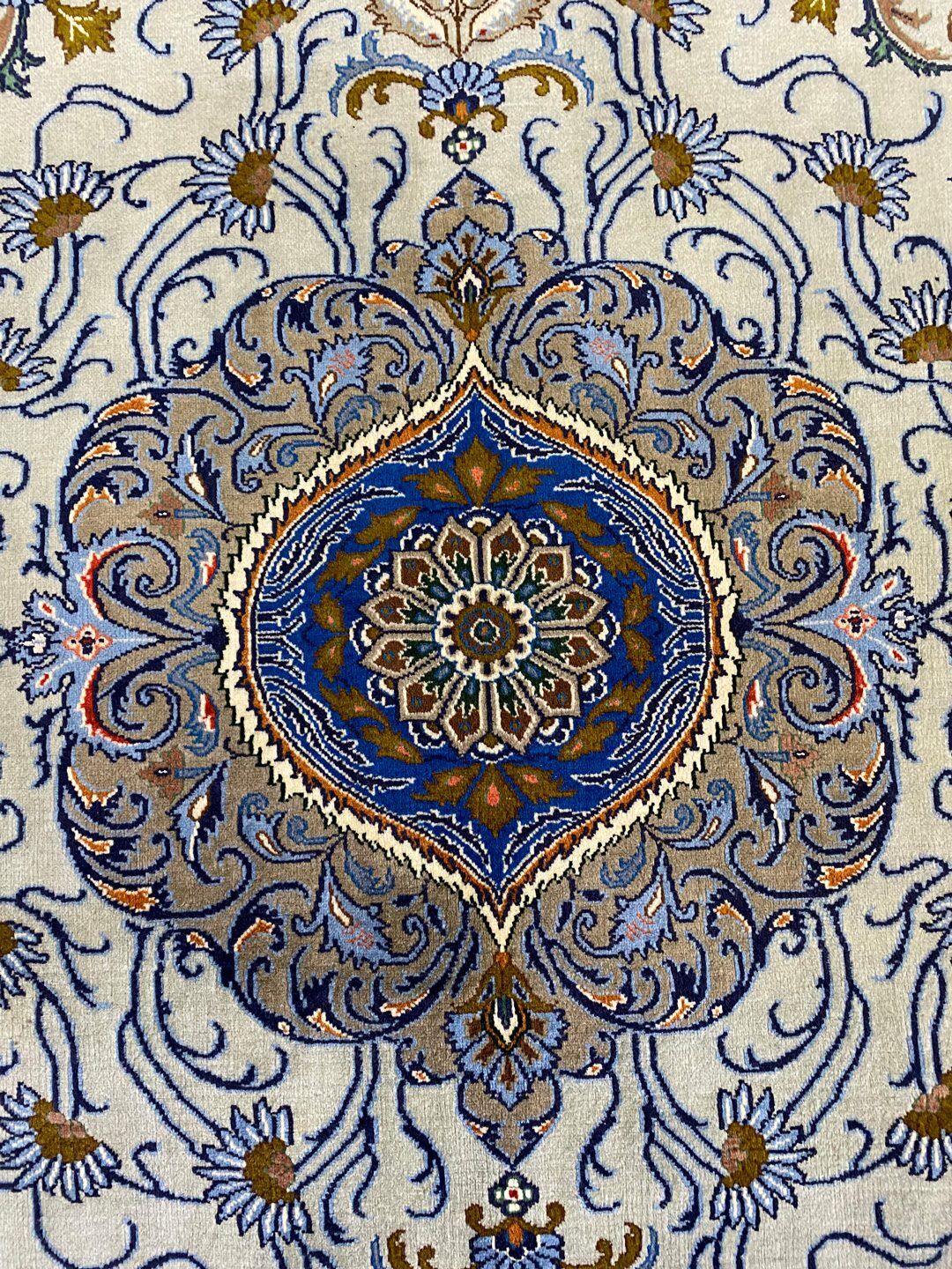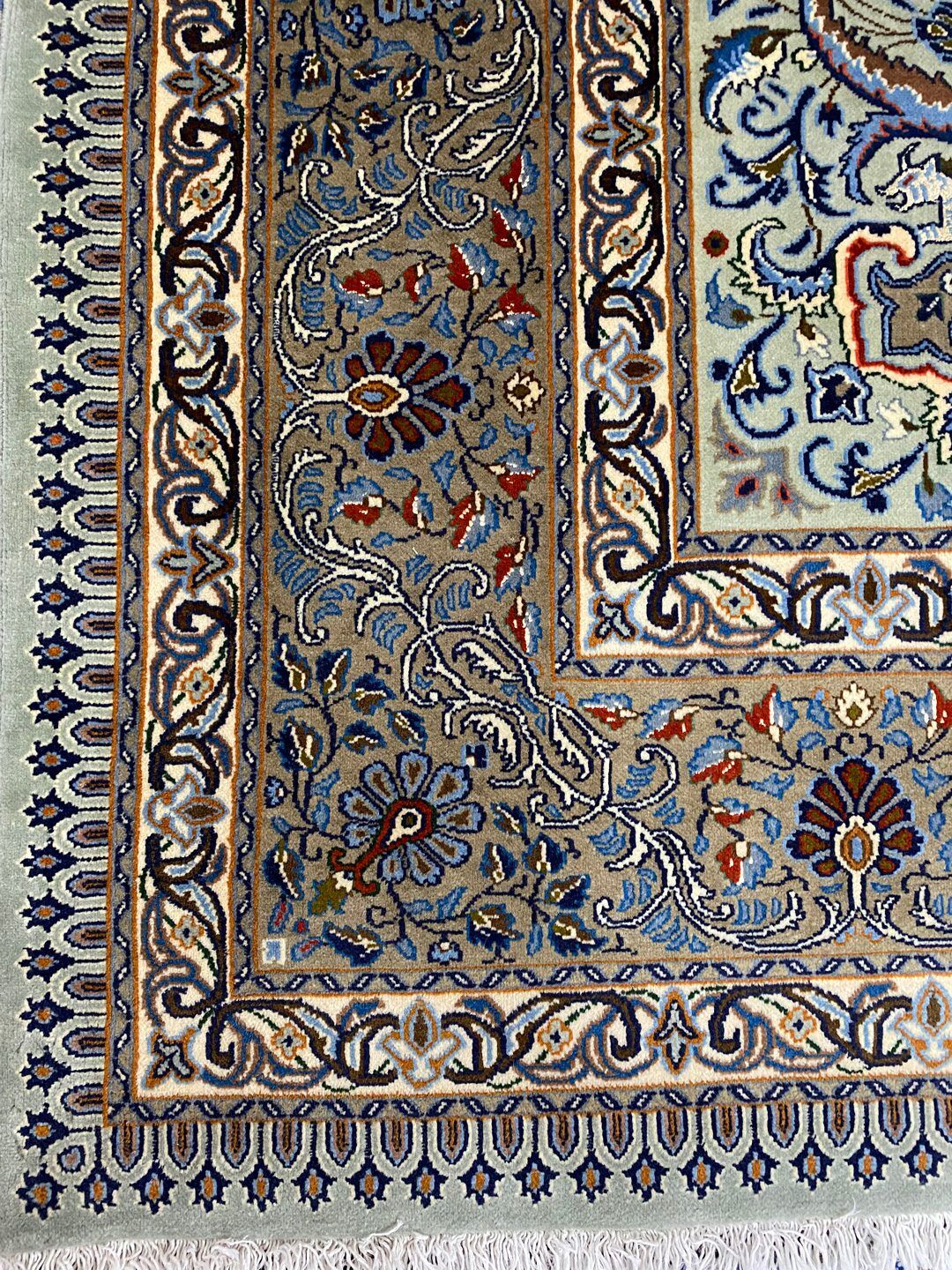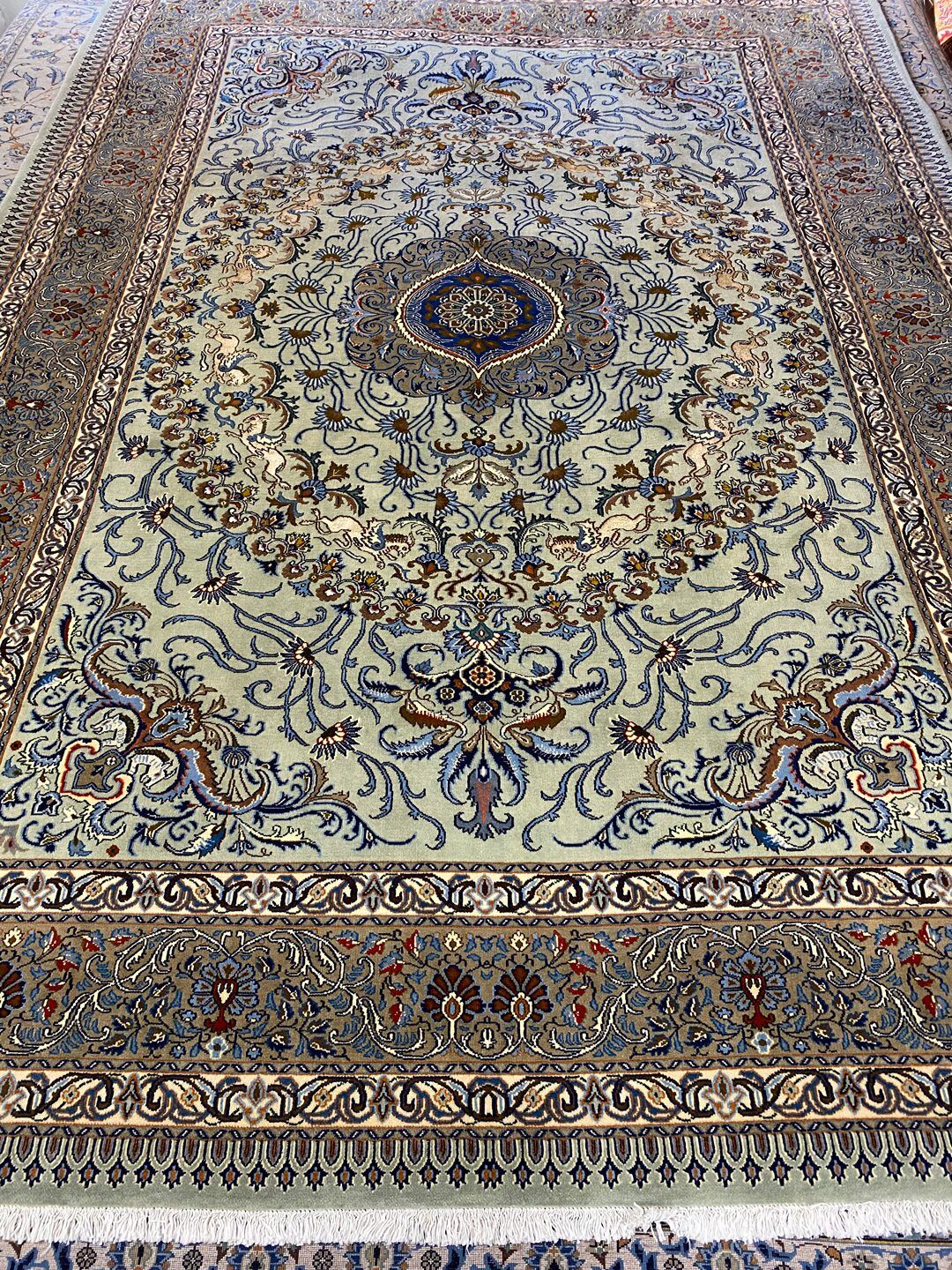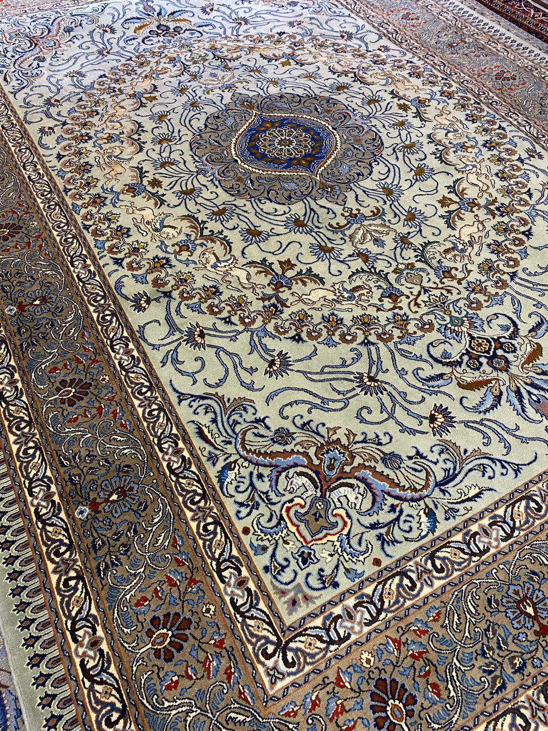 – Masterpiece Full Room Size Hand Knotted Birjand Rug: A rare find in larger sizes, featuring a pure lamb’s wool pile on fine cotton. The unique pistachio tone on the background, along with beige and blue colors dyed using traditional methods, adds to its fine quality.