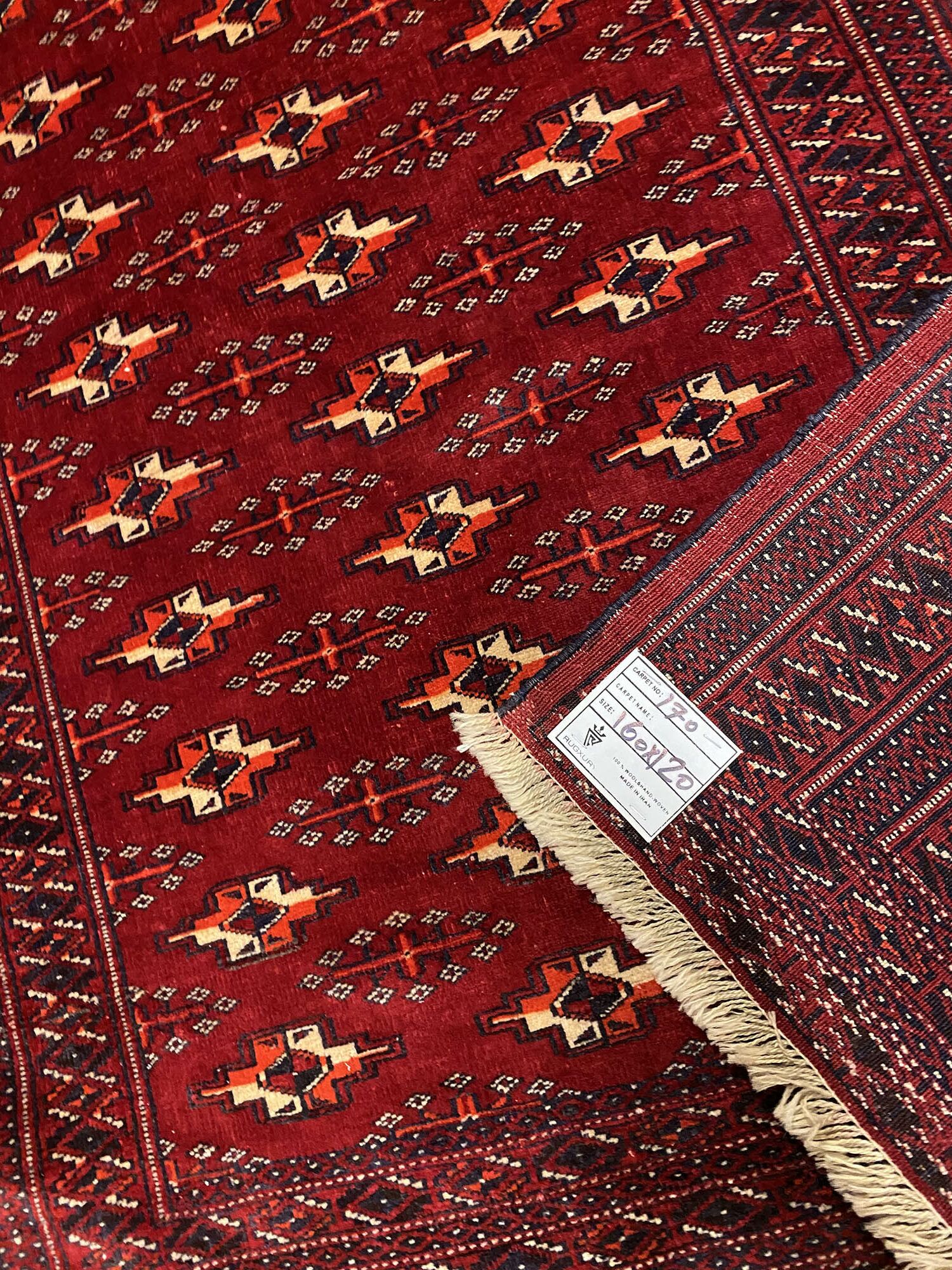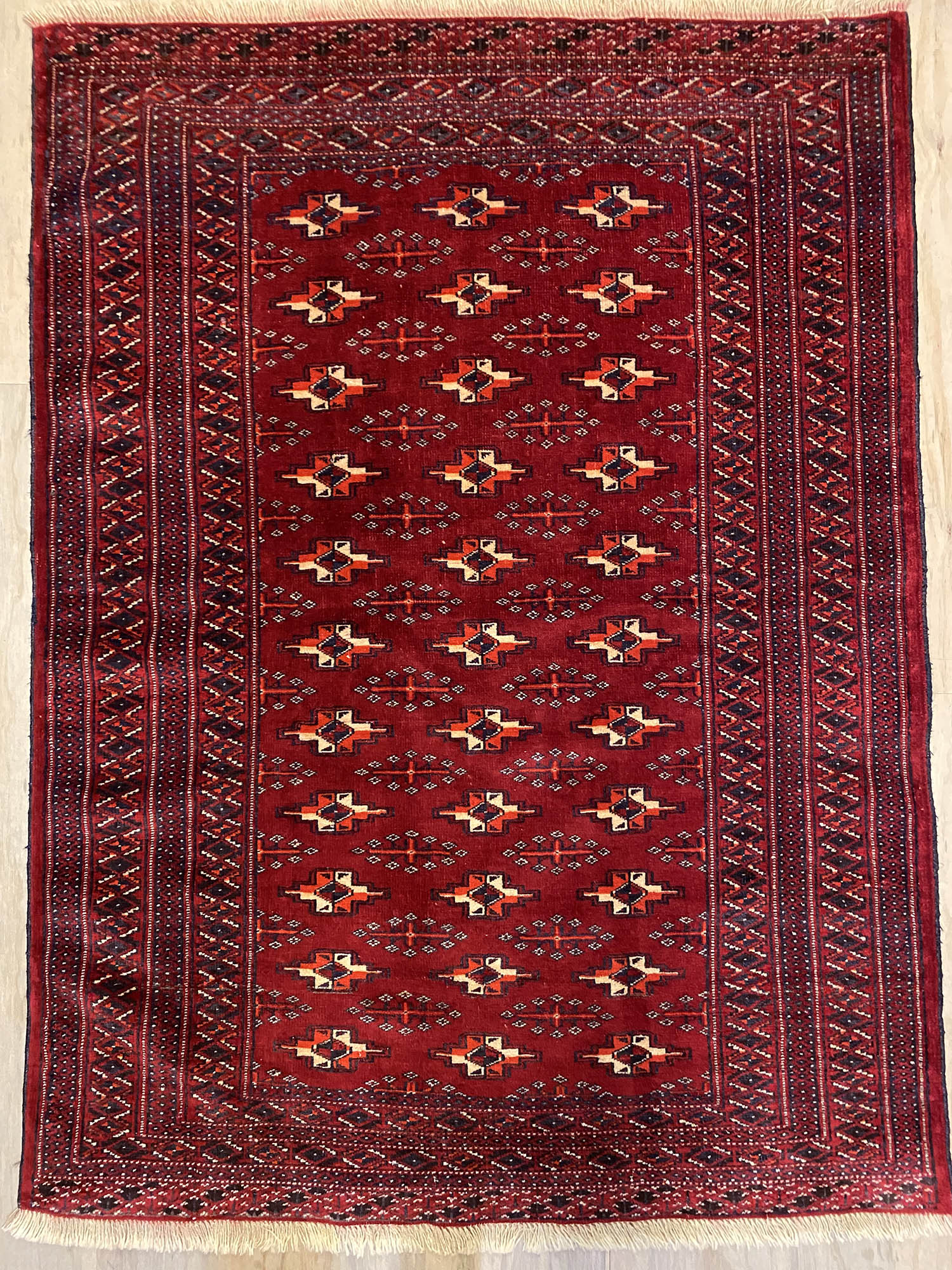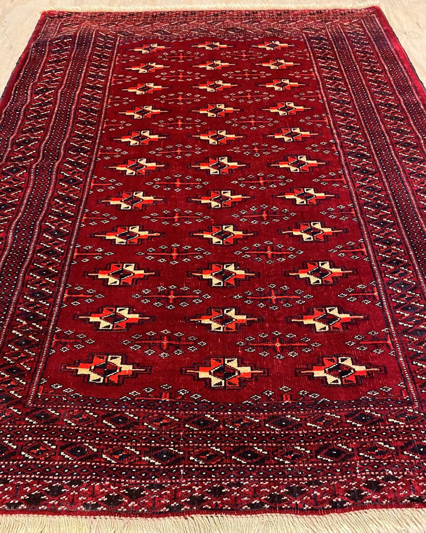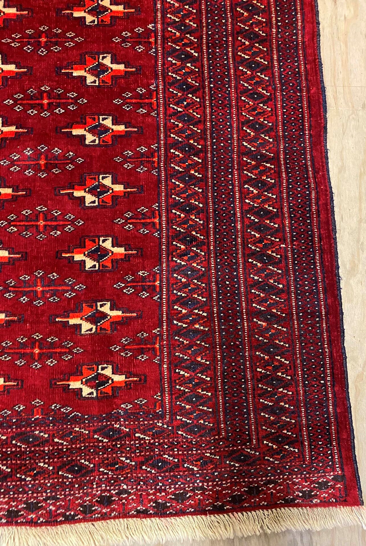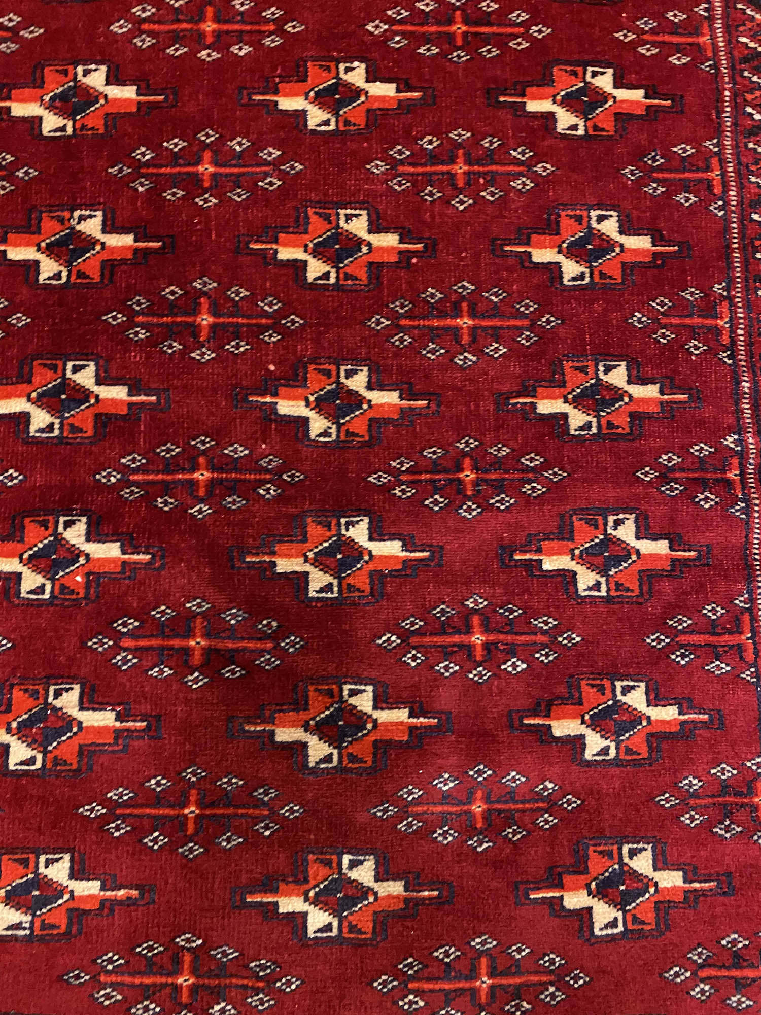 Turkmen rugs are very distinctive dominated with dark reds and repeated blue or black and ivory ‘gul’ print motifs. The wool is soft and hard-wearing and the pile is cut thin.