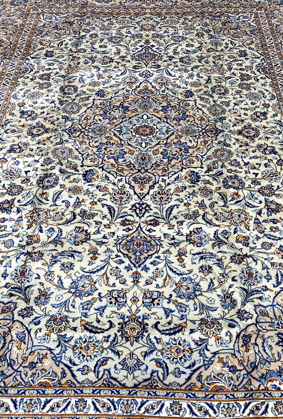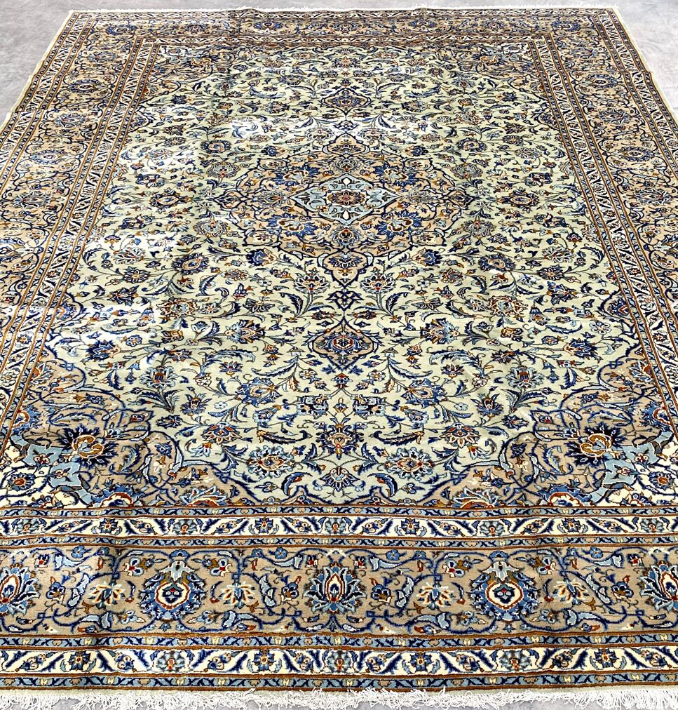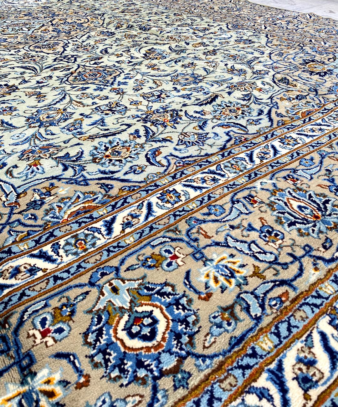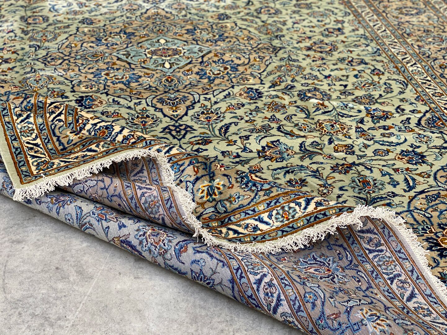 Large Room Size Authentic Persian Kashan Rug. Above All It Is Hard To Get This Quality Hand Made Rug In This Color. Pure Lamb’s Wool Pile On Cotton Base. Rare Pistachio Tones Dyed Using Traditional Methods. It Is Also Fine Quality Piece Which Would Last A Life Time.
