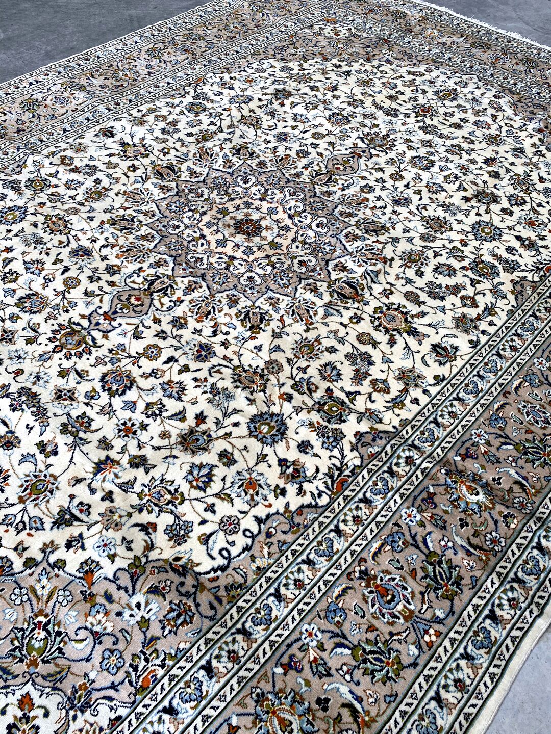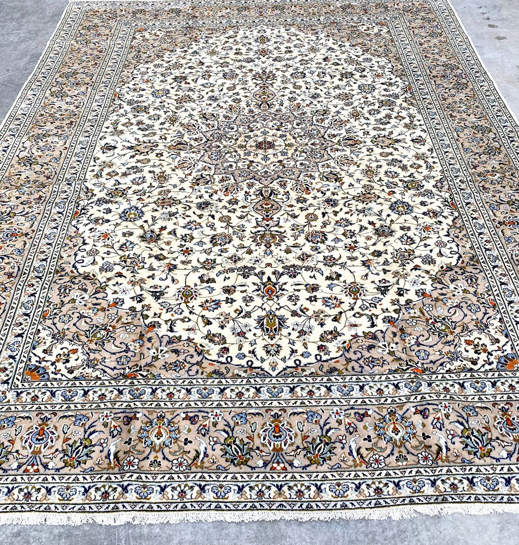 – Timeless Kashan Beauty: Immerse yourself in the elegance of this large room-size Persian Kashan rug. Handcrafted with a pure lamb’s pile on a cotton base, it features a classic beige color dyed using traditional methods.