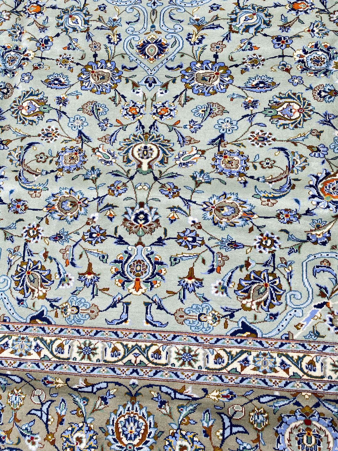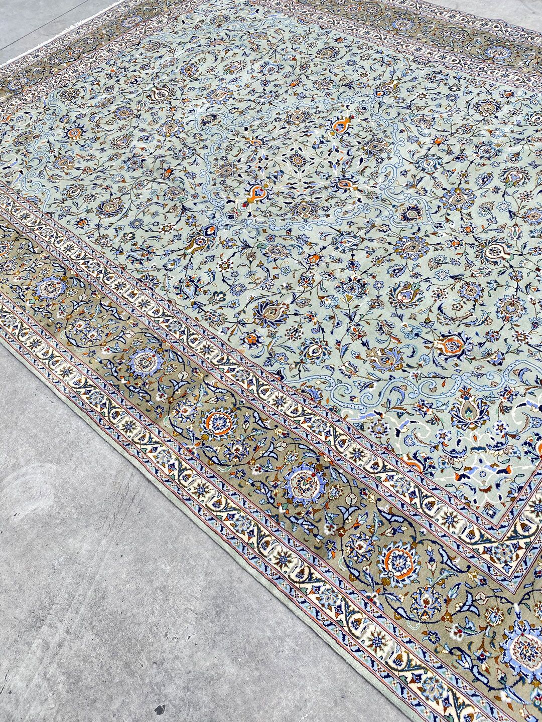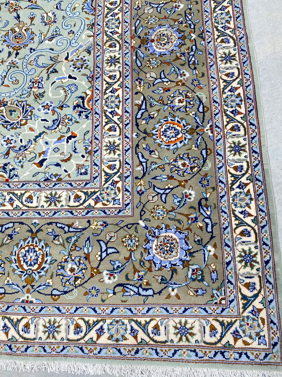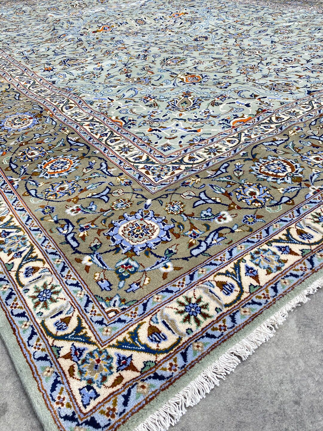 Large Room Size Authentic Persian Kashan Rug. Above All It Is Hard To Get This Quality Hand Made Rug In This Colour. Pure Lamb’s Wool Pile On Cotton Base. Rare Pistachio Tones Dyed Using Traditional Methods. It Is Also Fine Quality Piece Which Would Last A Life Time.