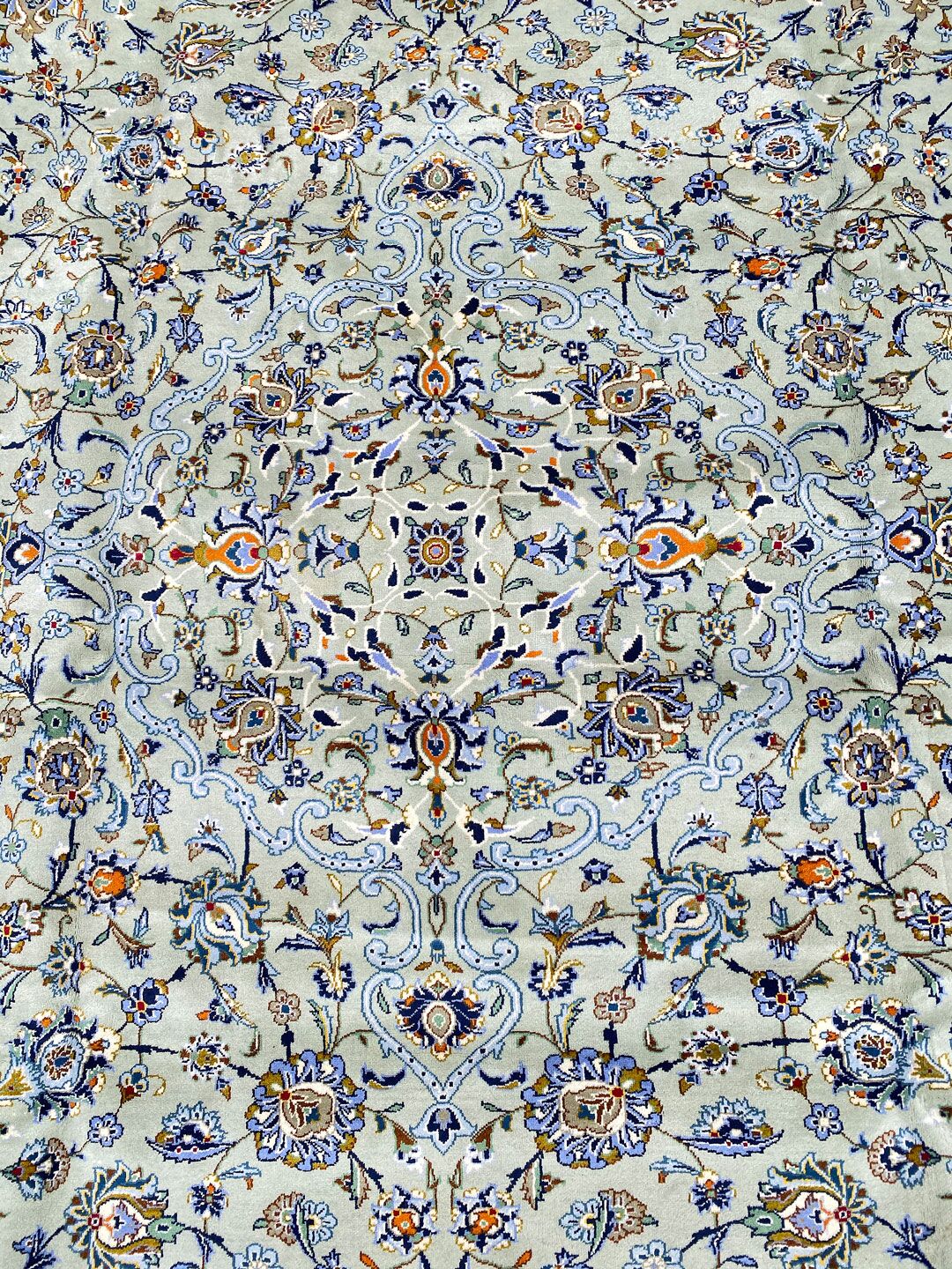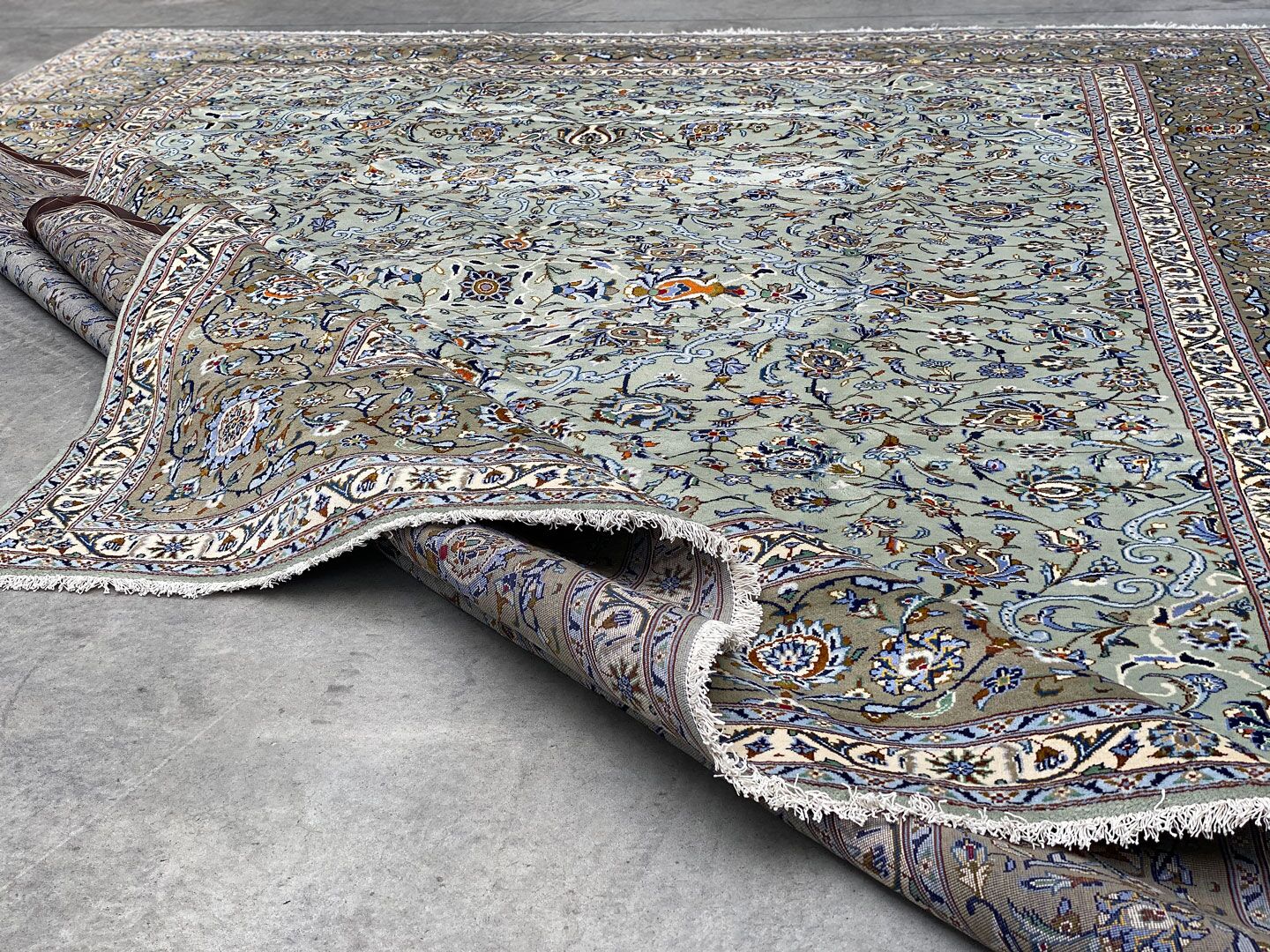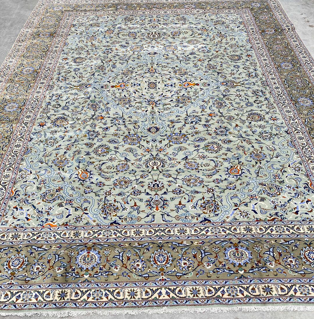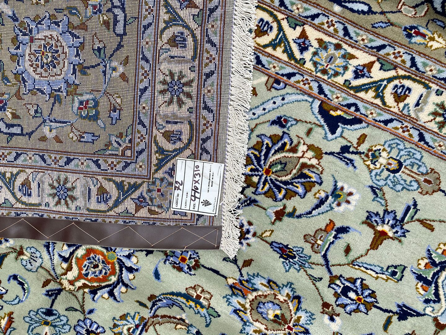 Large Room Size Authentic Persian Kashan Rug. Above All It Is Hard To Get This Quality Hand Made Rug In This Colour. Pure Lamb’s Wool Pile On Cotton Base. Rare Pistachio Tones Dyed Using Traditional Methods. It Is Also Fine Quality Piece Which Would Last A Life Time.