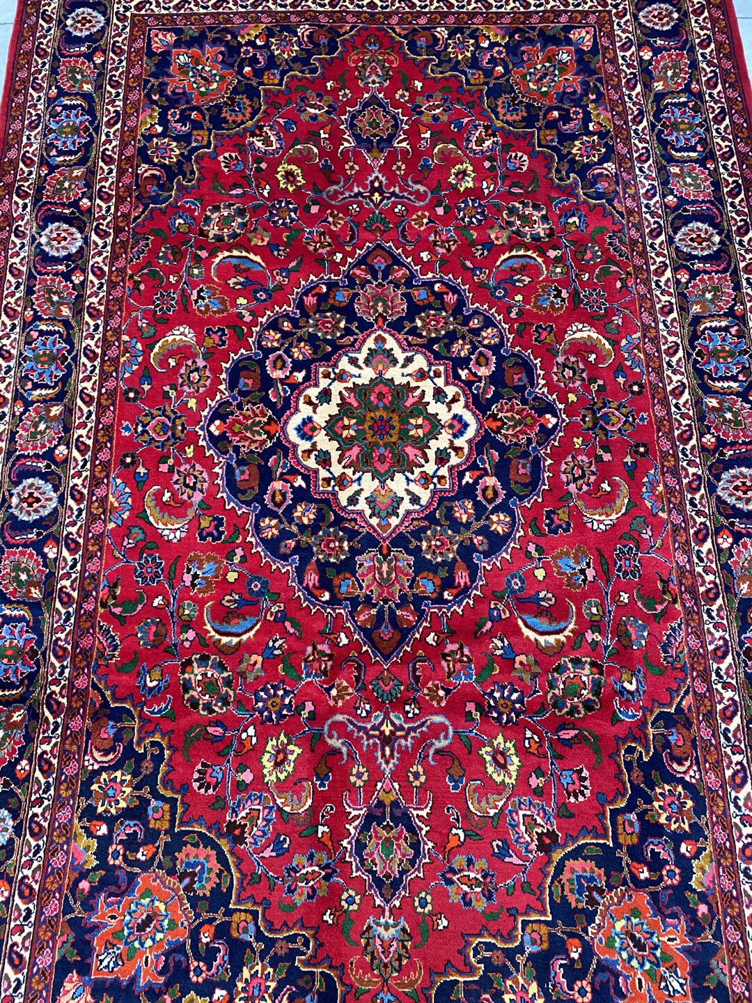 – Origin: This stunning room-size authentic Signed Persian Mashad rug is a certified hand-knotted masterpiece. Crafted with pure lamb’s pile on a cotton base, it features a stunning burgundy/red and indigo blue tone dyed using traditional methods.
