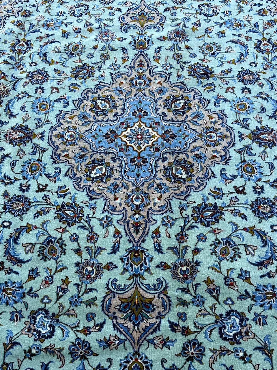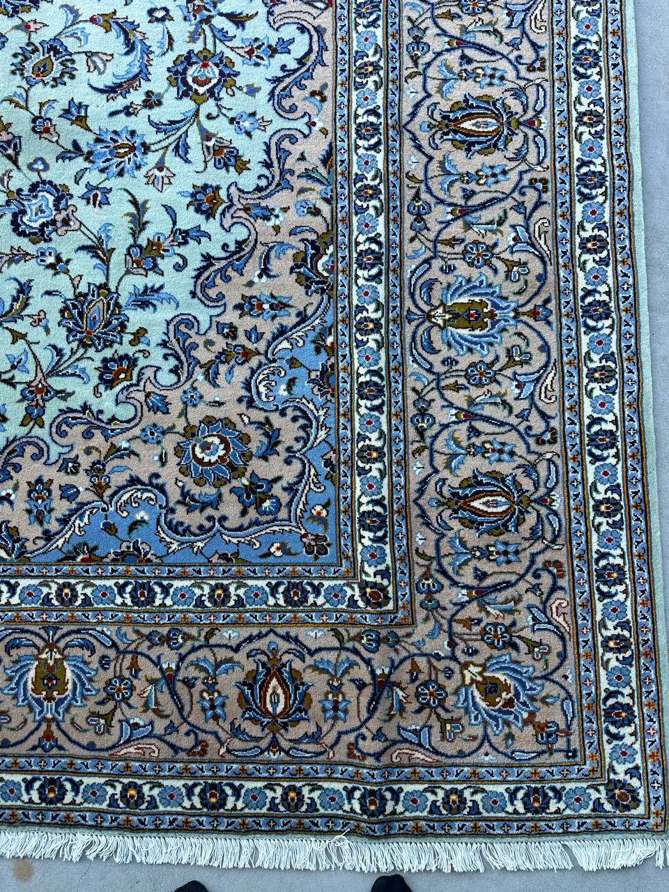 – Timeless Elegance: Immerse your space in the timeless elegance of this certified hand-knotted Persian Kashan rug. A room size authentic handmade piece with a pure lamb’s pile on a cotton base, featuring a classic Pistachio background dyed using traditional methods.