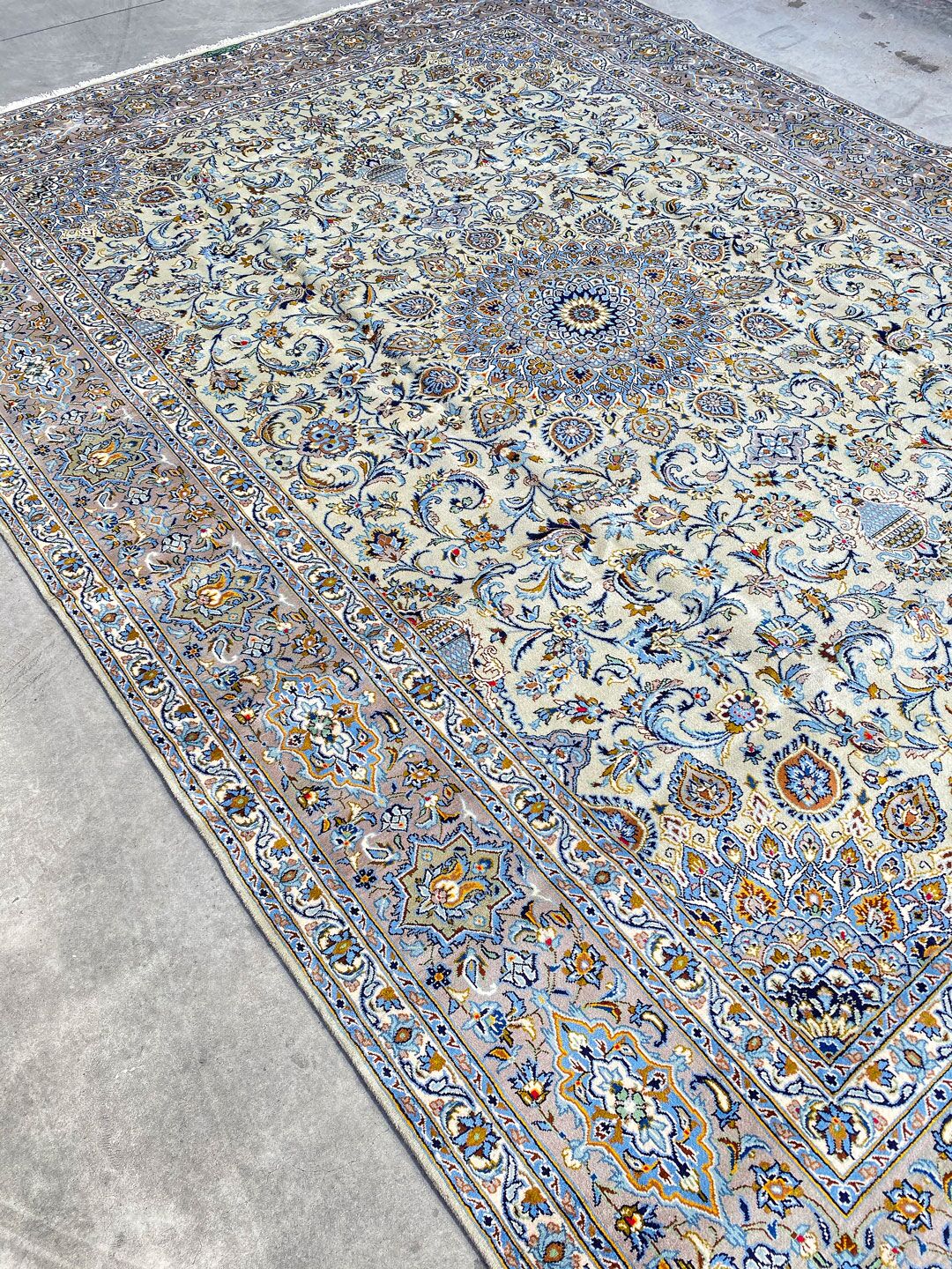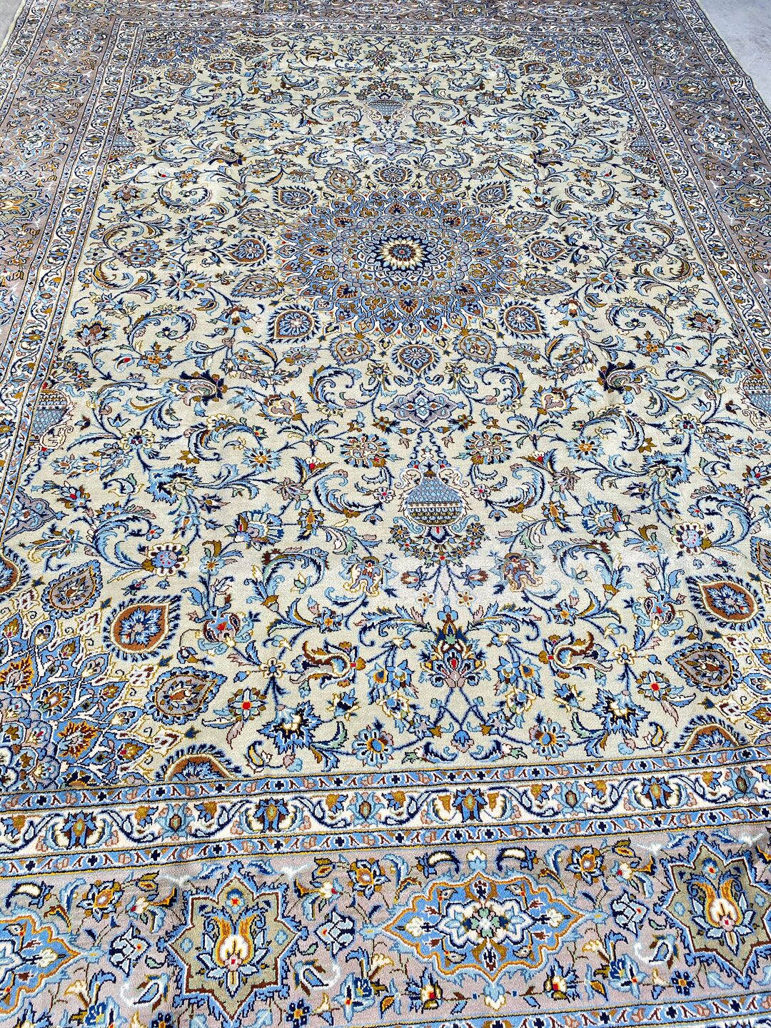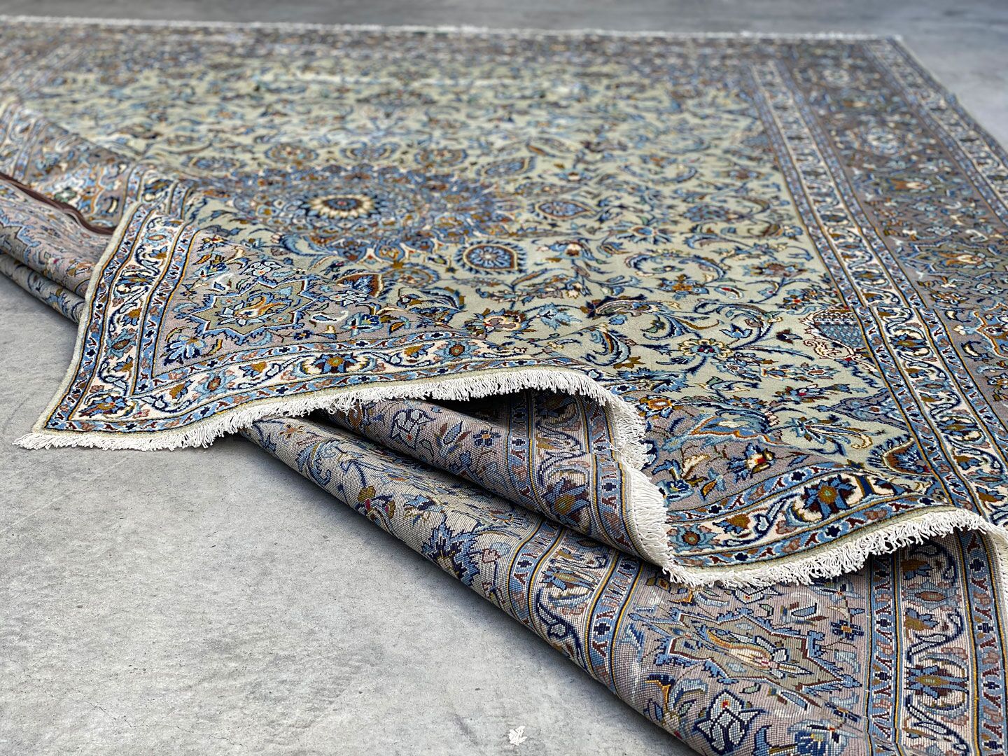 Large Room Size Authentic Persian Kashan Rug. Above All It Is Hard To Get This Quality Hand Made Rug In This Color. Pure Lamb’s Wool Pile On Cotton Base. Rare Pistachio Tones Dyed Using Traditional Methods. It Is Also Fine Quality Piece Which Would Last A Life Time.