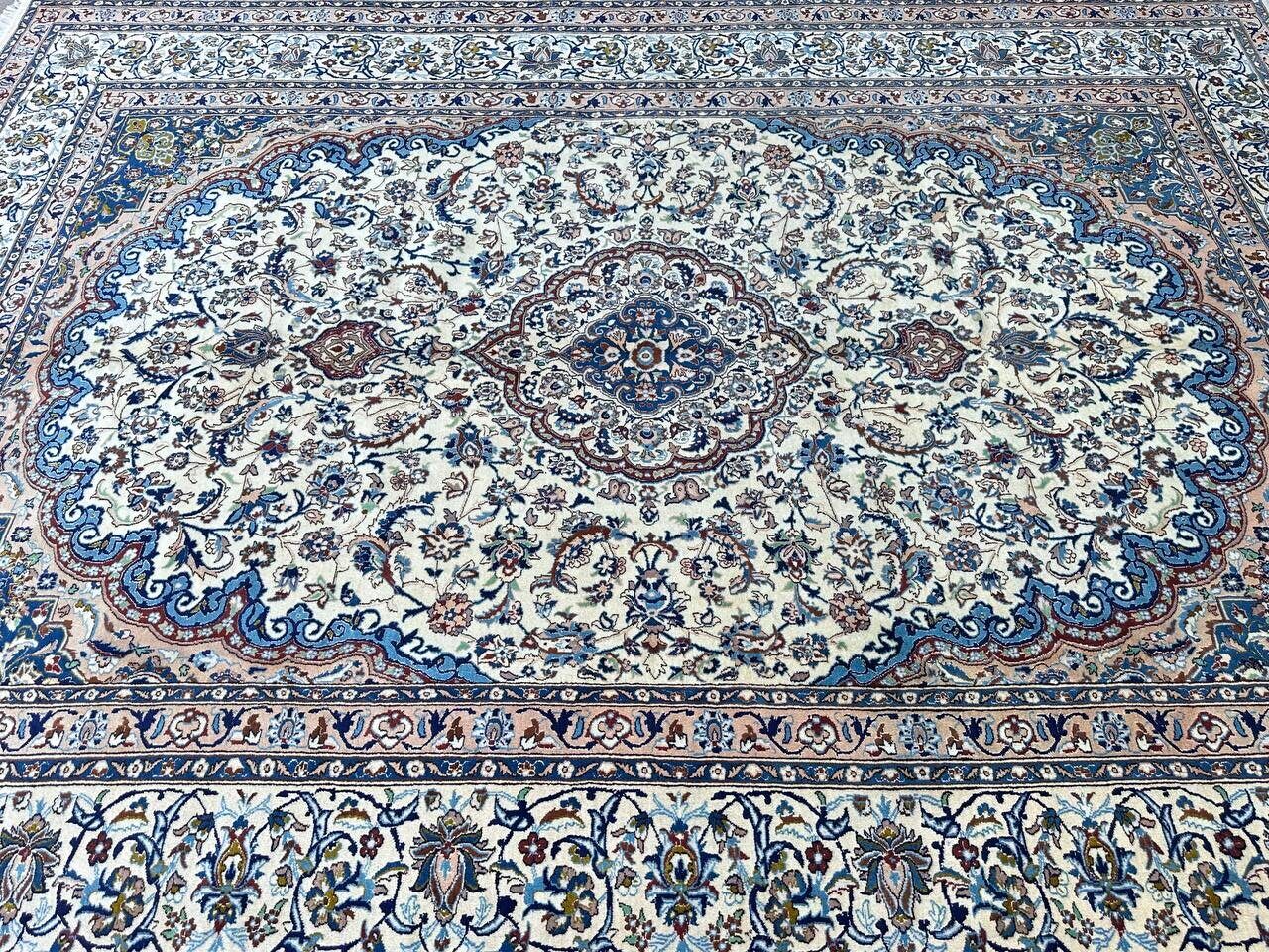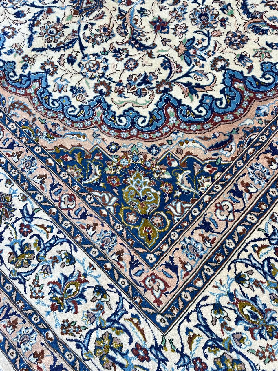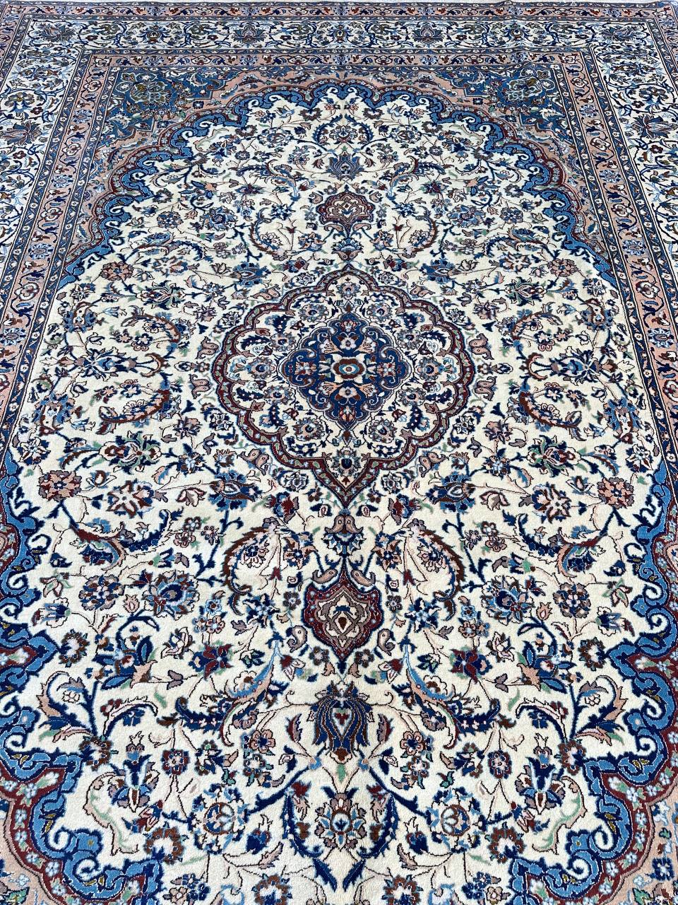 – Elegance Redefined: Immerse your space in the exquisite design of this room-size authentic Persian Nain carpet. Lamb’s wool and silkinlay pile on a cotton base create a luxurious feel, with French blue tones dyed using traditional methods.