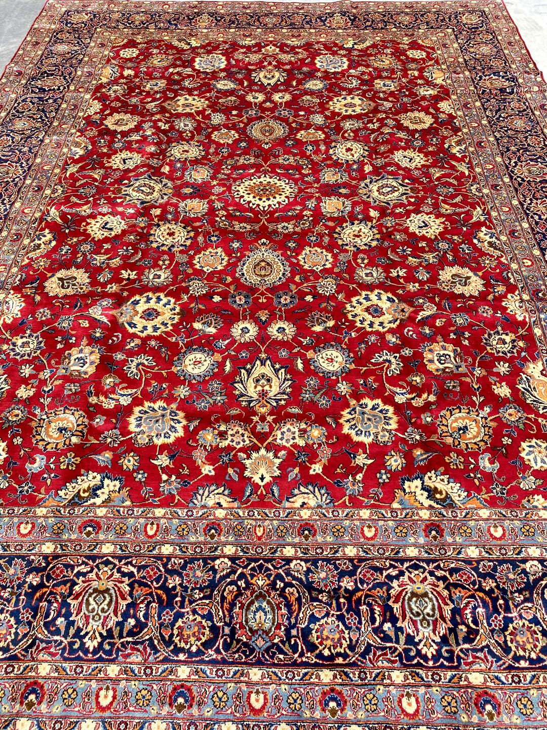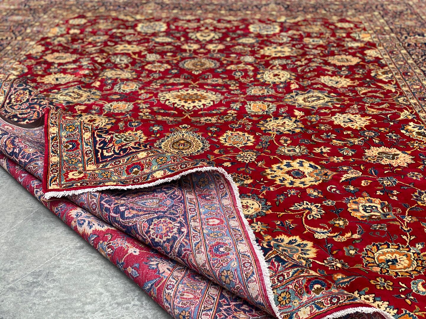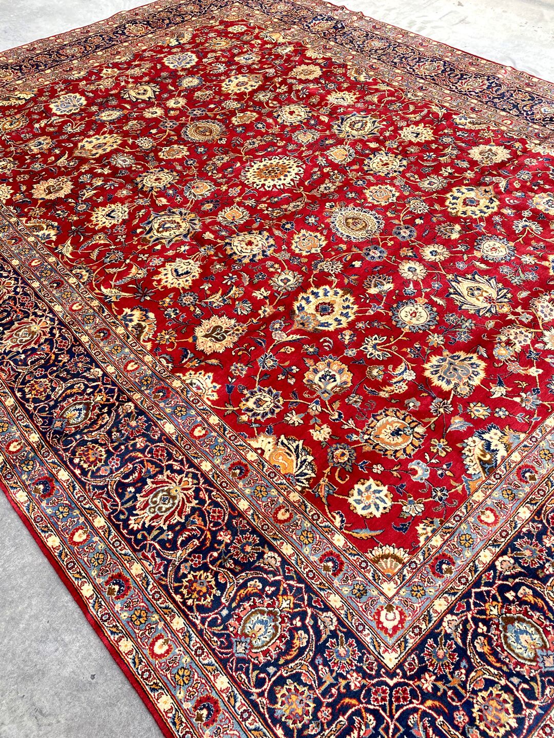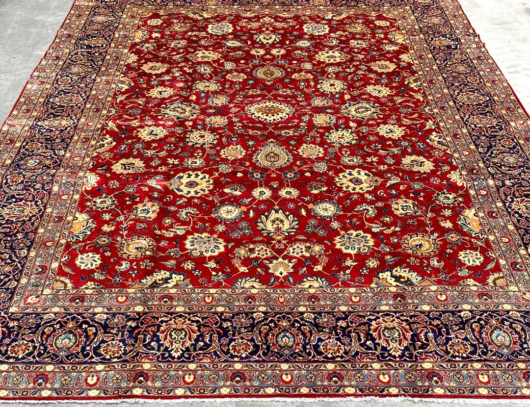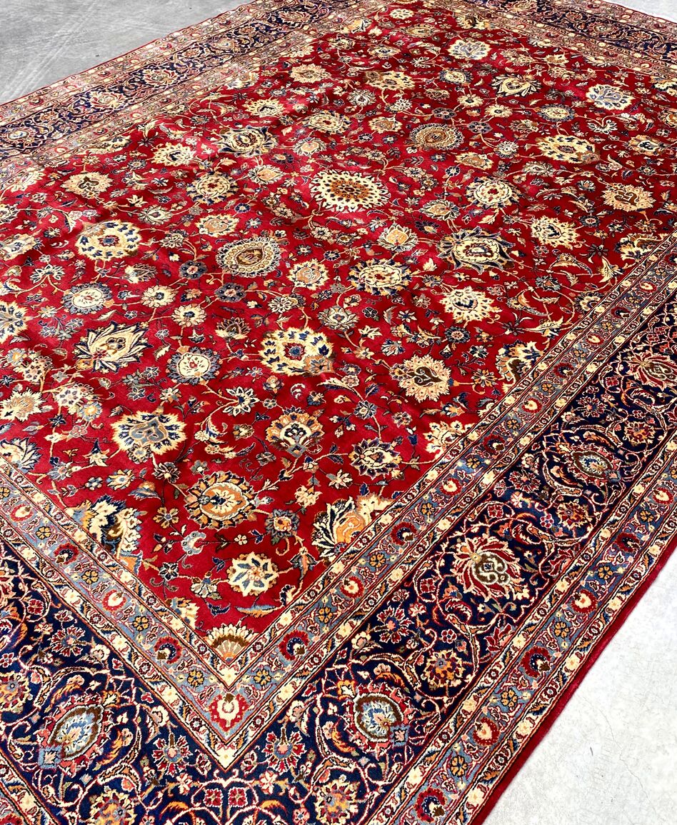 Antique Kashan Rug Dyed Using Traditional Methods.Above All Kashan Is One of The Most Famous City Of Ancient Persia. The City Produces Some of The Finest Of Hand Woven Carpets. Beautiful Massive Room Size Rug. It Also Has A Pure Lamb’s Pile On Cotton Base. It Is A Life Time Piece Which Will Become The Antique Of Tomorrow.