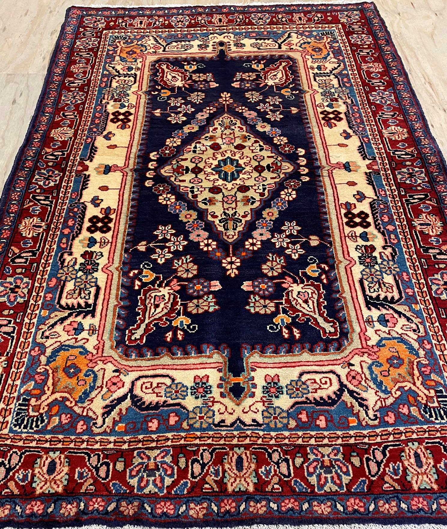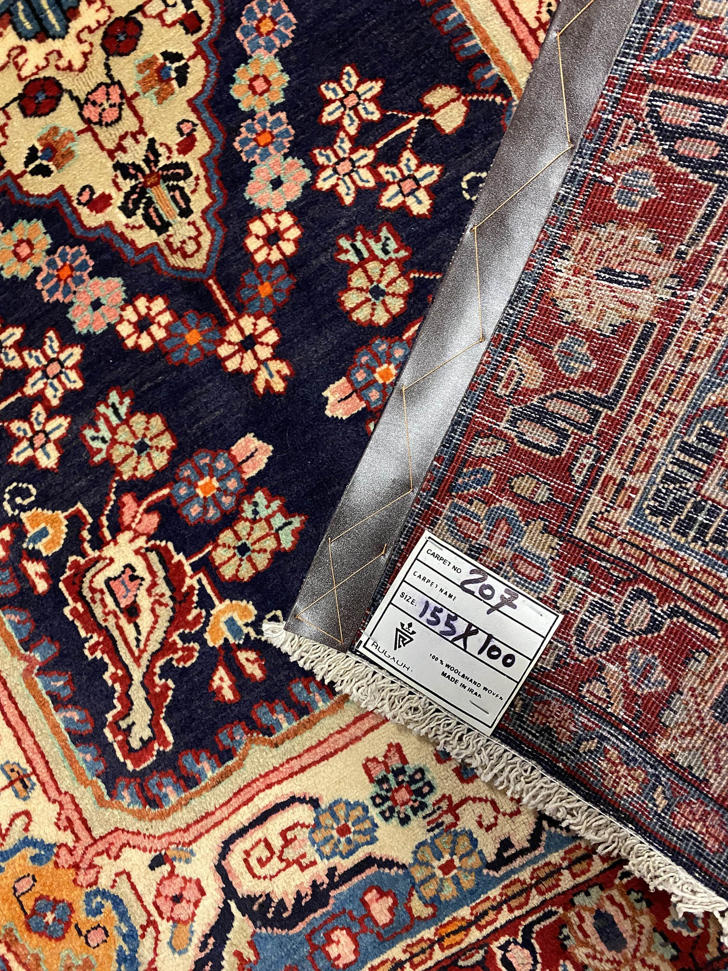 – Origin: This authentic Persian Sarough rug features an intricate arabesque design, showcasing the rich cultural heritage of Central Persia, specifically the Sarough region. Crafted with pure lamb’s wool pile on a cotton base, this rug is a fine quality piece with a blue and beige background dyed using traditional methods.