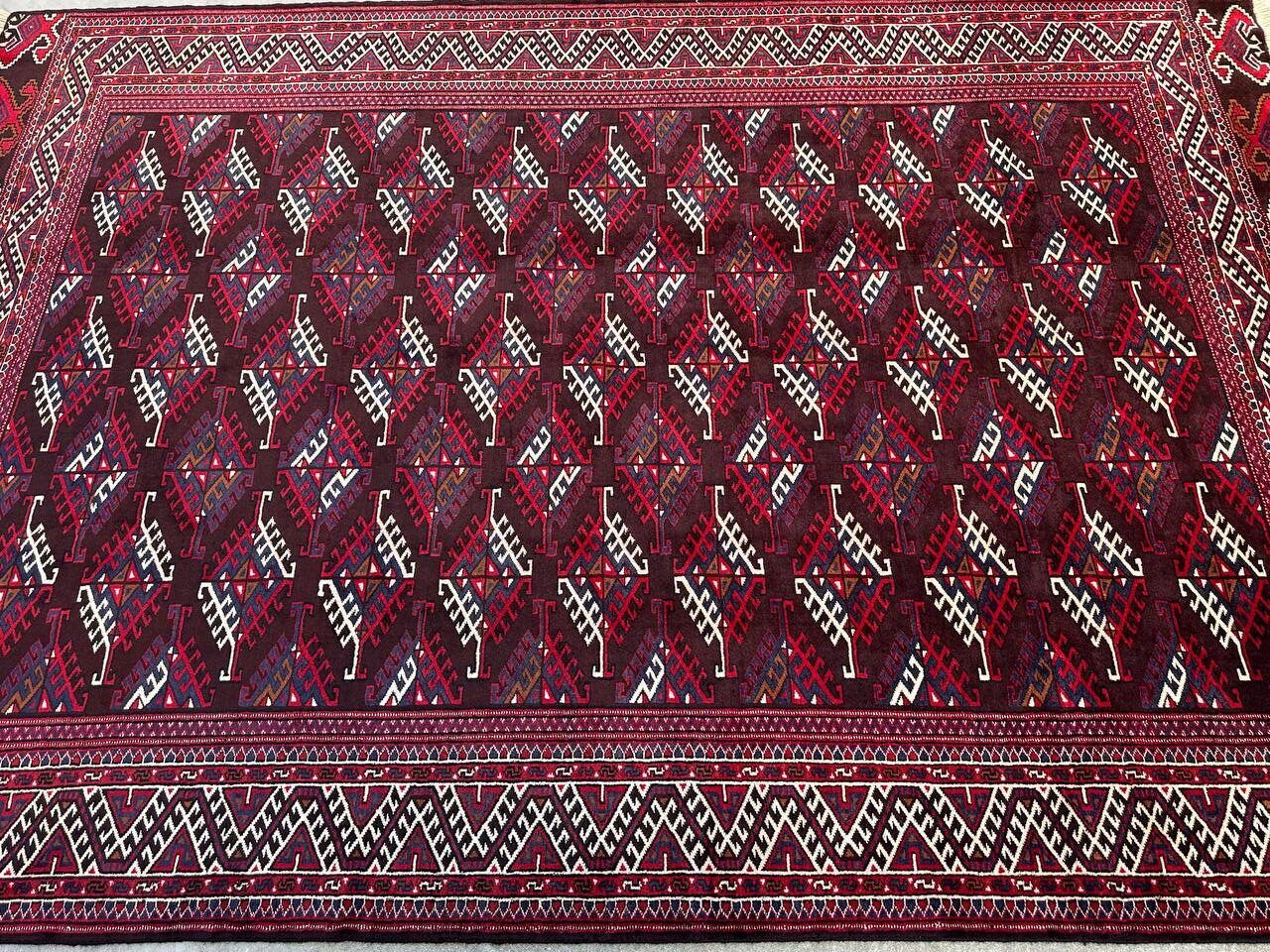 – Tribal Elegance: Immerse your space in the tribal elegance of this room-size hand-knotted Turkoman rug. Crafted with pure hand-spun wool pile on a cotton base, it features a red and brown tone dyed using traditional methods.