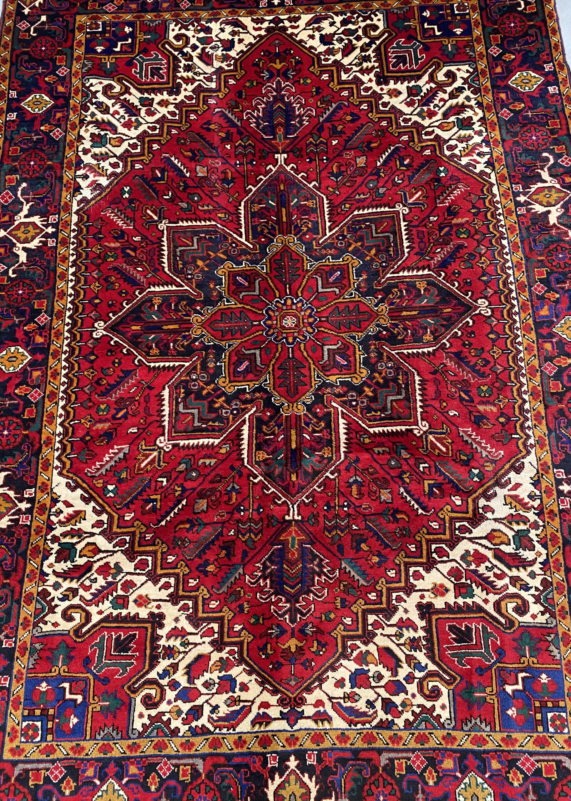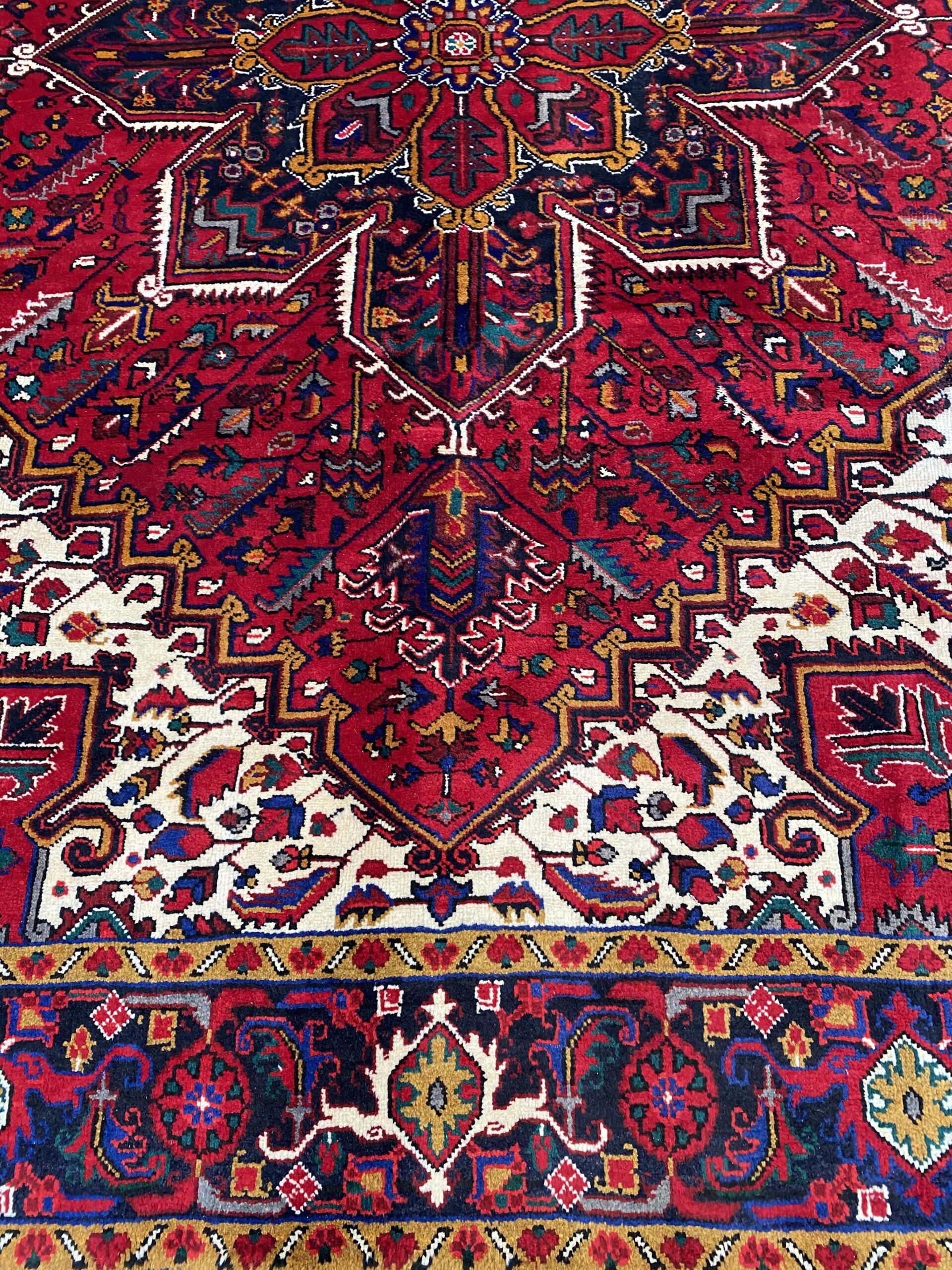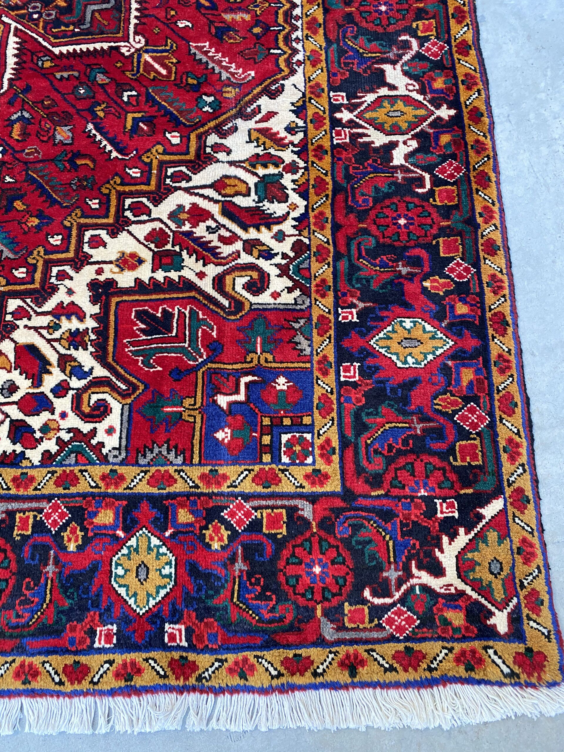 Rare Vintage Full Room Size Double Knotted Persian Heriz Rug. Above All It Is Hard To Find This Quality Hand Made Carpet From This Region. It Also Has A Pure Wool Pile On Cotton Base. Vibrant Tones Dyed Using Traditional Methods.