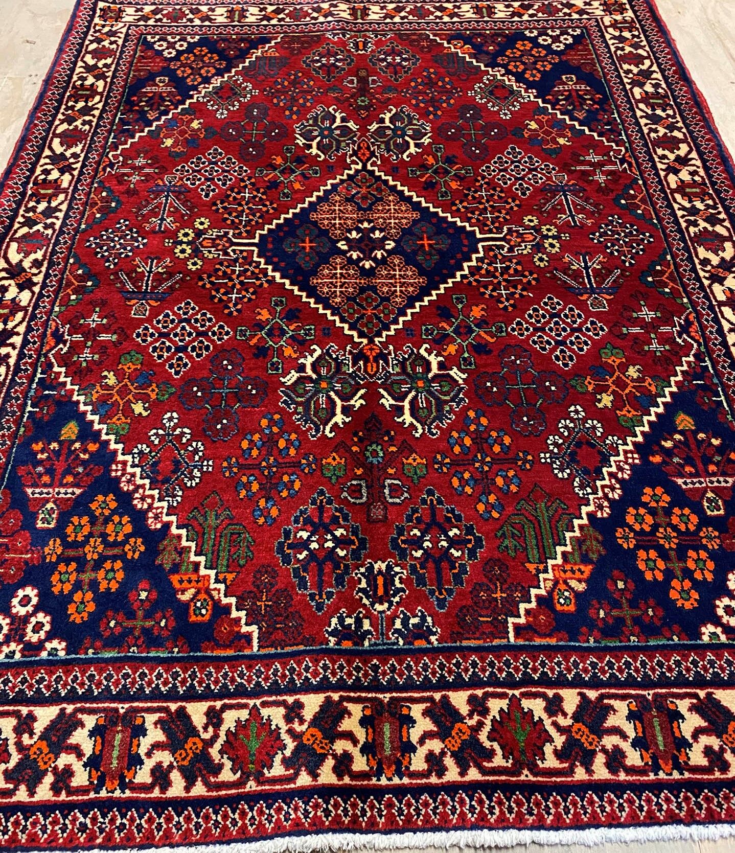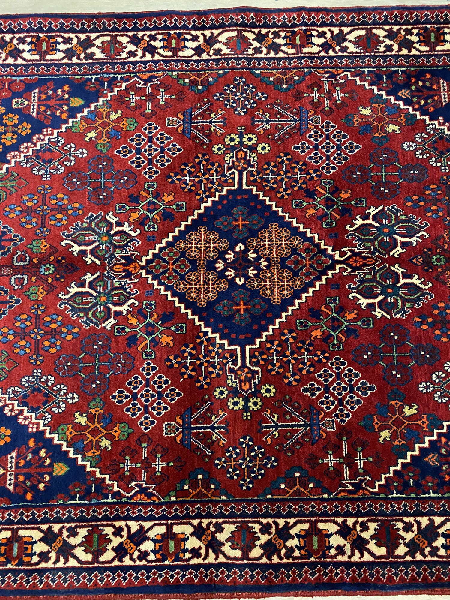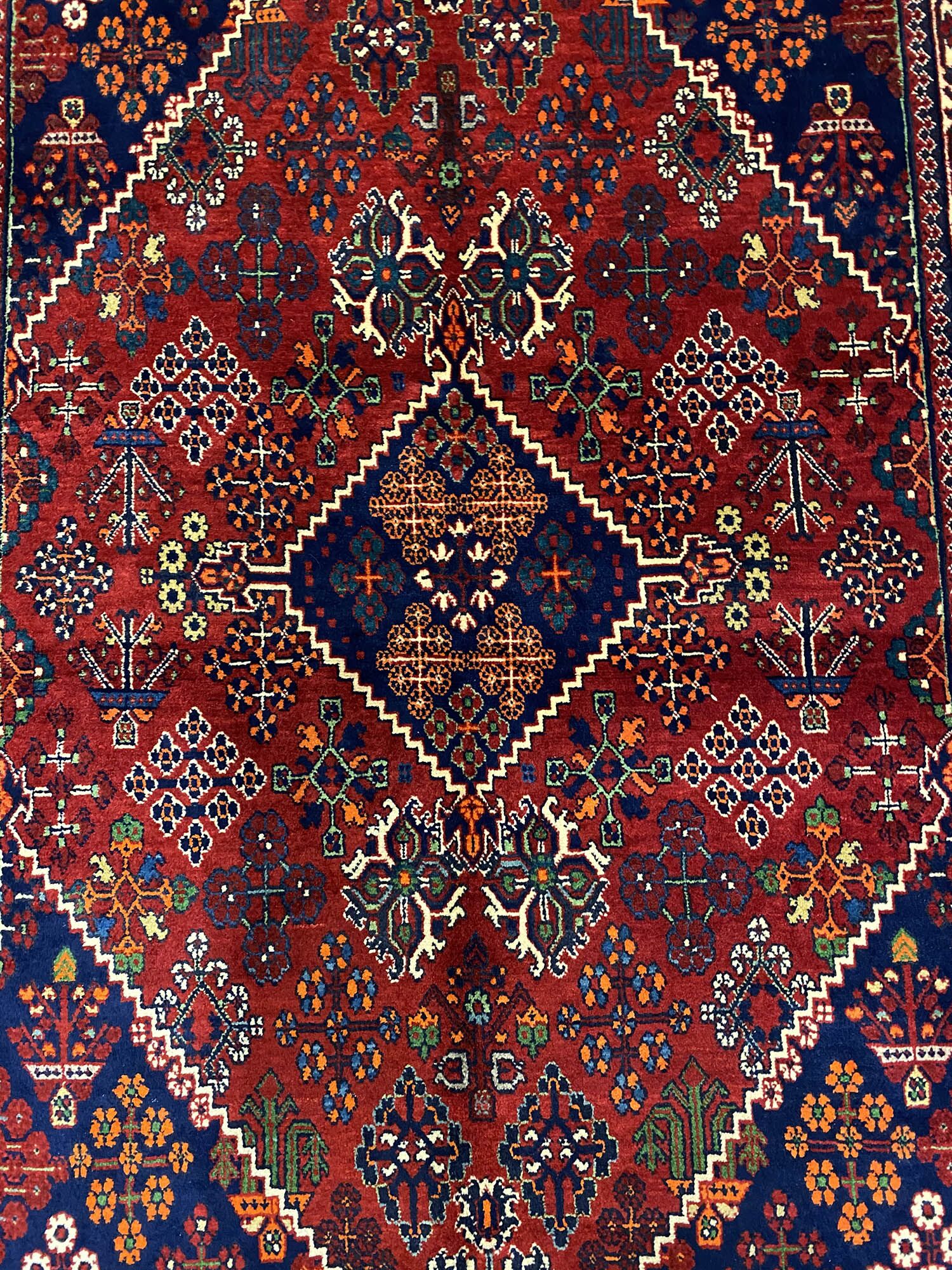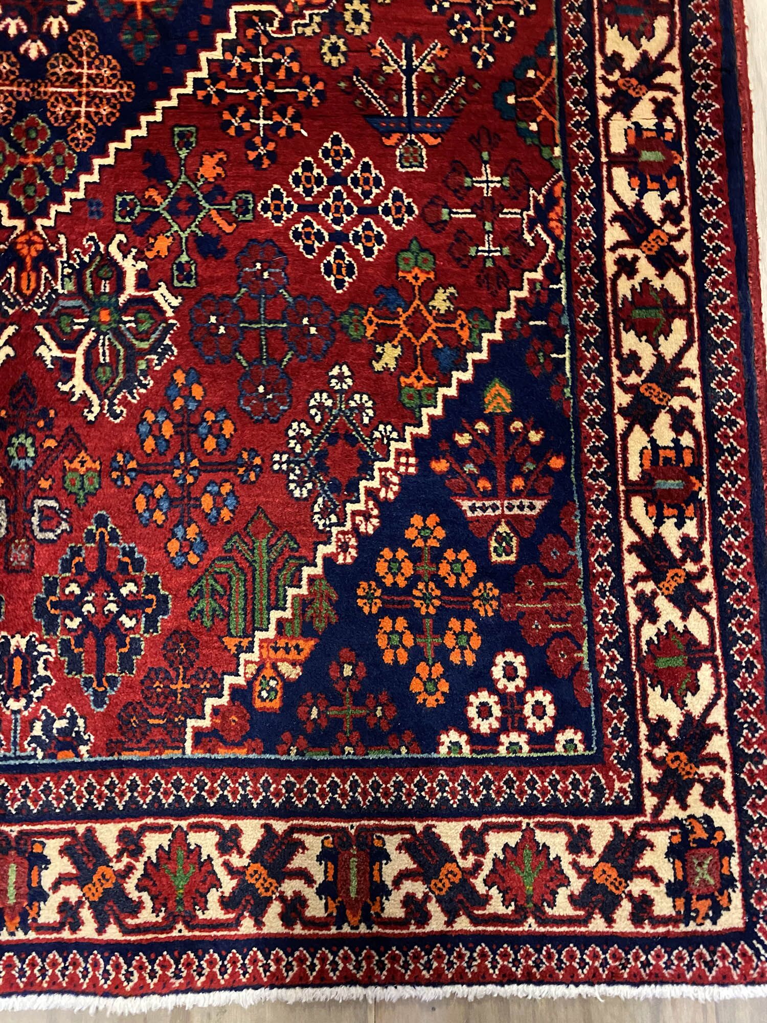 – Certified Hand Knotted Persian Joshaghan Rug: A rare find, this Persian Joshaghan Carpet is a unique piece with a pure wool pile on a cotton base. The tomato red tones are dyed using traditional methods.