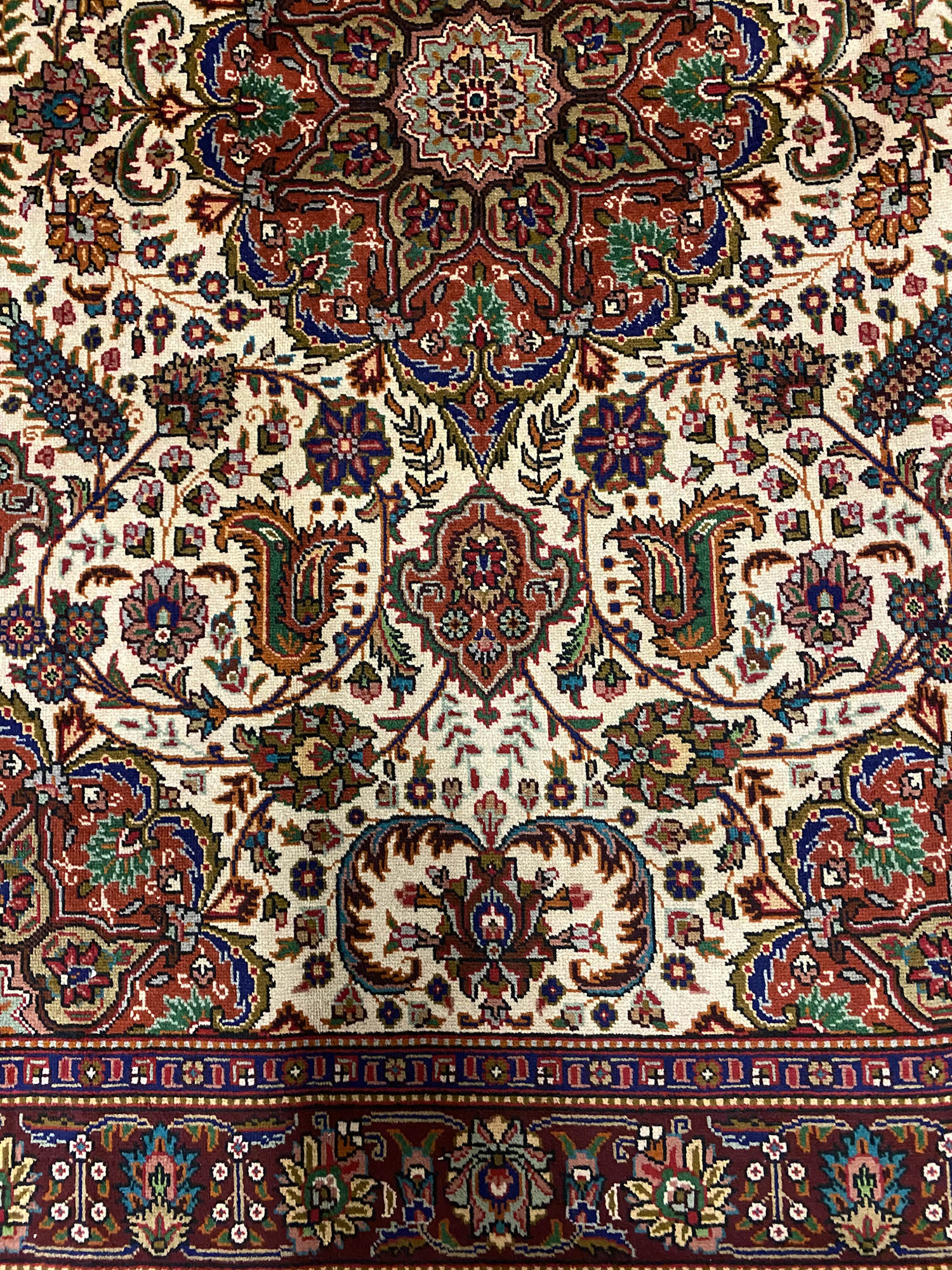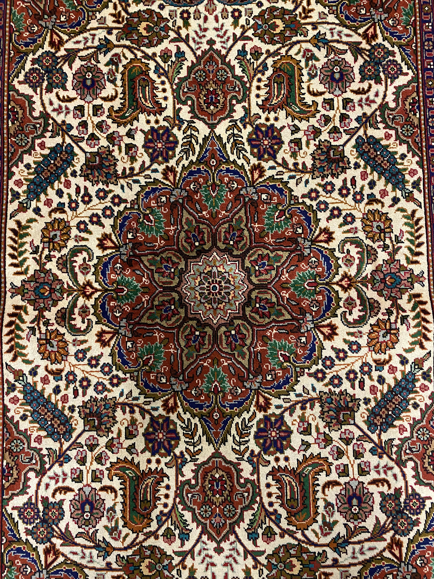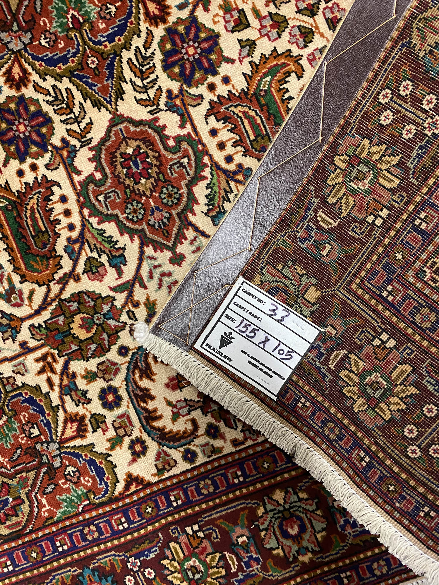 – Background: Admire the unique Brown, beige background, dyed using traditional methods with a double-knotted weave.